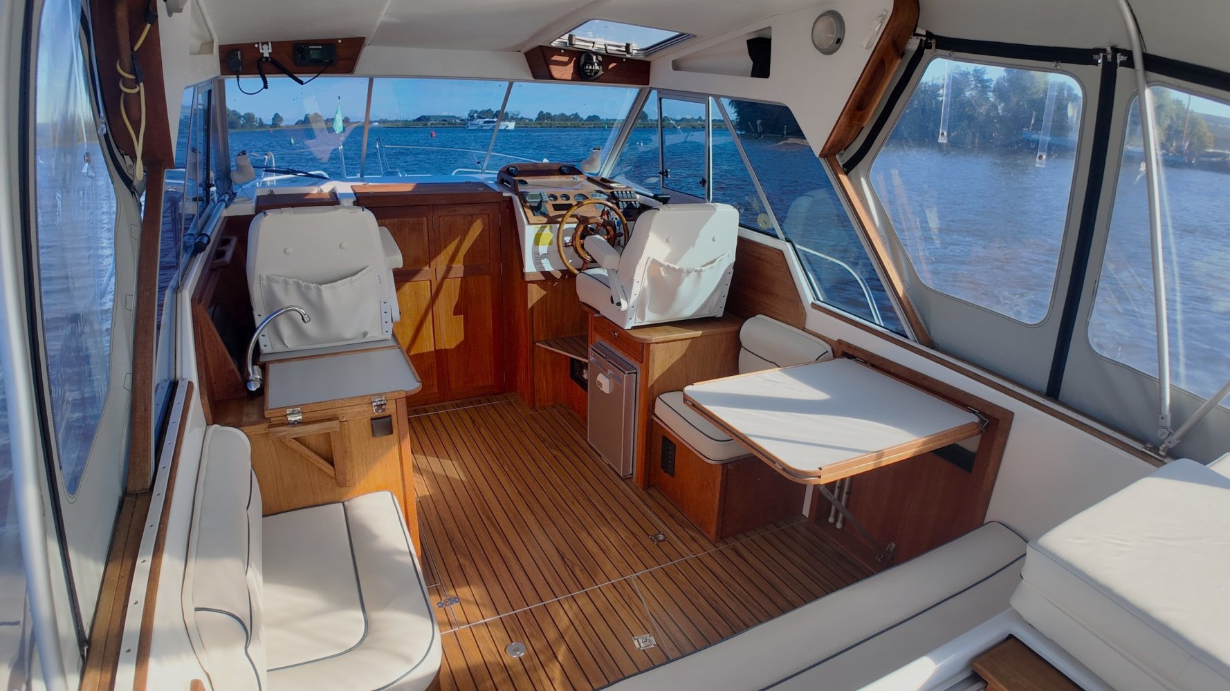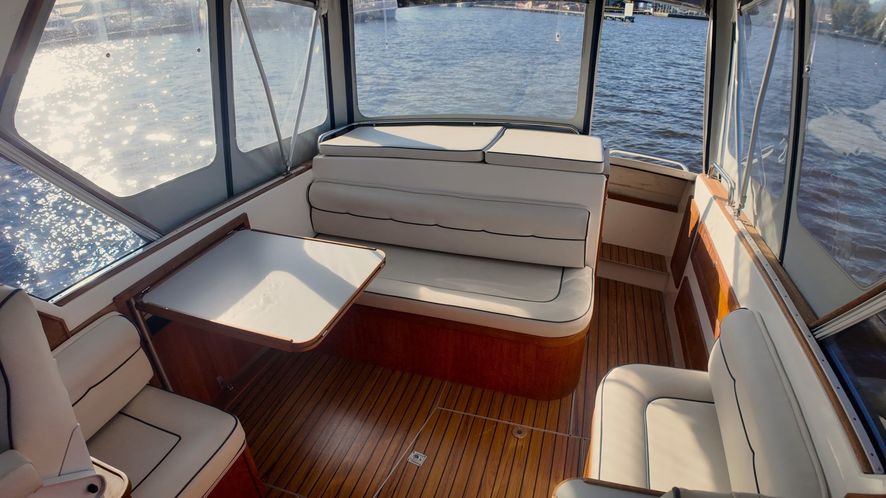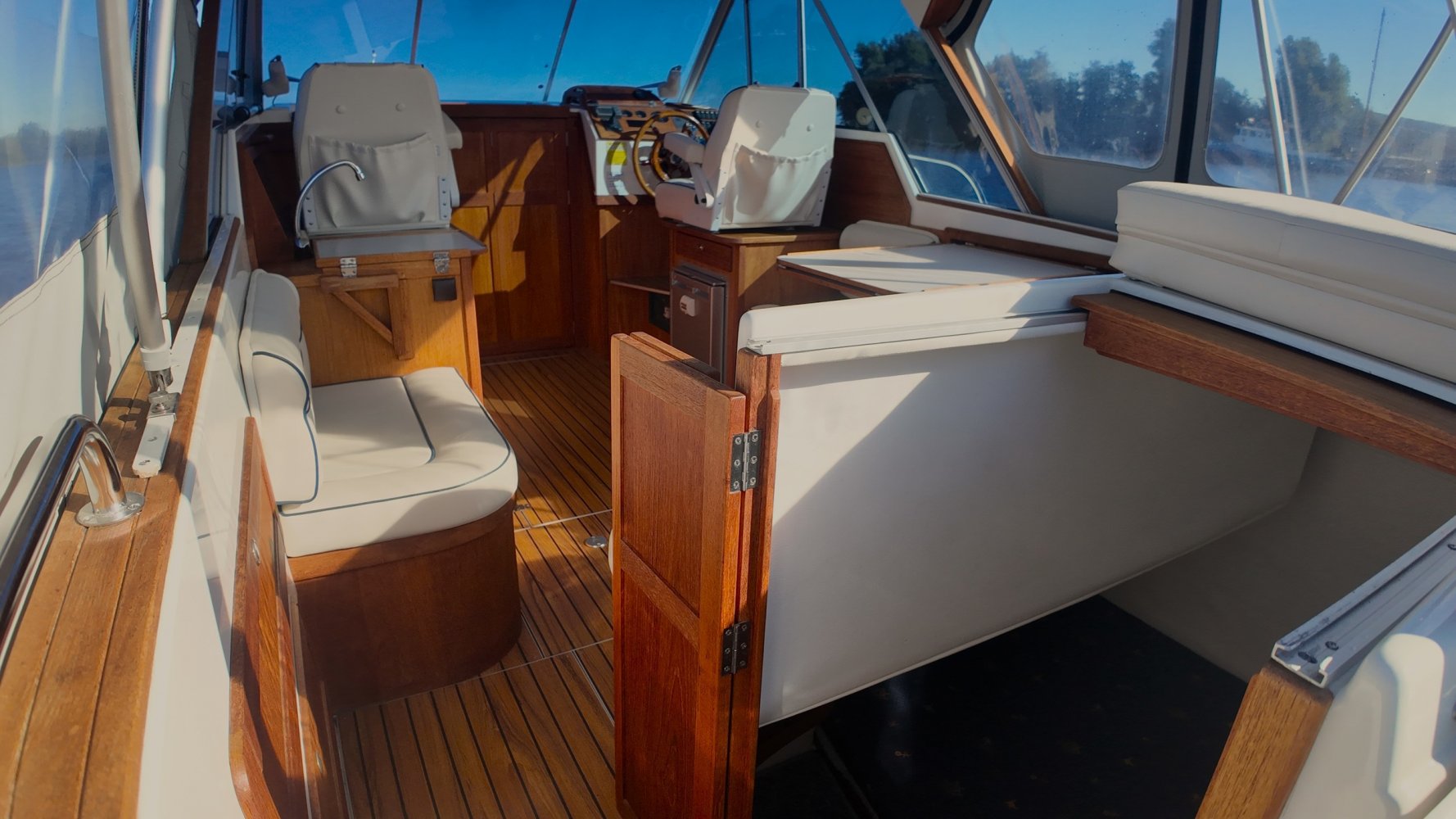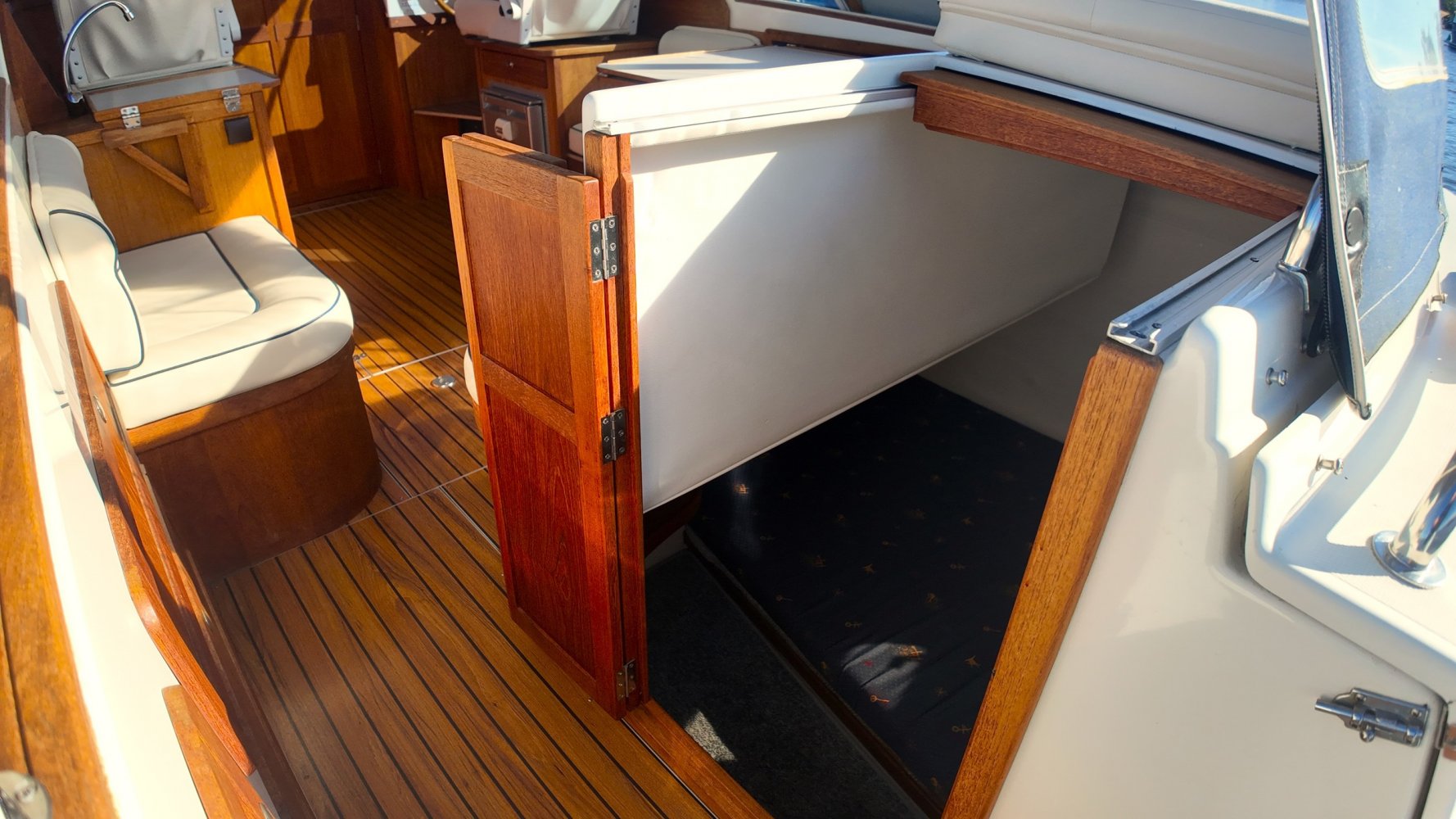 Wat deze Inter 9000 zo speciaal maakt is o.a. de spiegeldeur waar u via het zwemplateau gemakkelijk de kuip binnenkomt. De kuip is voorzien van een nette bank en nog twee extra zitplaatsen. Achter de bank bevindt zich de ingang naar de achterkajuit, deze is voorzien van een tweepersoons bed. Verder beschikt de salon nog over een keuken met een twee pits dieselkookplaat en natuurlijk de stuurstand en meevaarstoel. Voorin het schip bevindt zich een fijne rondzit die gemakkelijk is om te bouwen tot twee extra slaapplaatsen. Ook vindt u aan bakboordzijde een extra slaapplaats, aan stuurboordzijde bevindt zich nog de toiletruimte voorzien van een extra wasbak.