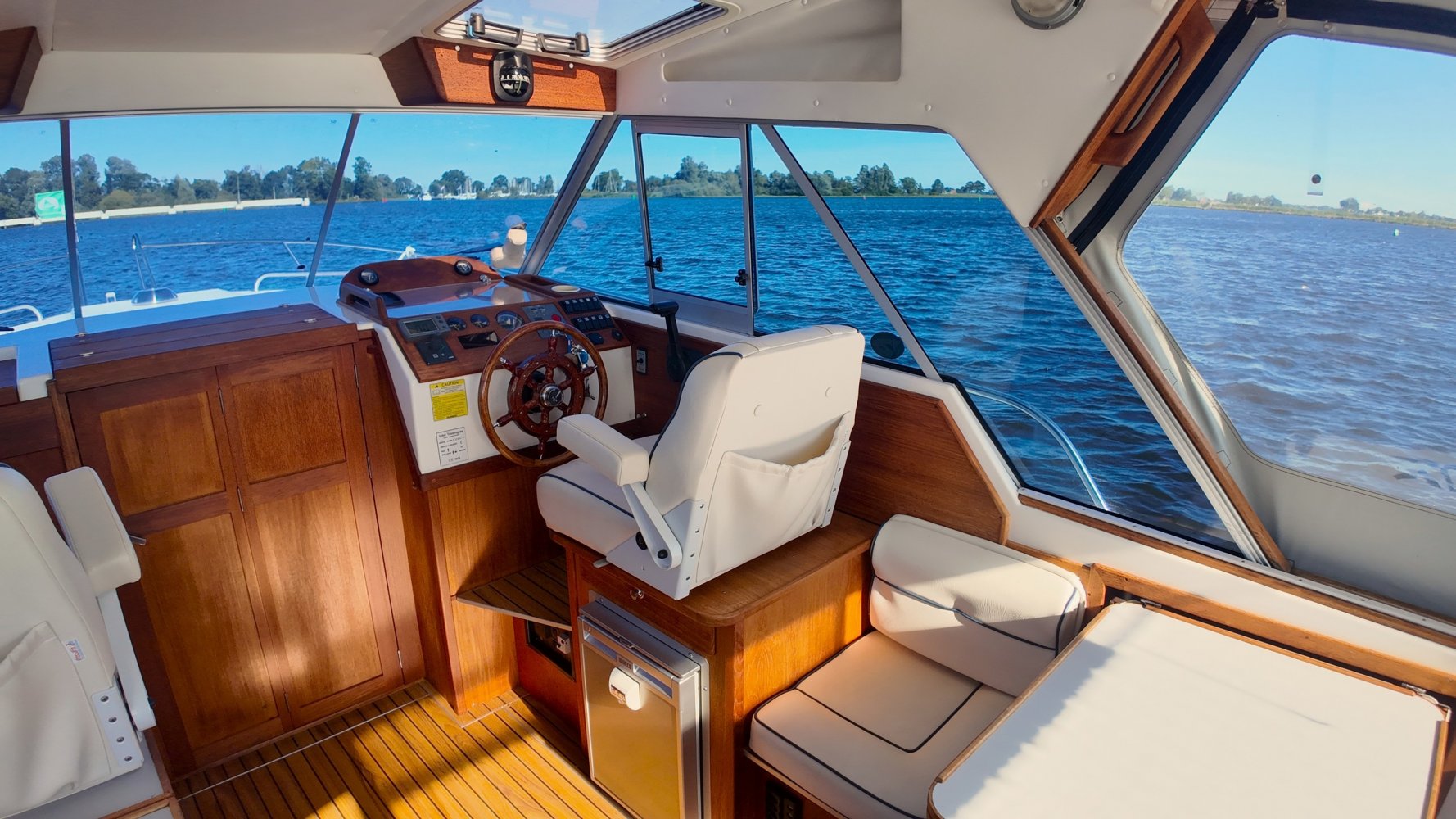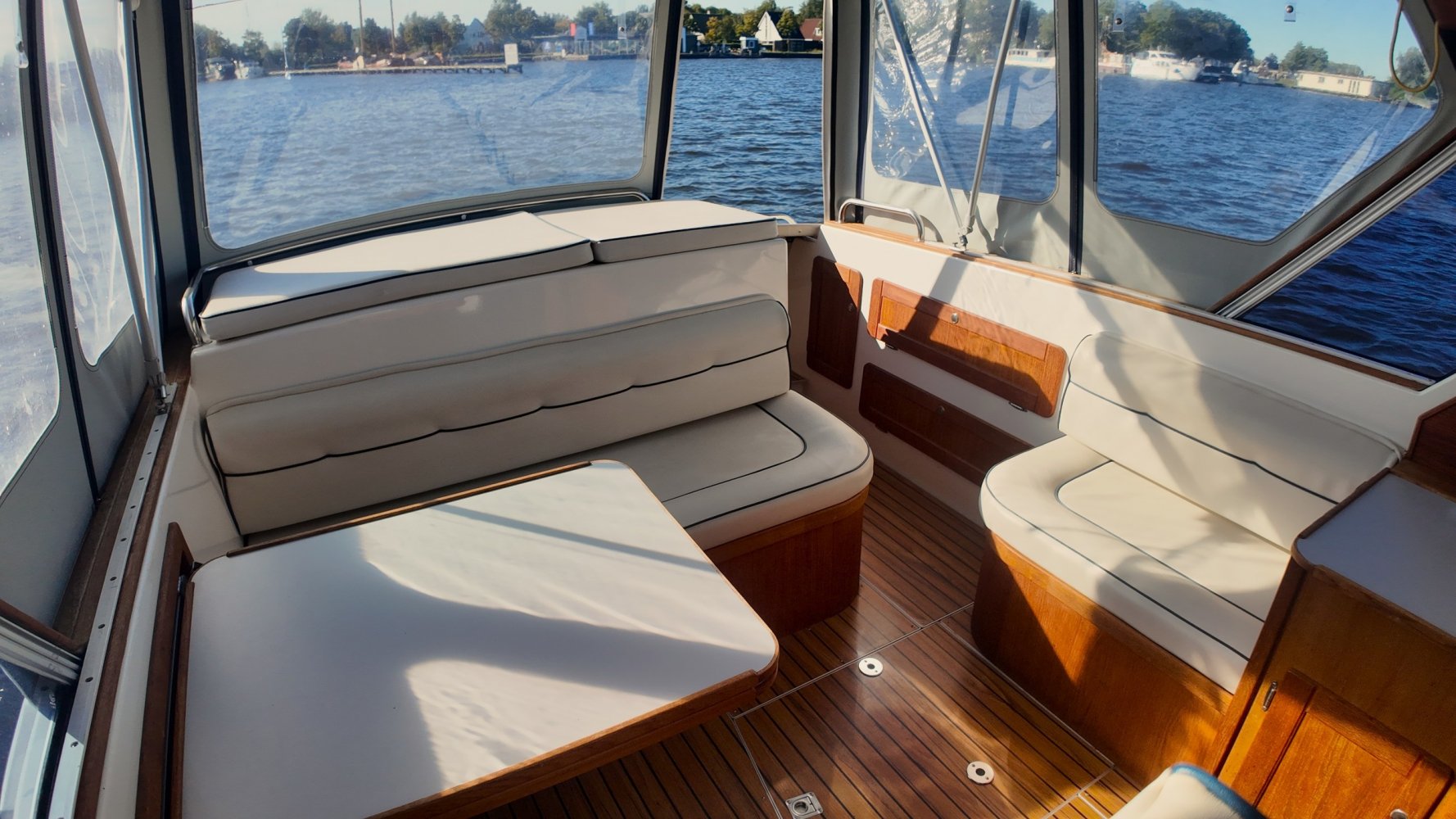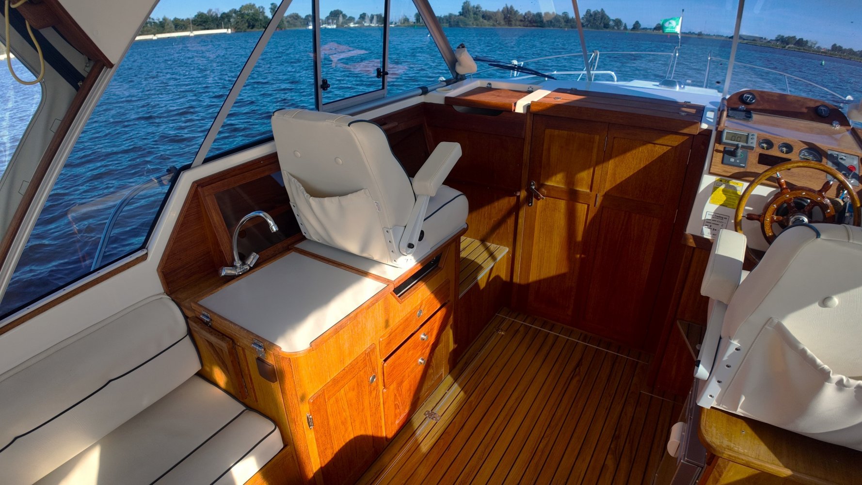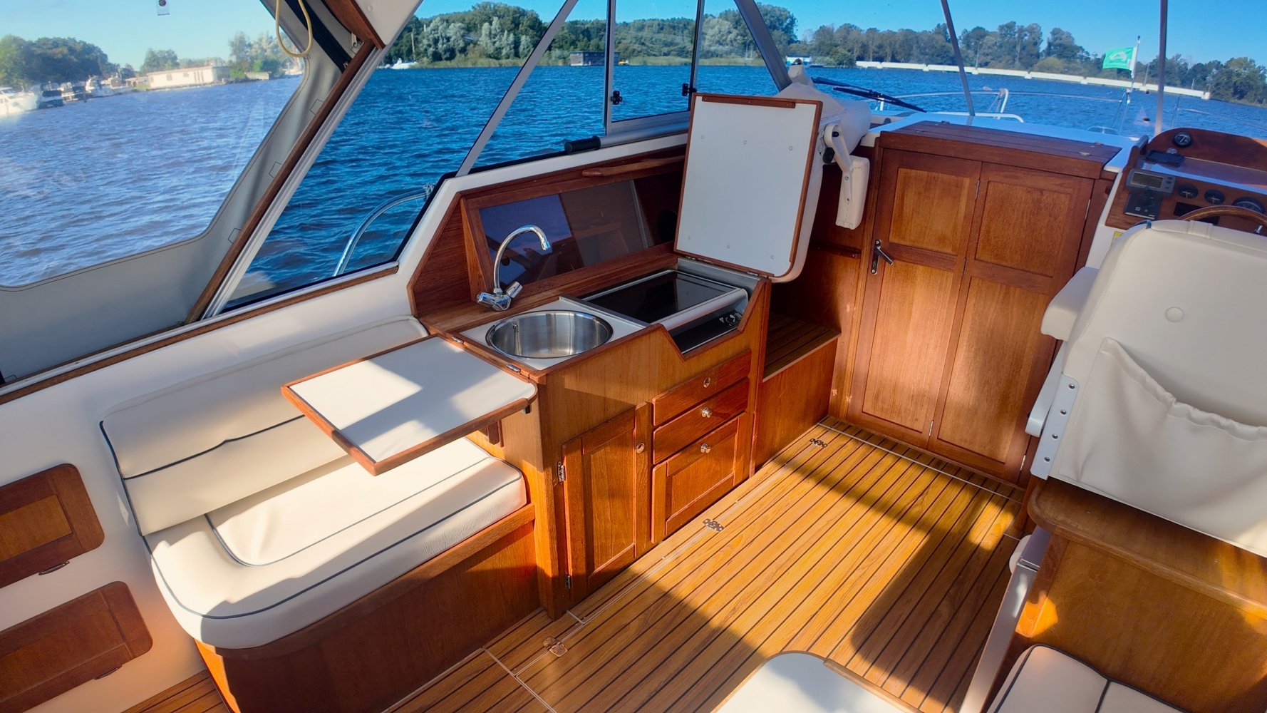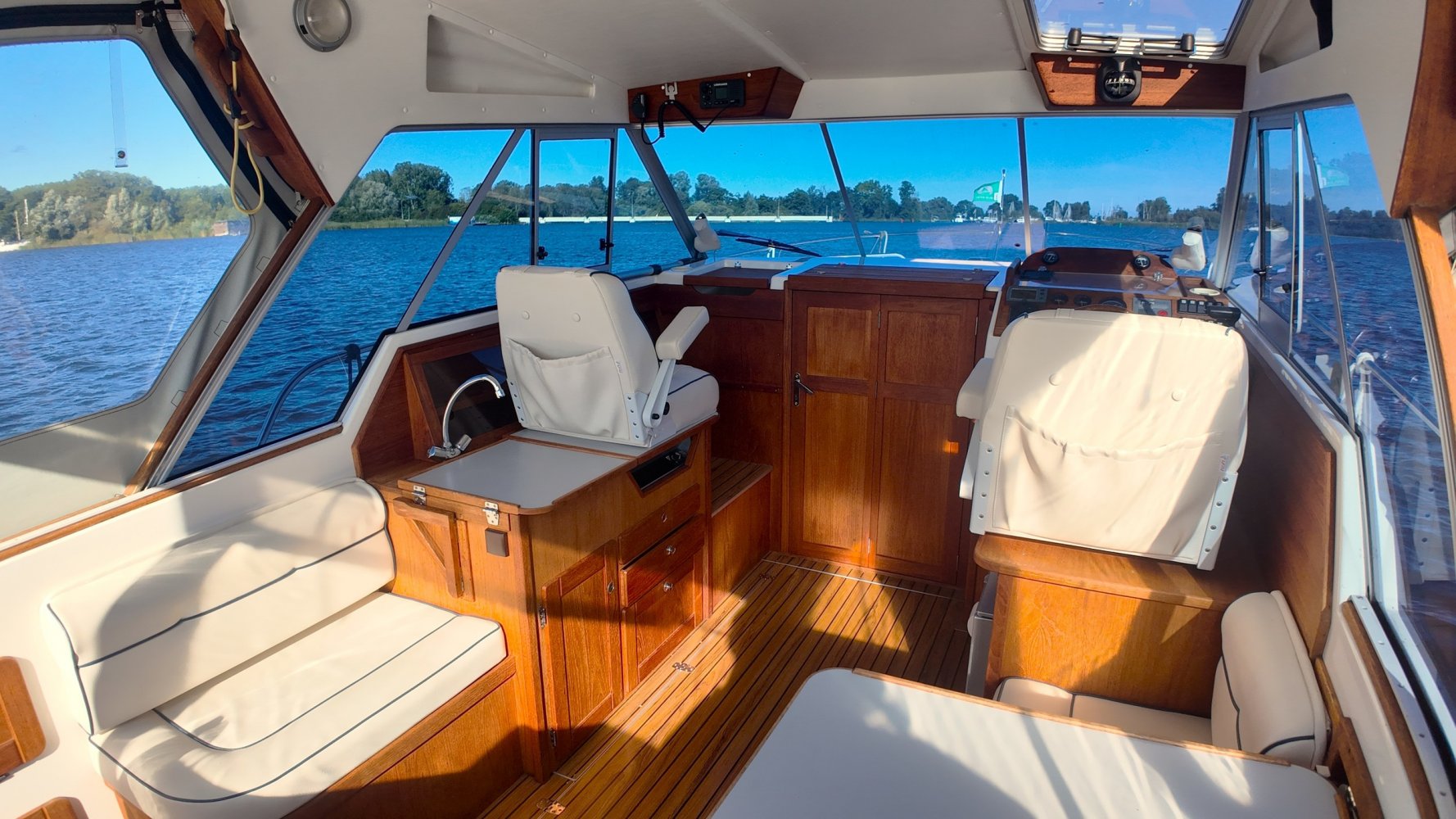 Wat deze Inter 9000 zo speciaal maakt is o.a. de spiegeldeur waar u via het zwemplateau gemakkelijk de kuip binnenkomt. De kuip is voorzien van een nette bank en nog twee extra zitplaatsen. Achter de bank bevindt zich de ingang naar de achterkajuit, deze is voorzien van een tweepersoons bed. Verder beschikt de salon nog over een keuken met een twee pits dieselkookplaat en natuurlijk de stuurstand en meevaarstoel. Voorin het schip bevindt zich een fijne rondzit die gemakkelijk is om te bouwen tot twee extra slaapplaatsen. Ook vindt u aan bakboordzijde een extra slaapplaats, aan stuurboordzijde bevindt zich nog de toiletruimte voorzien van een extra wasbak.