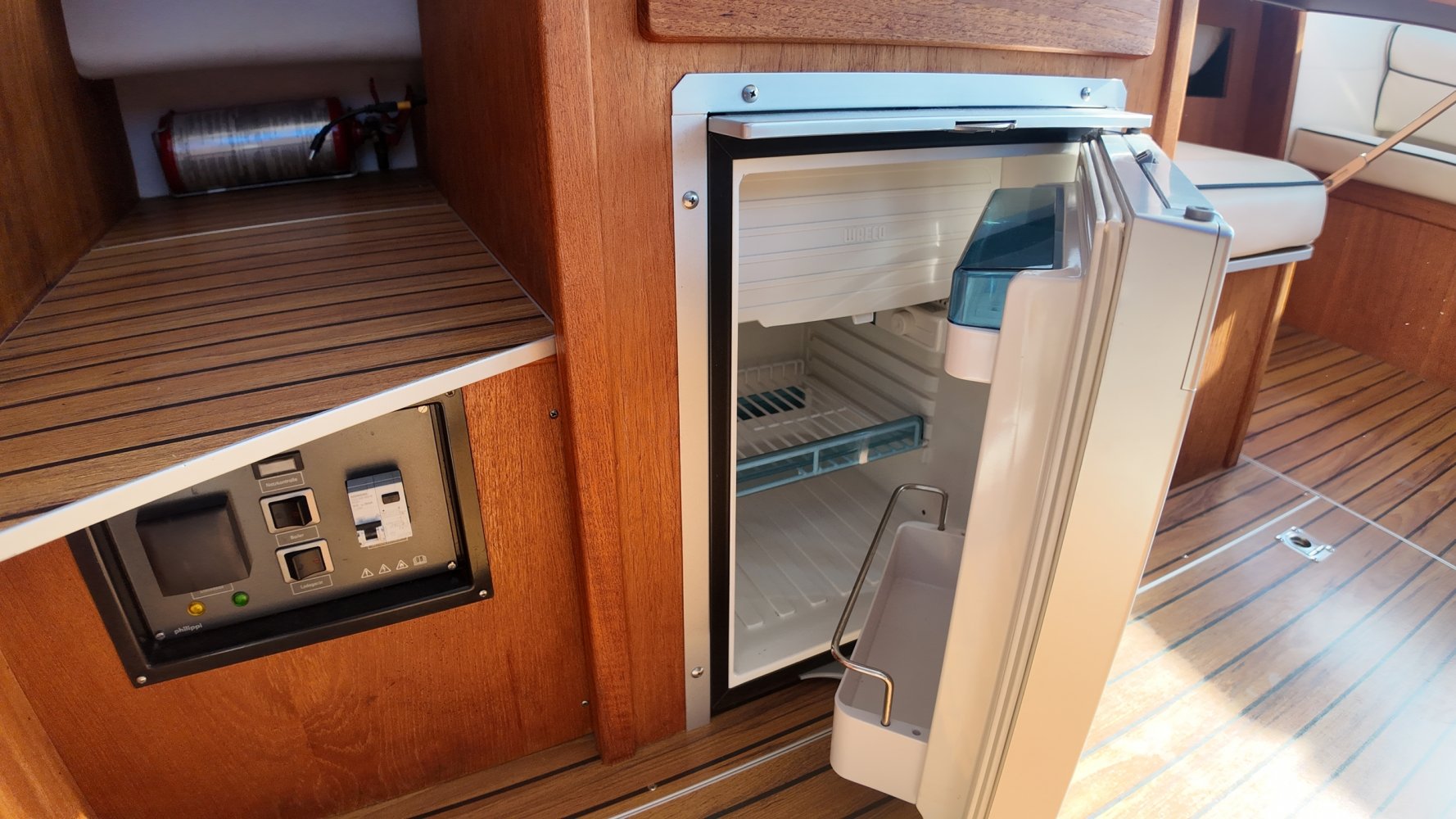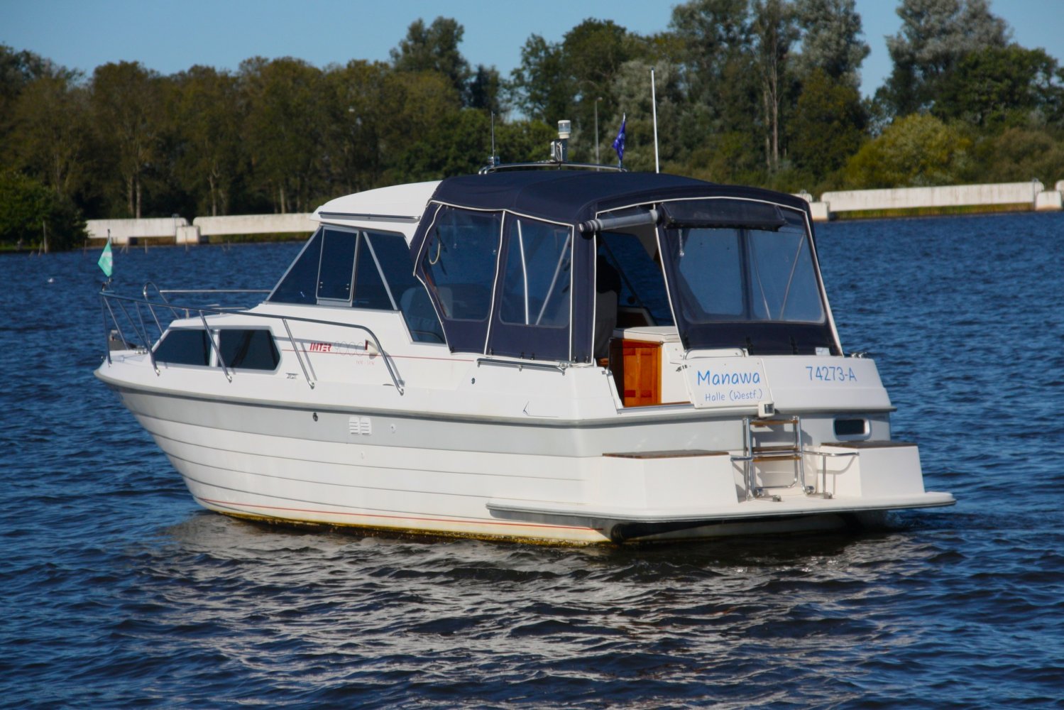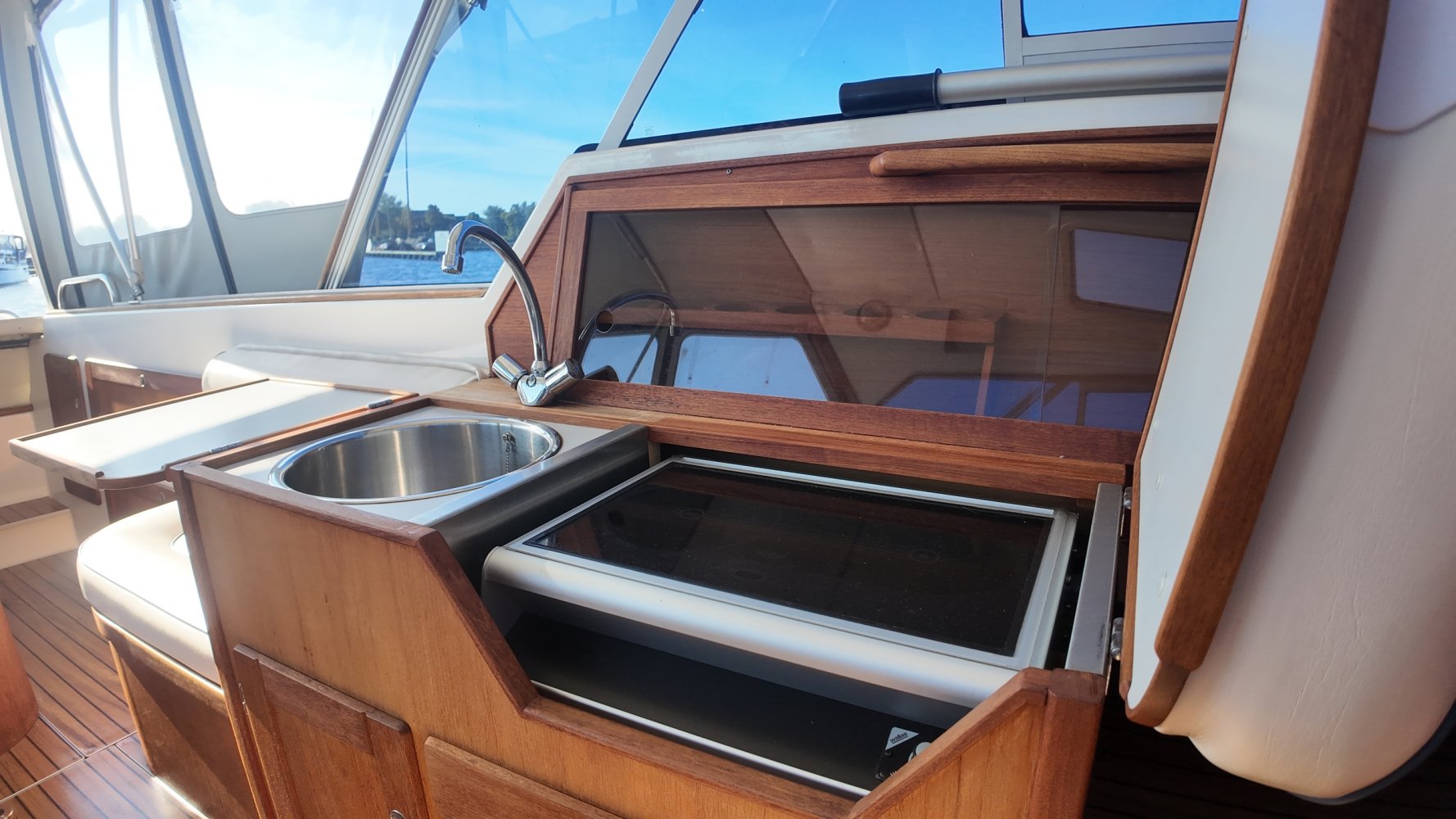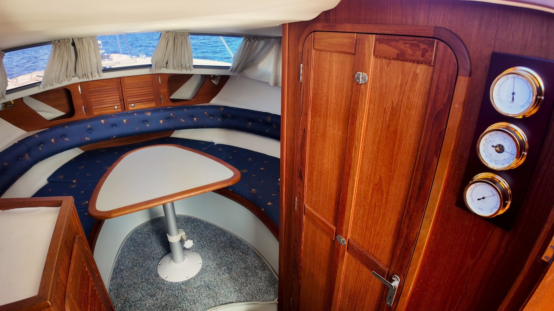 Wat deze Inter 9000 zo speciaal maakt is o.a. de spiegeldeur waar u via het zwemplateau gemakkelijk de kuip binnenkomt. De kuip is voorzien van een nette bank en nog twee extra zitplaatsen. Achter de bank bevindt zich de ingang naar de achterkajuit, deze is voorzien van een tweepersoons bed. Verder beschikt de salon nog over een keuken met een twee pits dieselkookplaat en natuurlijk de stuurstand en meevaarstoel. Voorin het schip bevindt zich een fijne rondzit die gemakkelijk is om te bouwen tot twee extra slaapplaatsen. Ook vindt u aan bakboordzijde een extra slaapplaats, aan stuurboordzijde bevindt zich nog de toiletruimte voorzien van een extra wasbak.