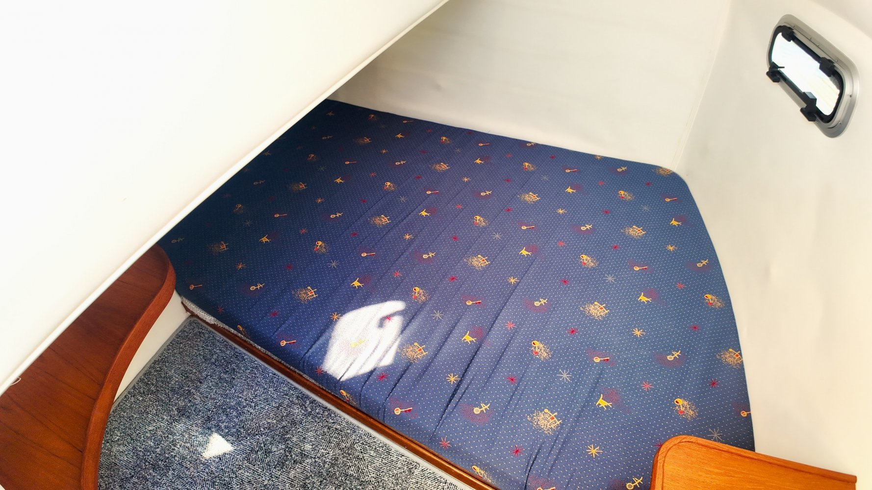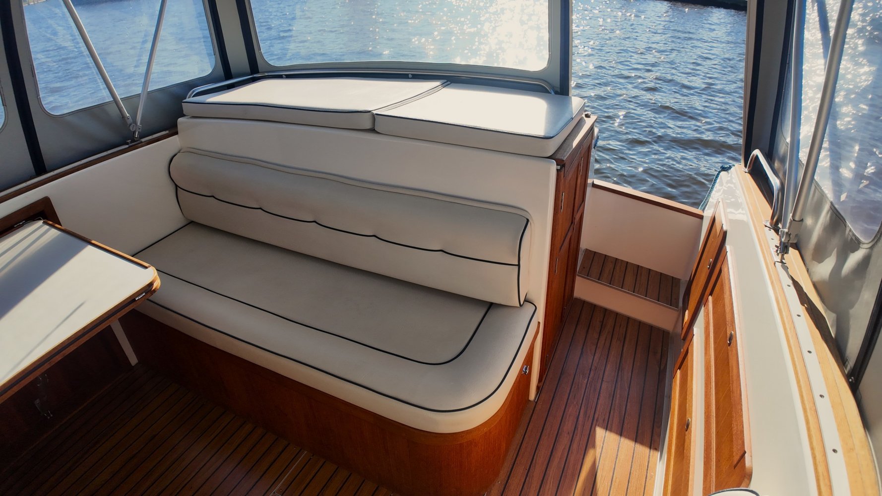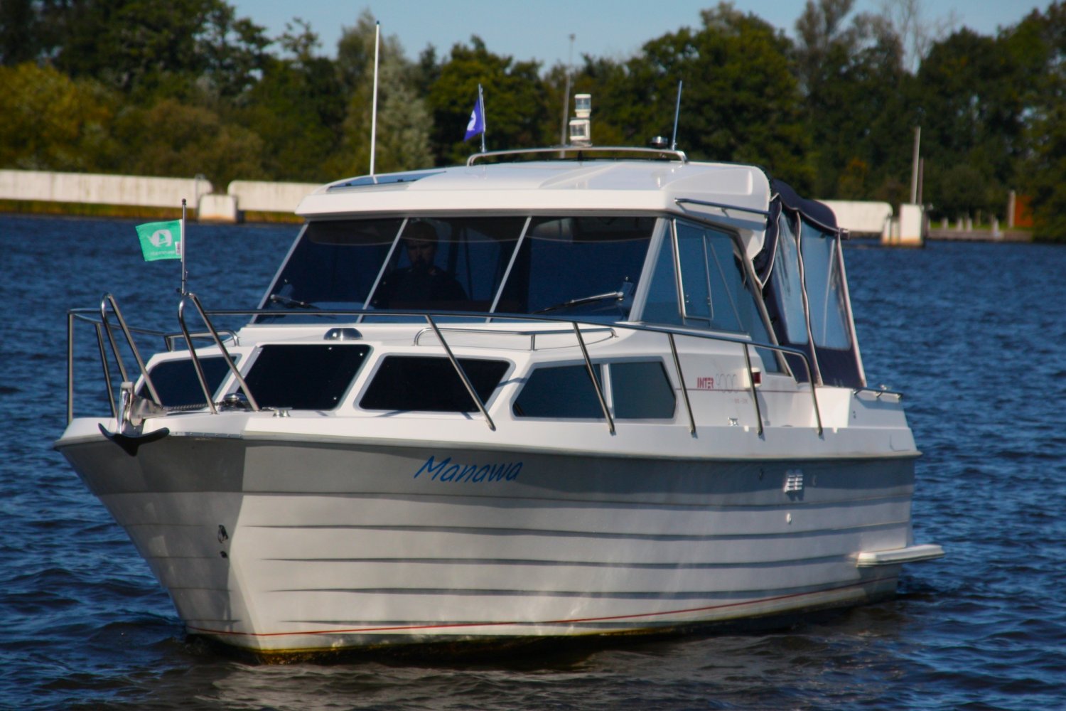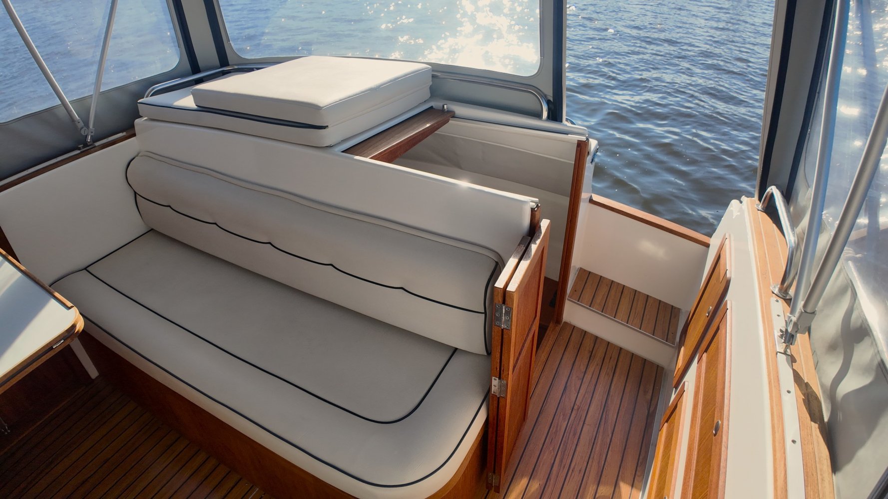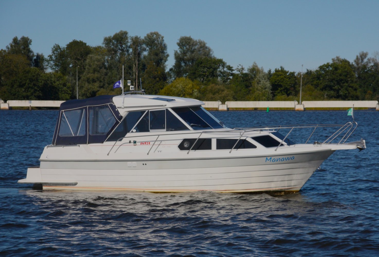 Wat deze Inter 9000 zo speciaal maakt is o.a. de spiegeldeur waar u via het zwemplateau gemakkelijk de kuip binnenkomt. De kuip is voorzien van een nette bank en nog twee extra zitplaatsen. Achter de bank bevindt zich de ingang naar de achterkajuit, deze is voorzien van een tweepersoons bed. Verder beschikt de salon nog over een keuken met een twee pits dieselkookplaat en natuurlijk de stuurstand en meevaarstoel. Voorin het schip bevindt zich een fijne rondzit die gemakkelijk is om te bouwen tot twee extra slaapplaatsen. Ook vindt u aan bakboordzijde een extra slaapplaats, aan stuurboordzijde bevindt zich nog de toiletruimte voorzien van een extra wasbak.