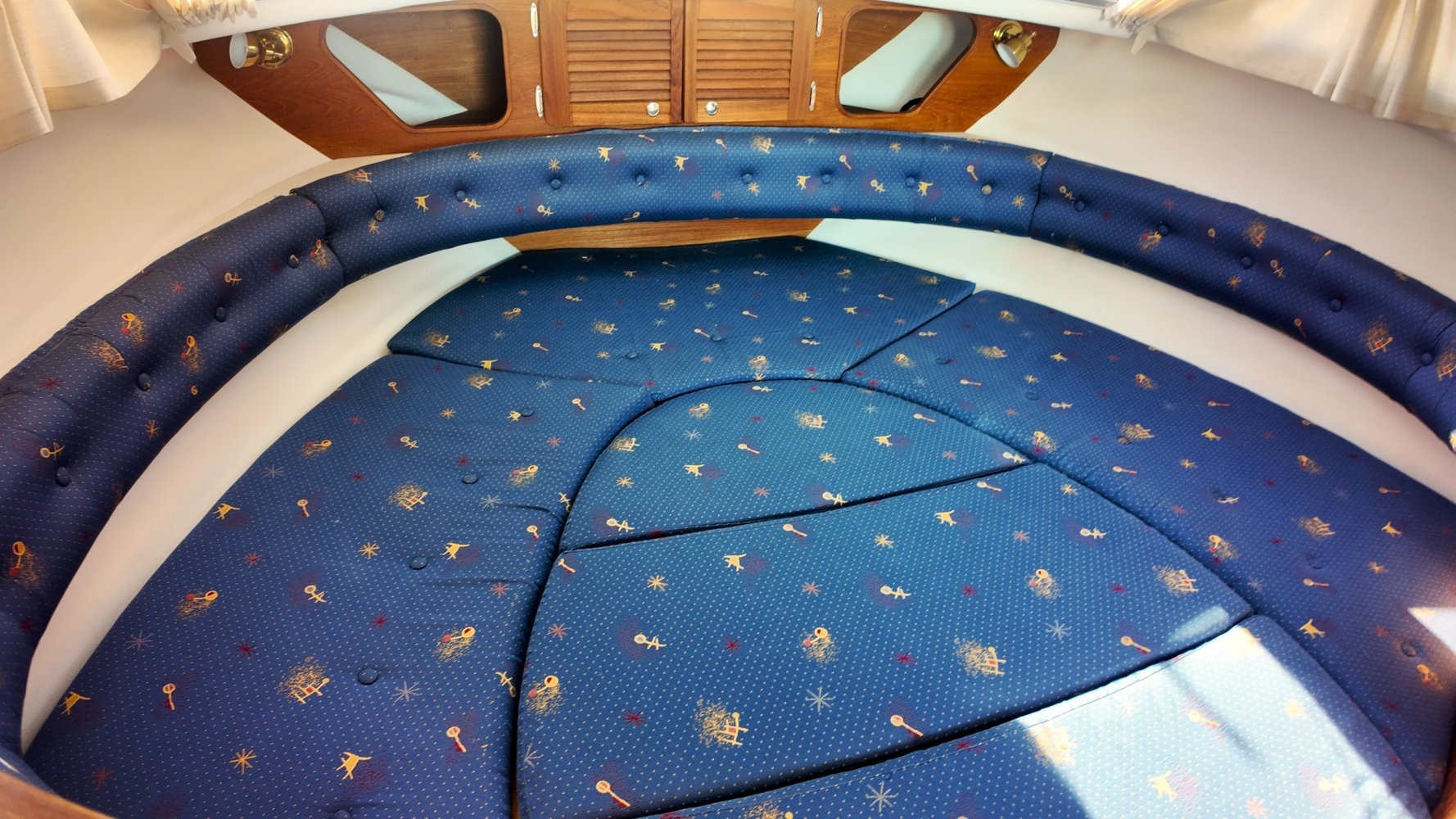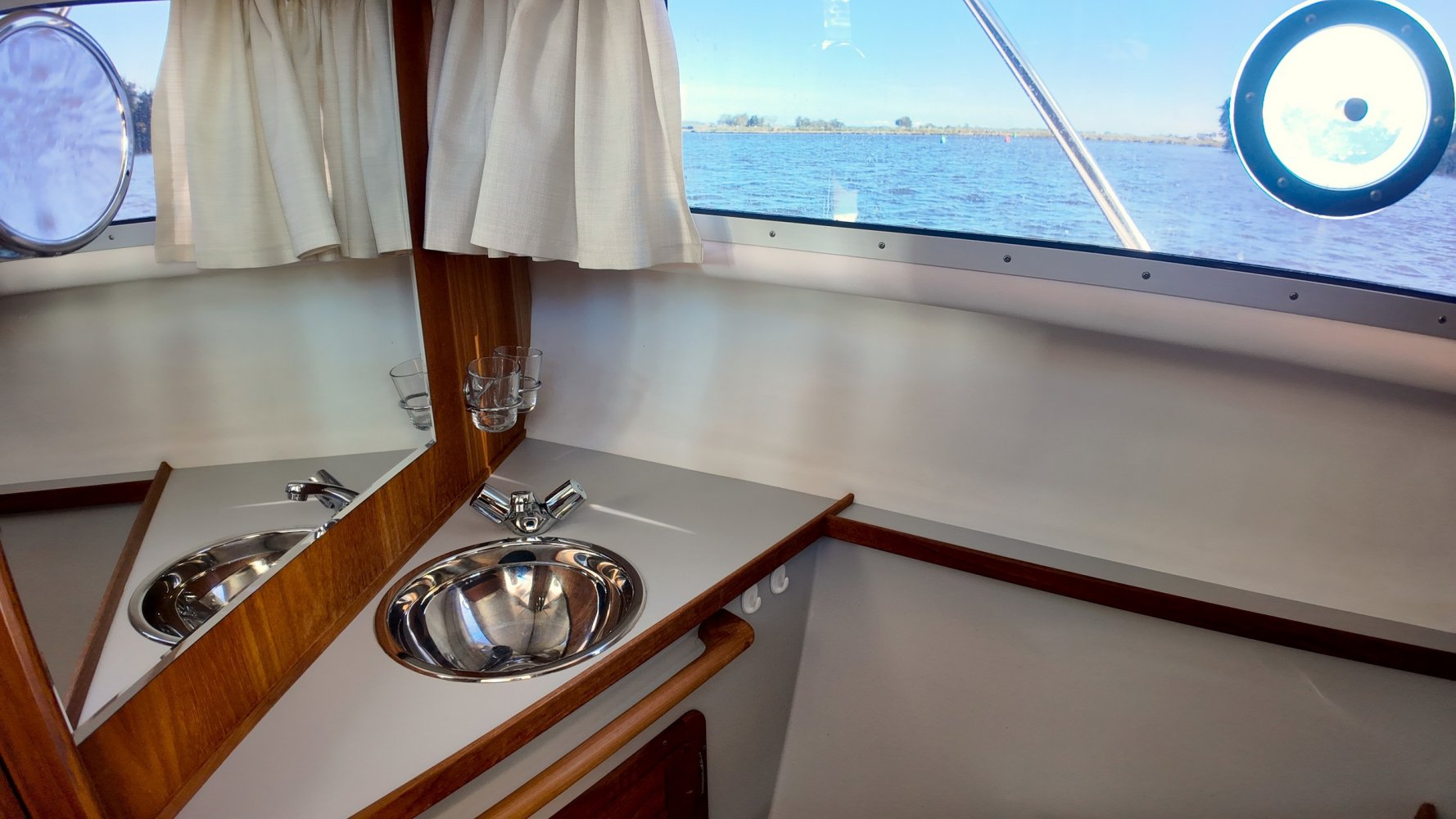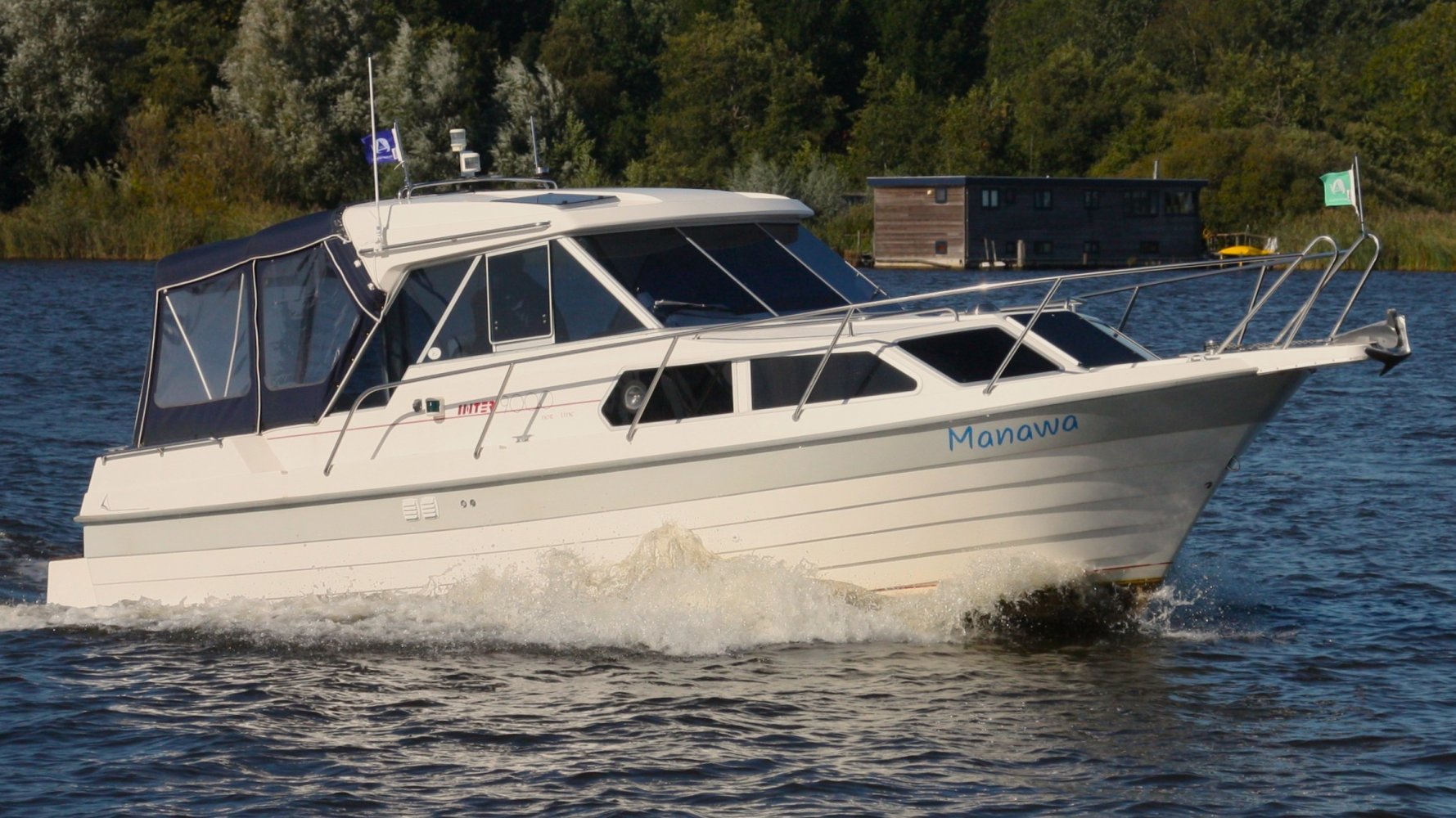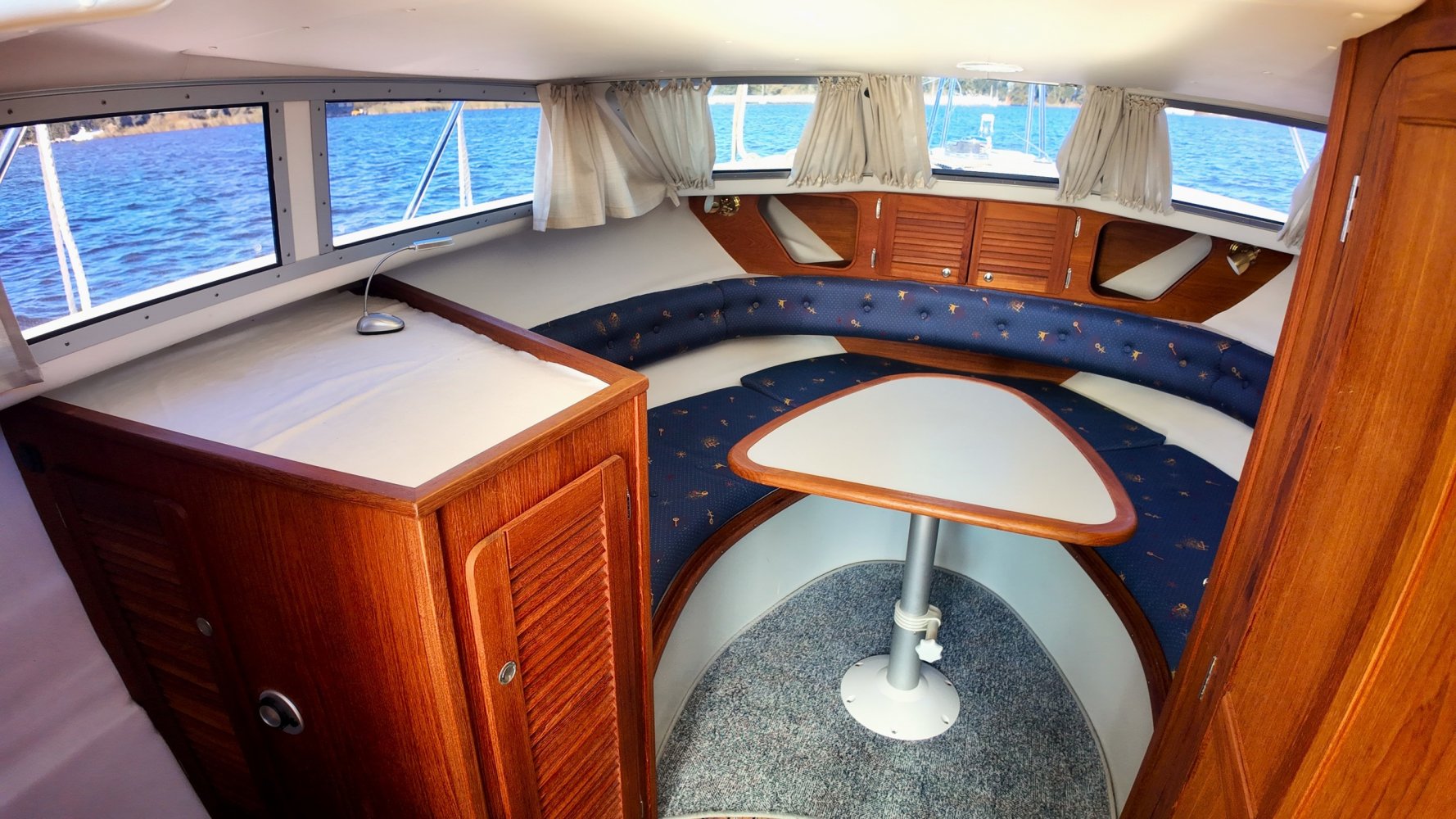 Wat deze Inter 9000 zo speciaal maakt is o.a. de spiegeldeur waar u via het zwemplateau gemakkelijk de kuip binnenkomt. De kuip is voorzien van een nette bank en nog twee extra zitplaatsen. Achter de bank bevindt zich de ingang naar de achterkajuit, deze is voorzien van een tweepersoons bed. Verder beschikt de salon nog over een keuken met een twee pits dieselkookplaat en natuurlijk de stuurstand en meevaarstoel. Voorin het schip bevindt zich een fijne rondzit die gemakkelijk is om te bouwen tot twee extra slaapplaatsen. Ook vindt u aan bakboordzijde een extra slaapplaats, aan stuurboordzijde bevindt zich nog de toiletruimte voorzien van een extra wasbak.