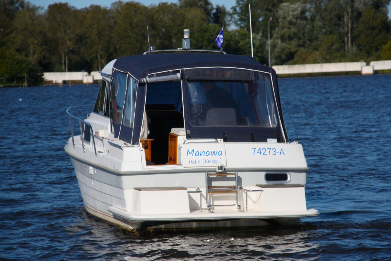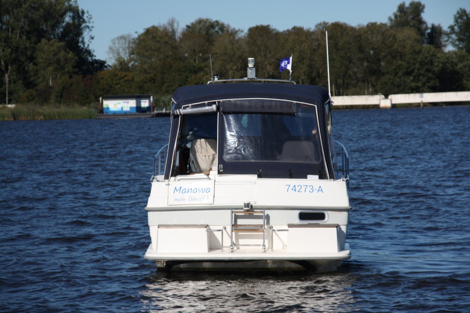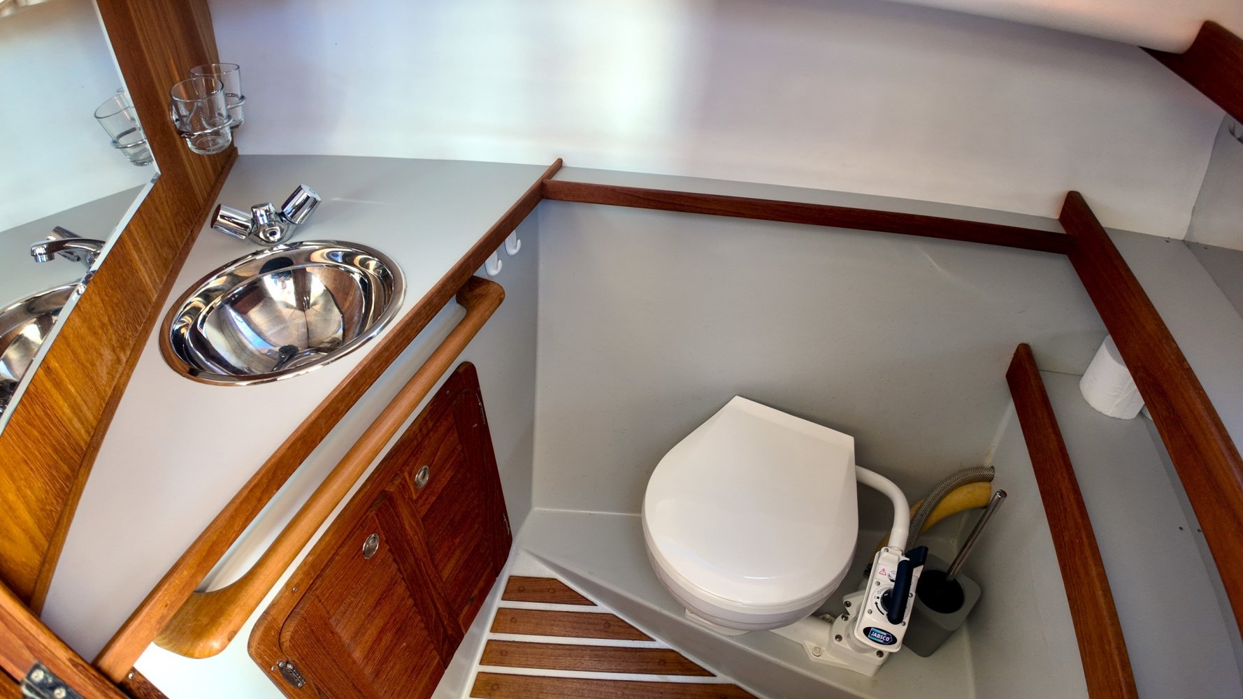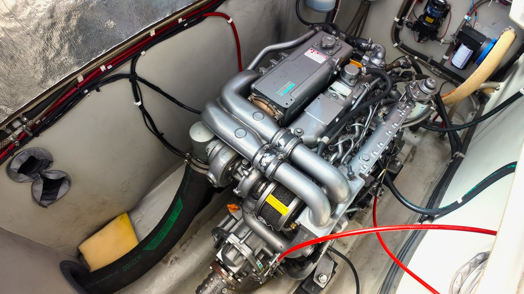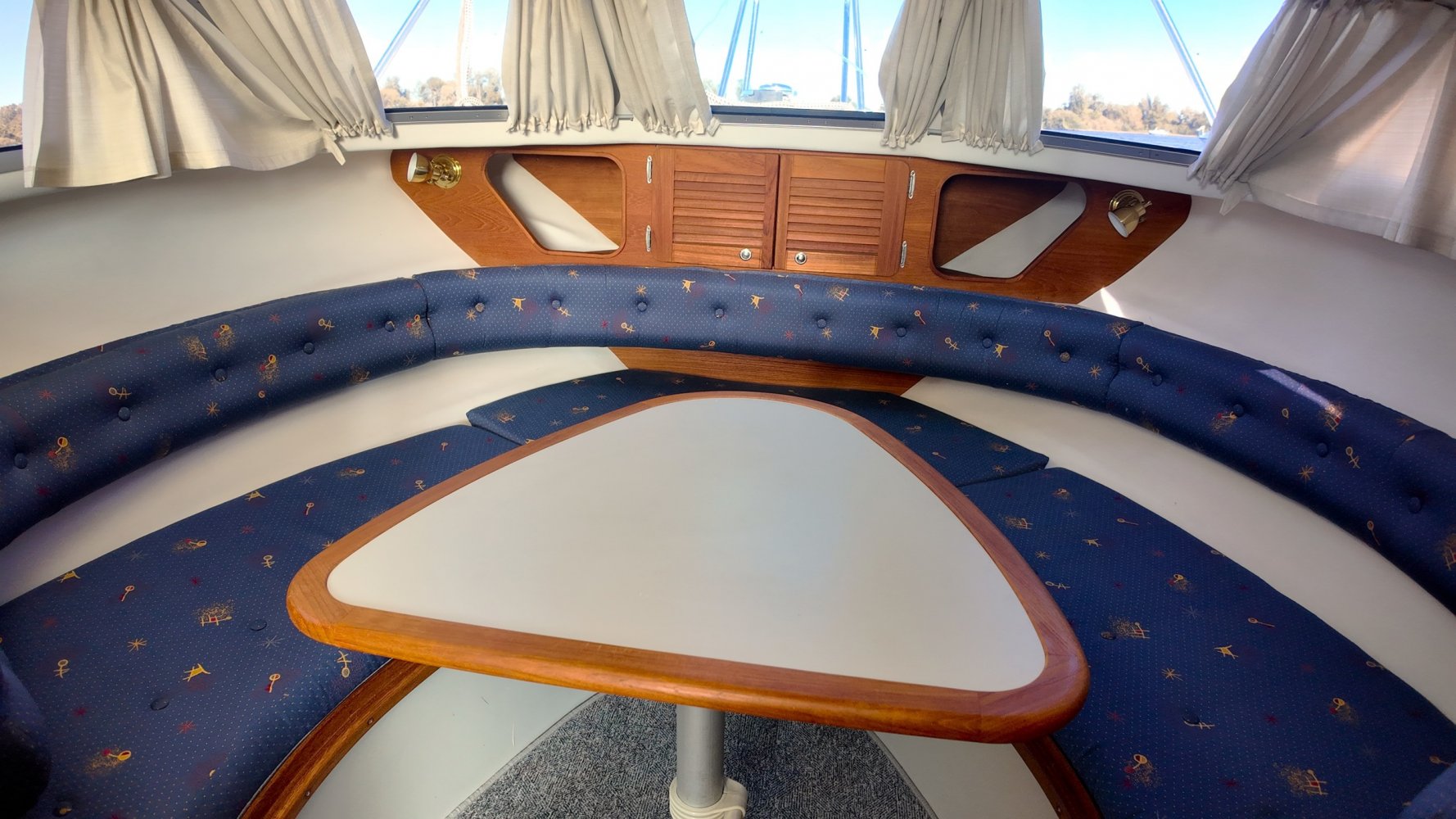 Wat deze Inter 9000 zo speciaal maakt is o.a. de spiegeldeur waar u via het zwemplateau gemakkelijk de kuip binnenkomt. De kuip is voorzien van een nette bank en nog twee extra zitplaatsen. Achter de bank bevindt zich de ingang naar de achterkajuit, deze is voorzien van een tweepersoons bed. Verder beschikt de salon nog over een keuken met een twee pits dieselkookplaat en natuurlijk de stuurstand en meevaarstoel. Voorin het schip bevindt zich een fijne rondzit die gemakkelijk is om te bouwen tot twee extra slaapplaatsen. Ook vindt u aan bakboordzijde een extra slaapplaats, aan stuurboordzijde bevindt zich nog de toiletruimte voorzien van een extra wasbak.