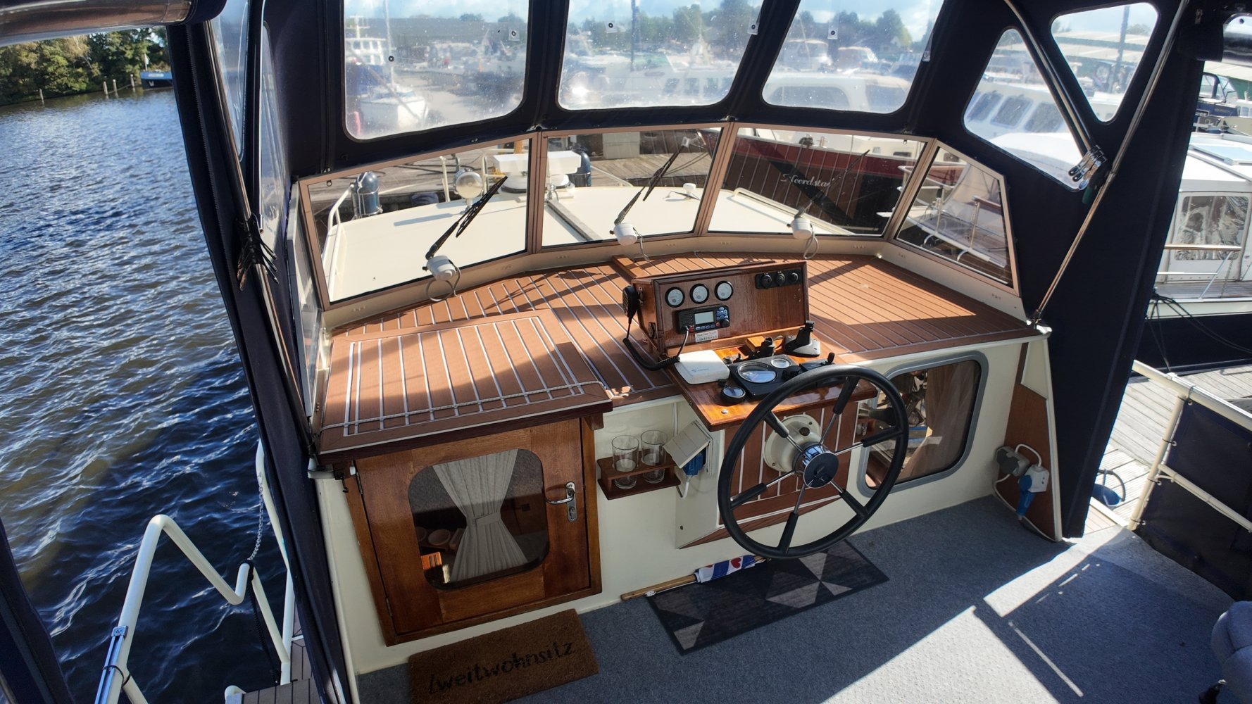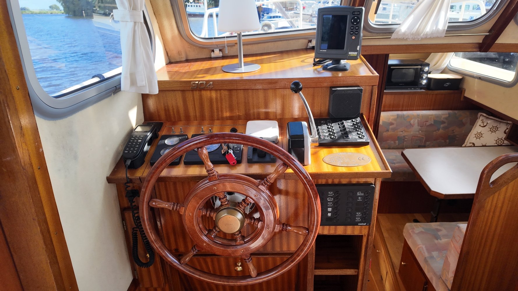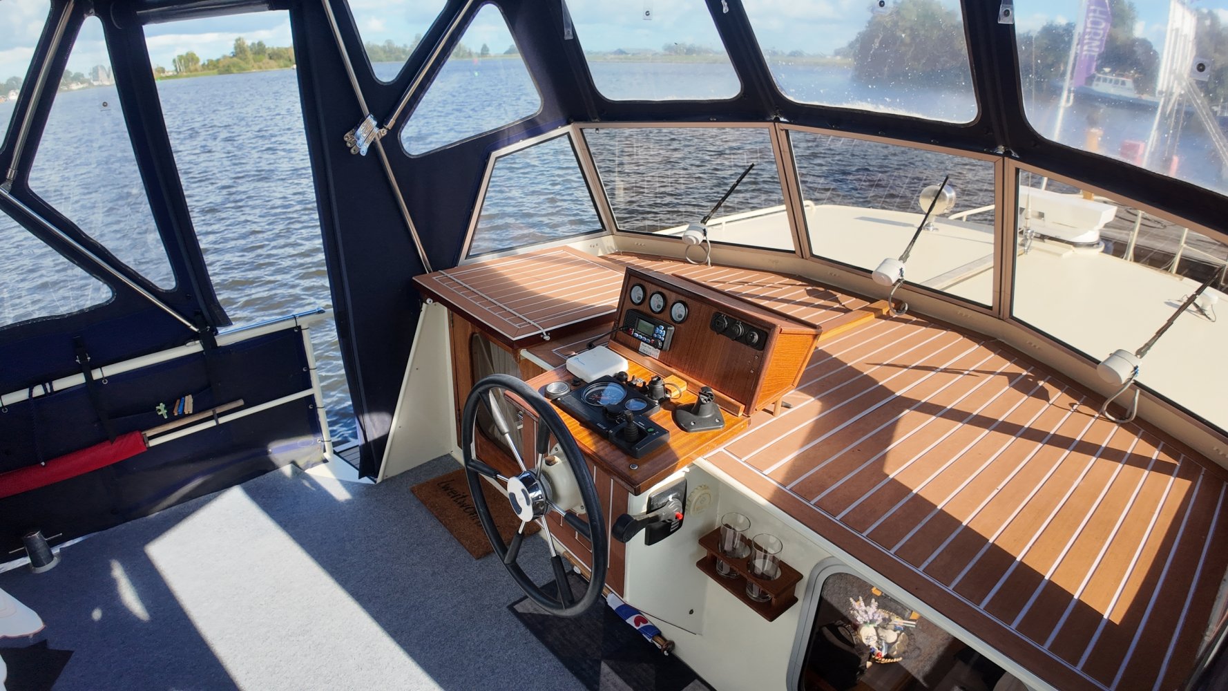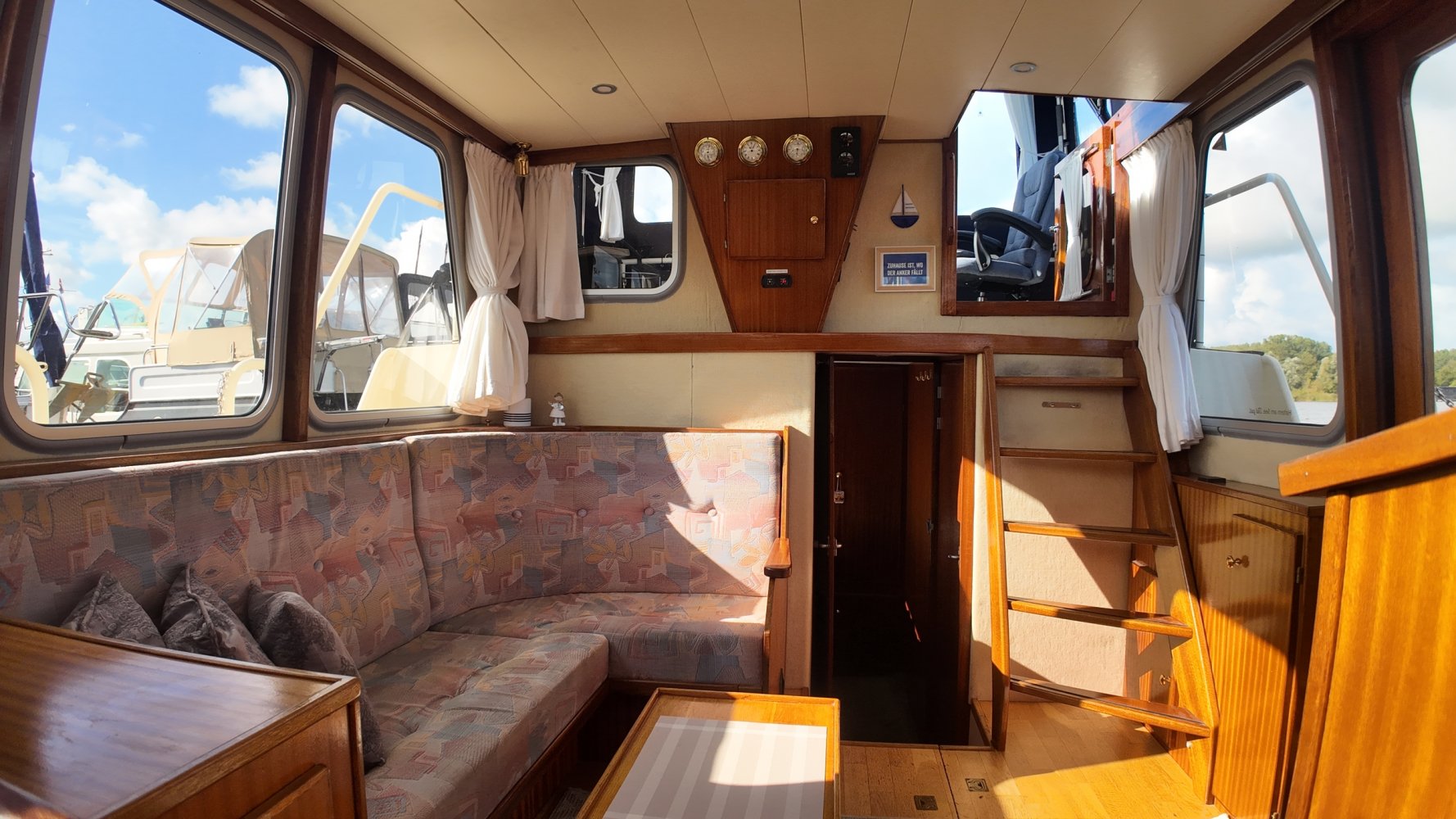 Op het achterdek vindt u nog een tweede stuurstand die volledig is overdekt dankzij de royale overkapping. Het interieur is logisch en functioneel ingedeeld, de voor en achterkajuit zijn beide voorzien van een half-vrijstaand bed met in de achterkajuit, over de lengte verdeeld, een badkamer voorzien van douche en toilet.