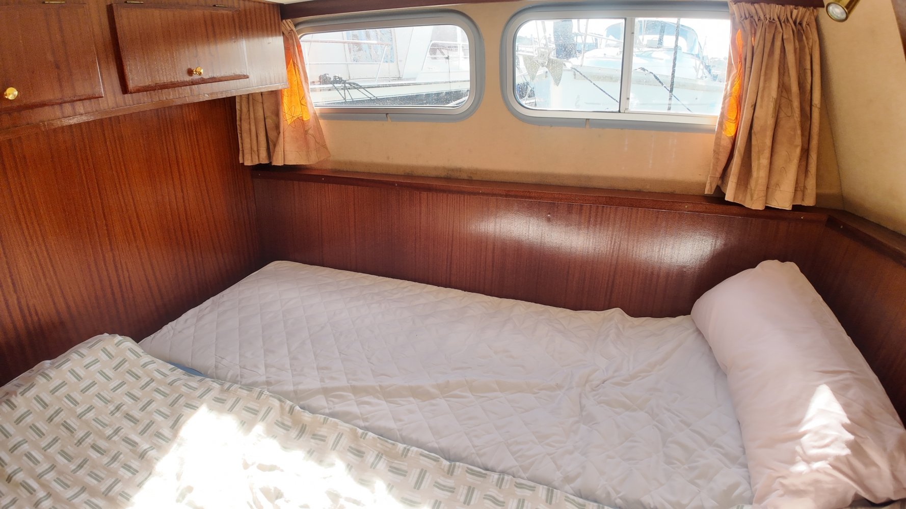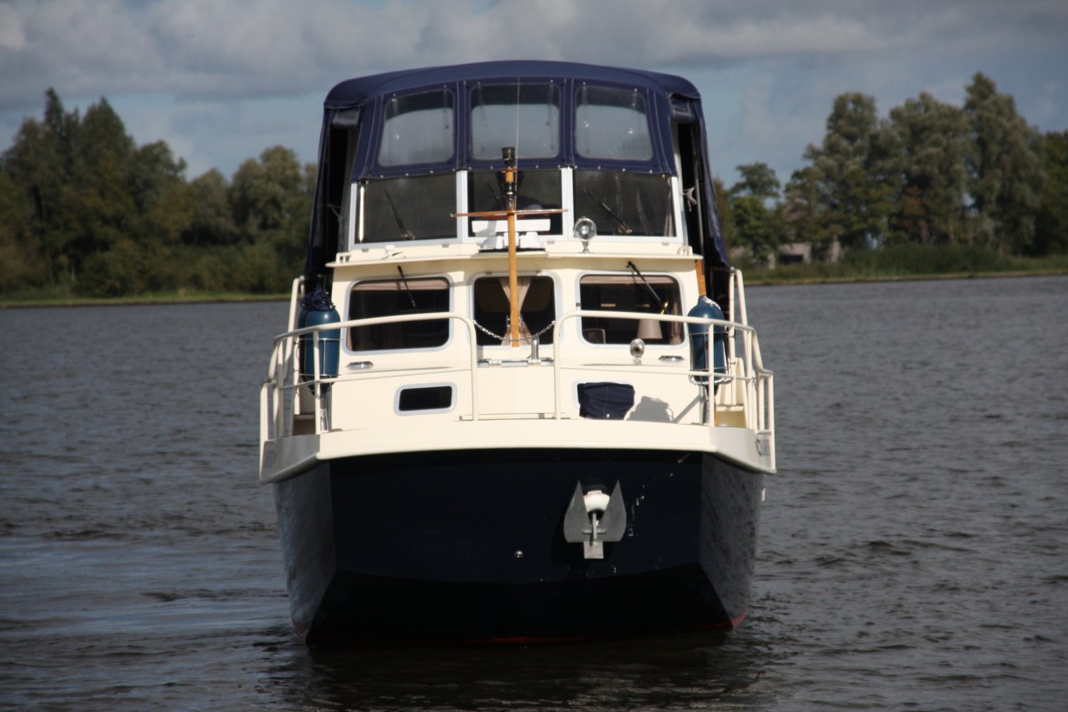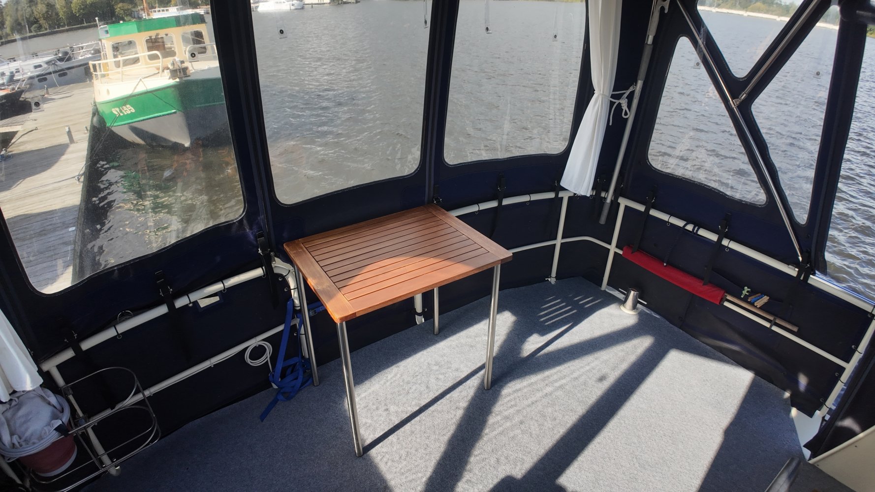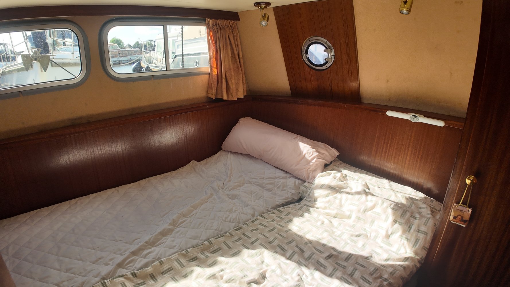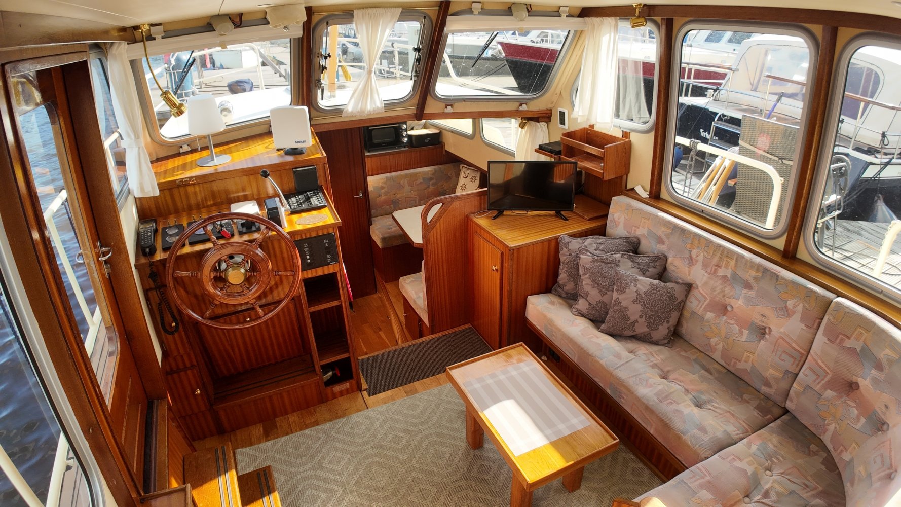 Op het achterdek vindt u nog een tweede stuurstand die volledig is overdekt dankzij de royale overkapping. Het interieur is logisch en functioneel ingedeeld, de voor en achterkajuit zijn beide voorzien van een half-vrijstaand bed met in de achterkajuit, over de lengte verdeeld, een badkamer voorzien van douche en toilet.