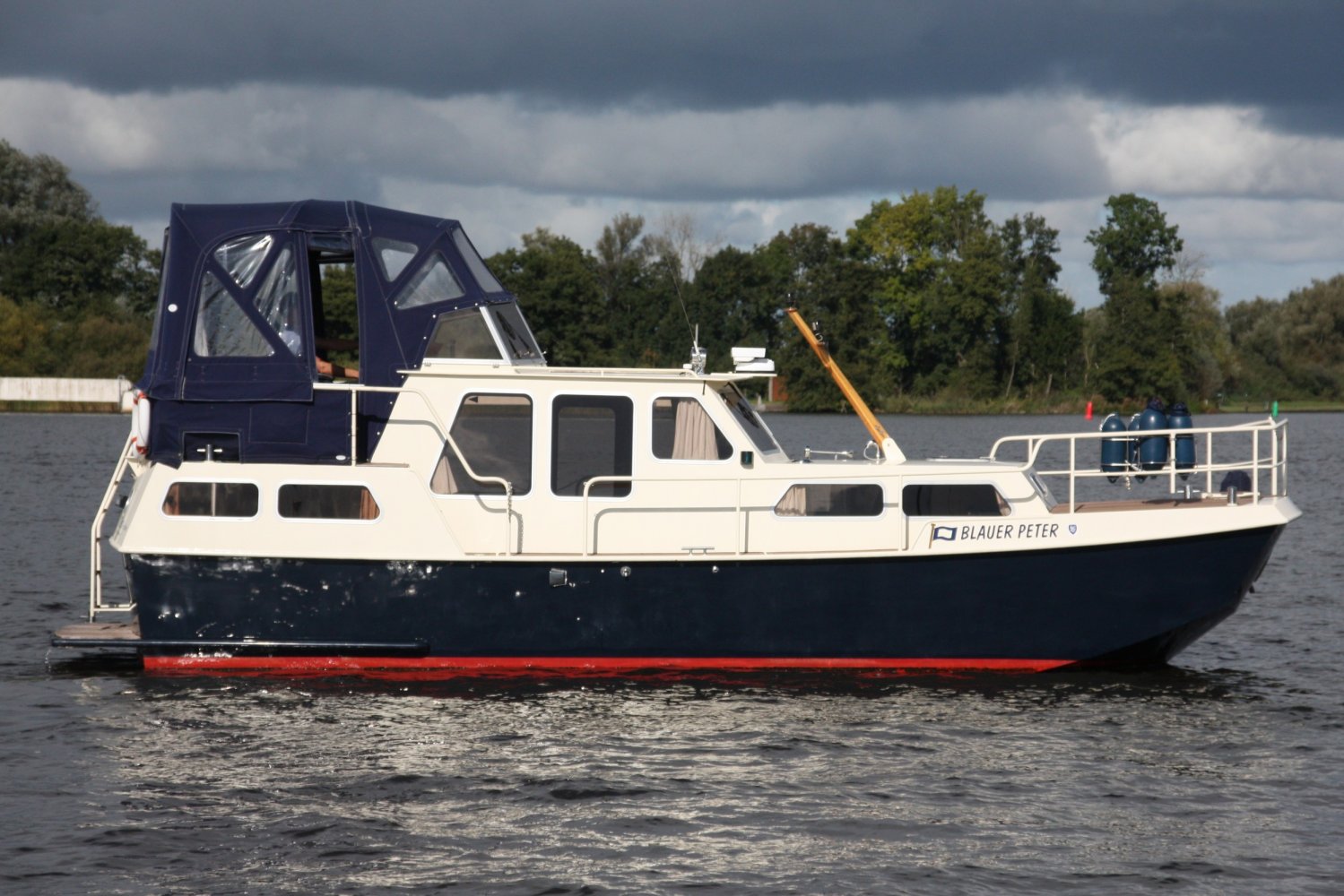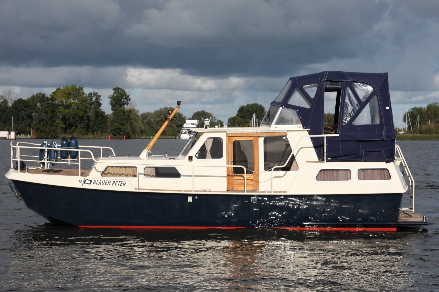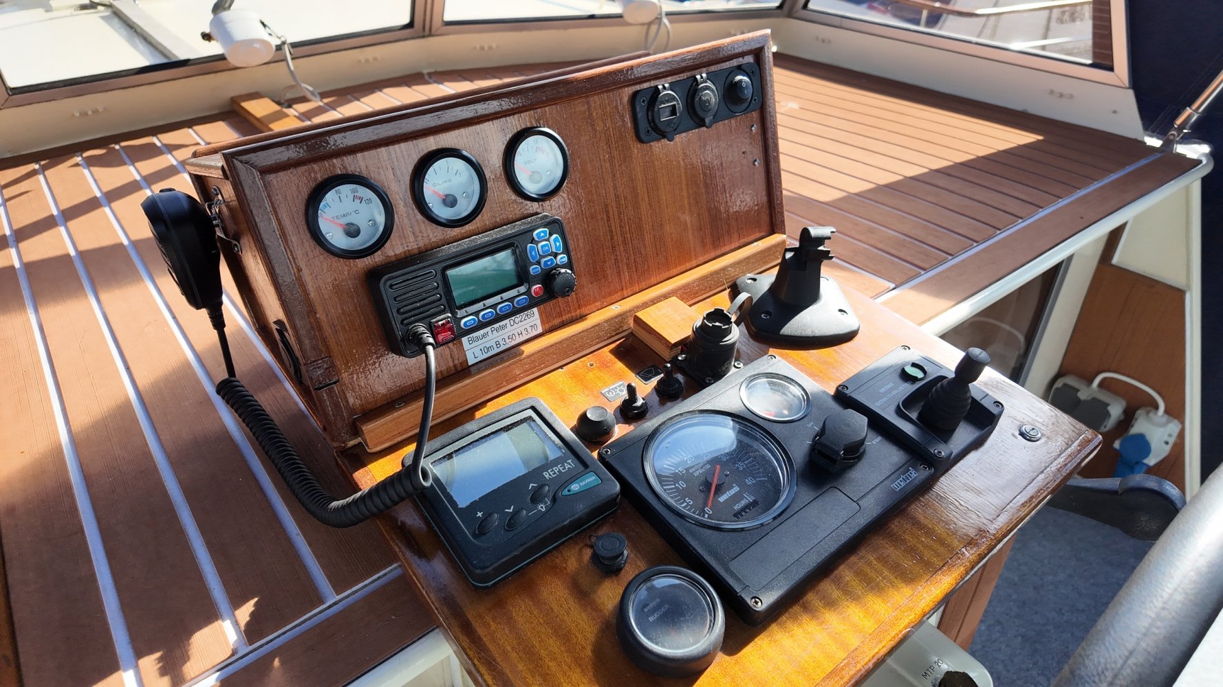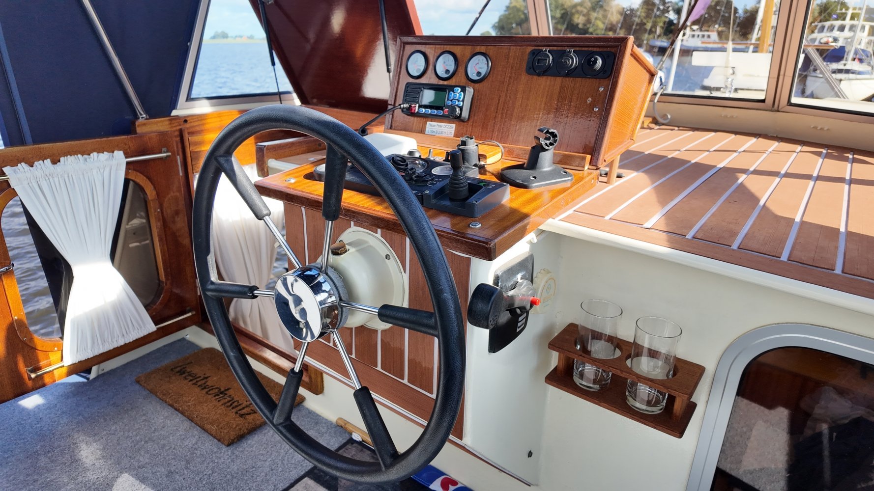 Op het achterdek vindt u nog een tweede stuurstand die volledig is overdekt dankzij de royale overkapping. Het interieur is logisch en functioneel ingedeeld, de voor en achterkajuit zijn beide voorzien van een half-vrijstaand bed met in de achterkajuit, over de lengte verdeeld, een badkamer voorzien van douche en toilet.