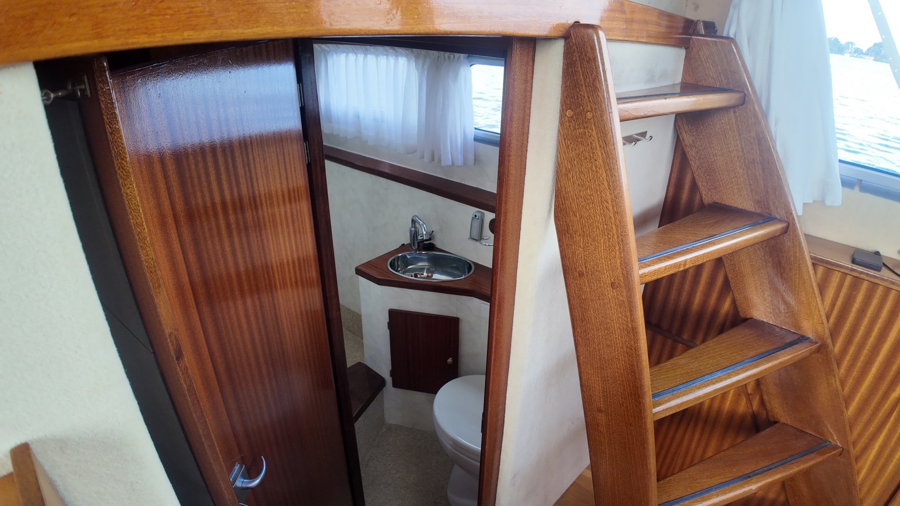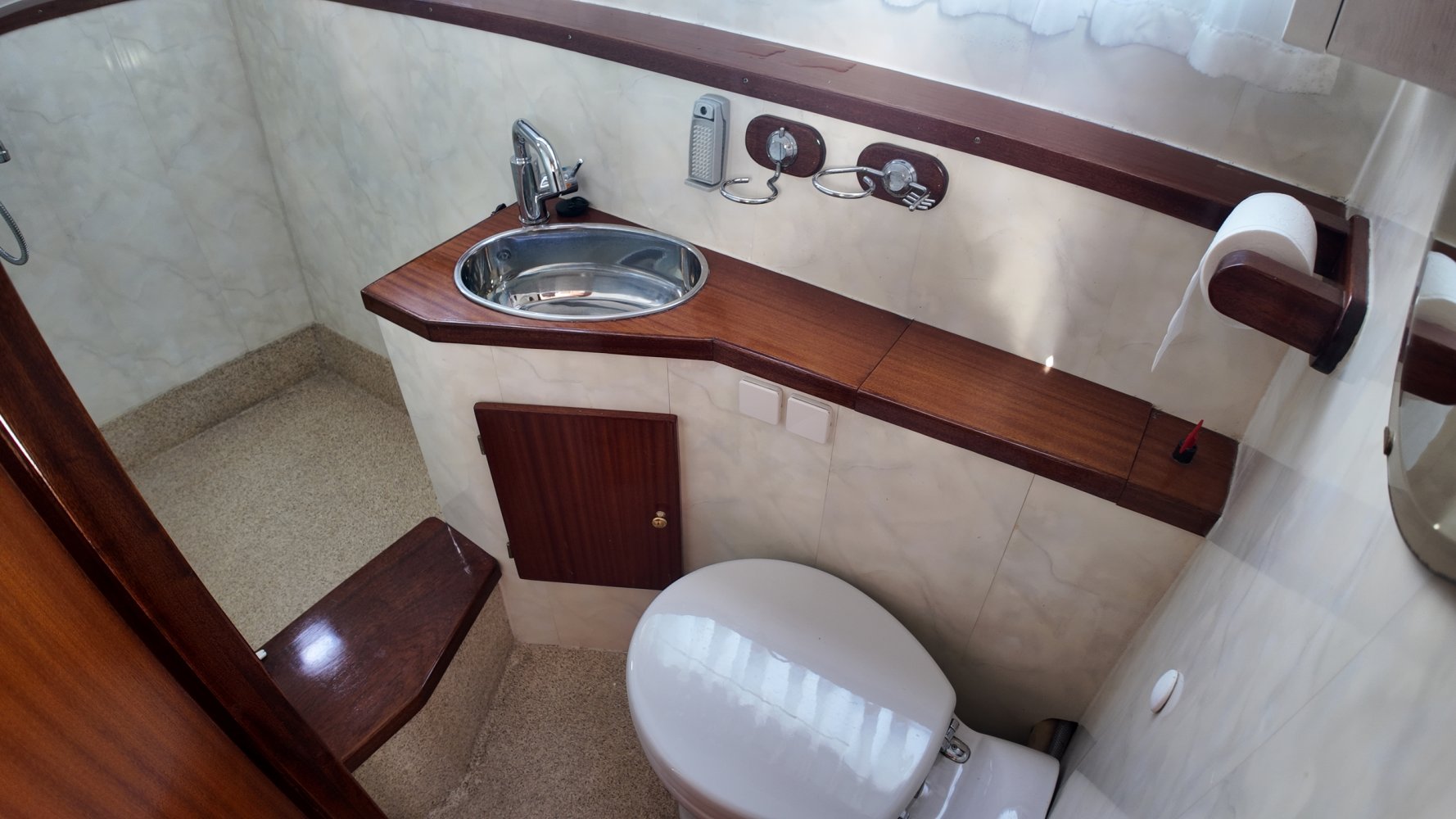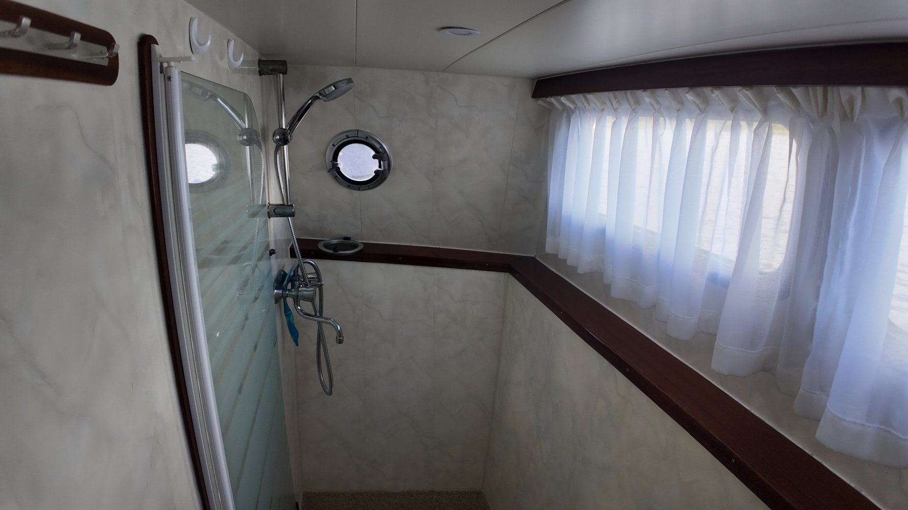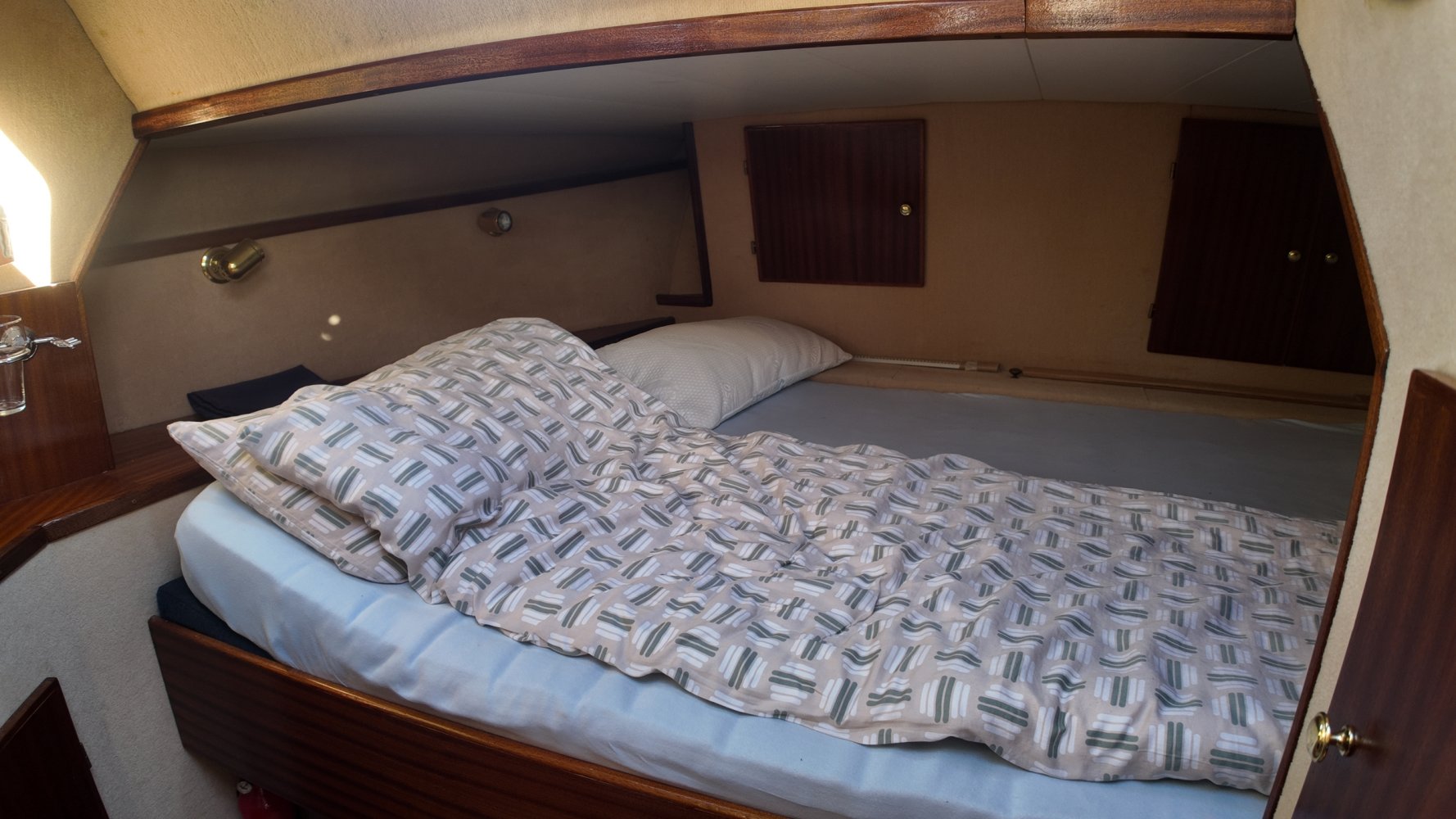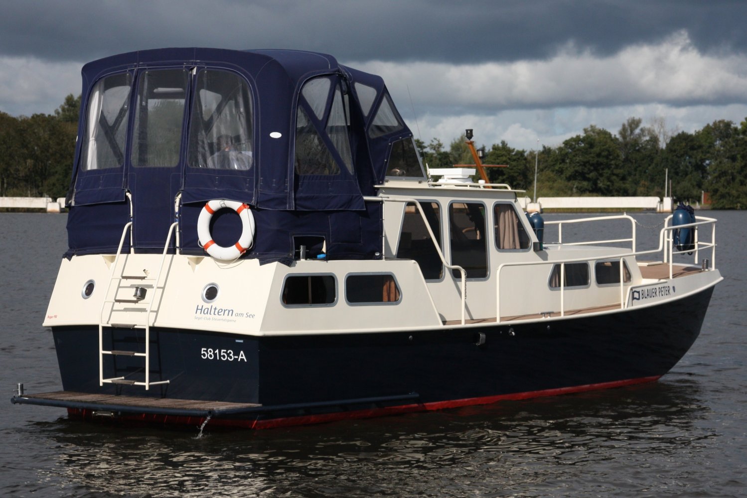 Op het achterdek vindt u nog een tweede stuurstand die volledig is overdekt dankzij de royale overkapping. Het interieur is logisch en functioneel ingedeeld, de voor en achterkajuit zijn beide voorzien van een half-vrijstaand bed met in de achterkajuit, over de lengte verdeeld, een badkamer voorzien van douche en toilet.