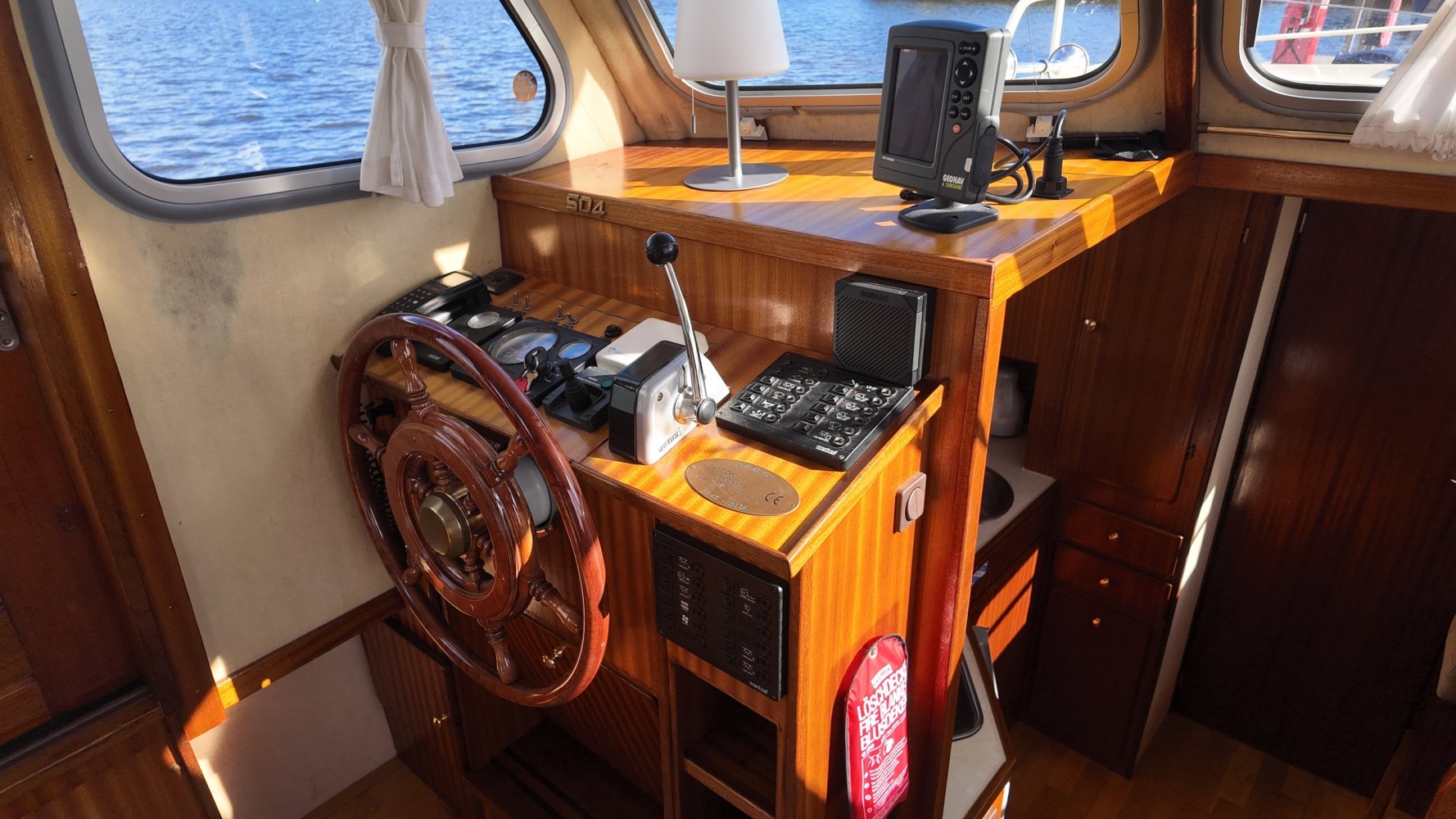 Dankzij de schuifdeur die zich op deze Rogger 950 AK naast de binnenstuurstand aan bakboordzijde bevindt heeft u de middenbolder binnen handbereik en is dit schip zeer gemakkelijk en veilig in uw ééntje aan te leggen.