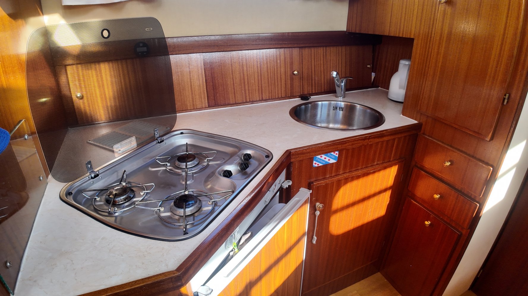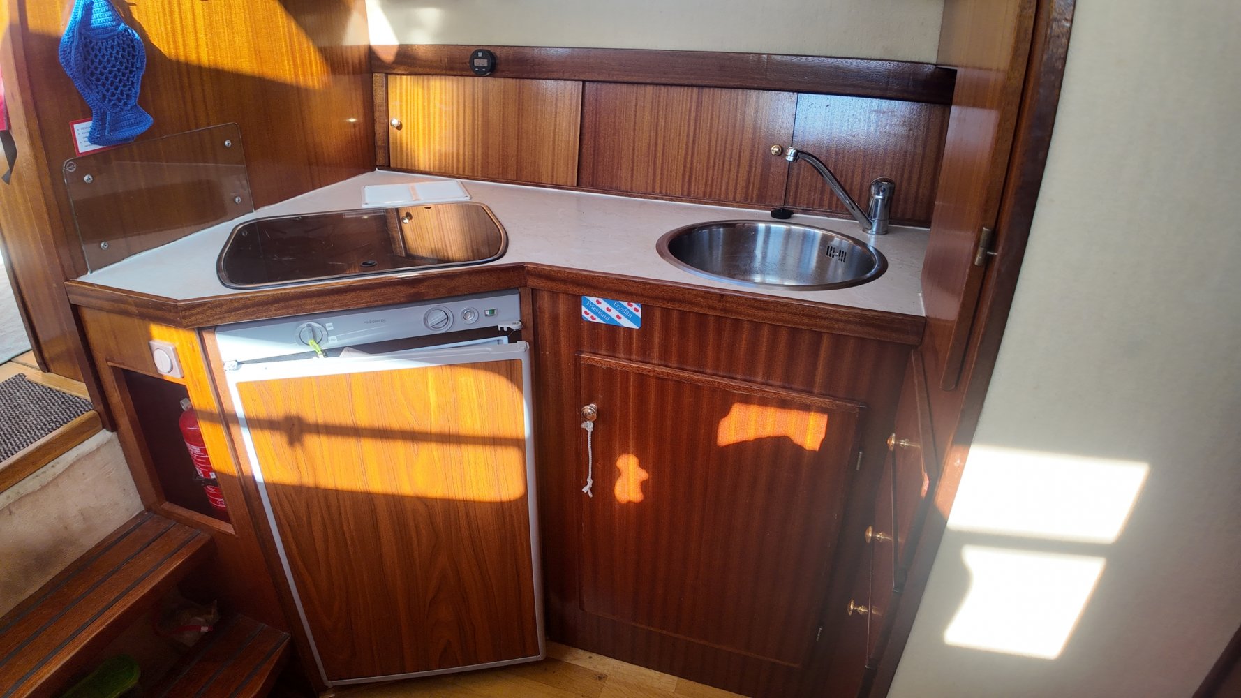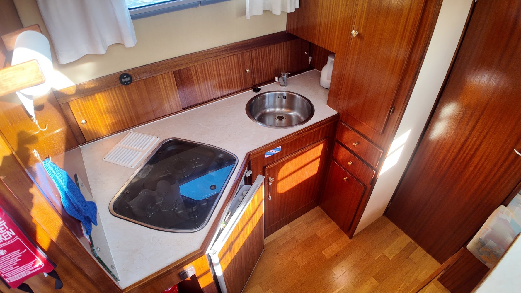 De salon beschikt over een ruime bank en de binnenstuurstand. Verder naar voren vindt u aan stuurboordzijde de dinette met aan de andere kant de keuken voorzien van een wastafel, koelkast en driepits gaskookplaat.