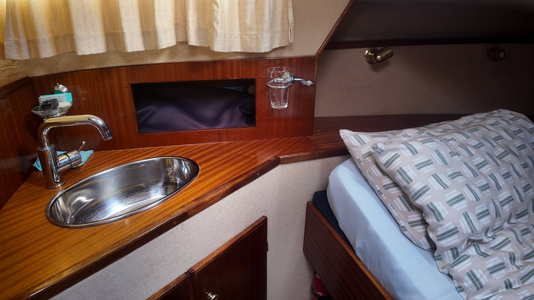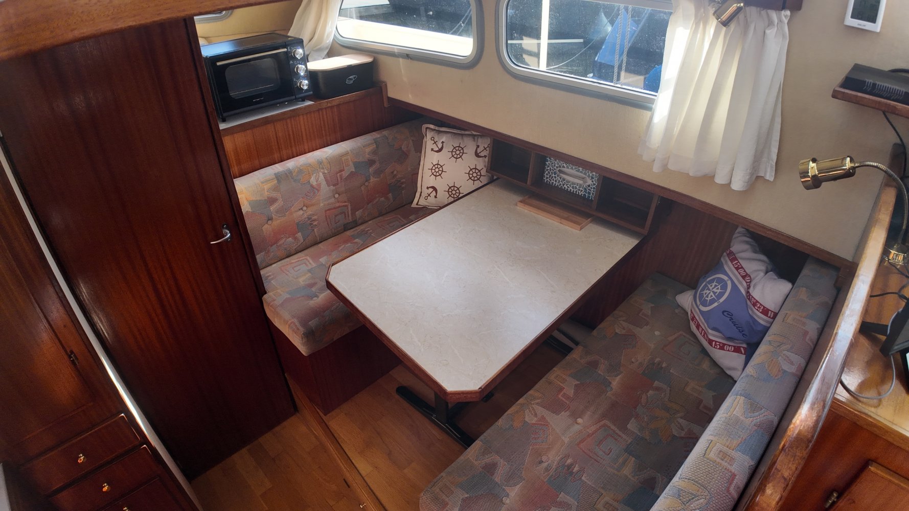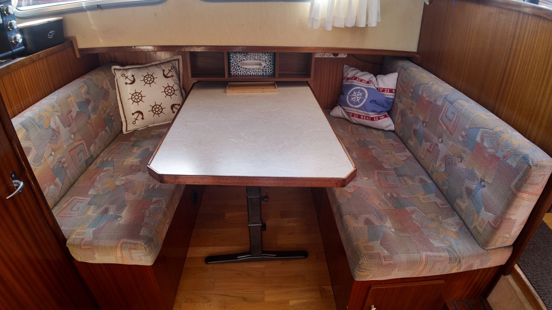 De salon beschikt over een ruime bank en de binnenstuurstand. Verder naar voren vindt u aan stuurboordzijde de dinette met aan de andere kant de keuken voorzien van een wastafel, koelkast en driepits gaskookplaat.