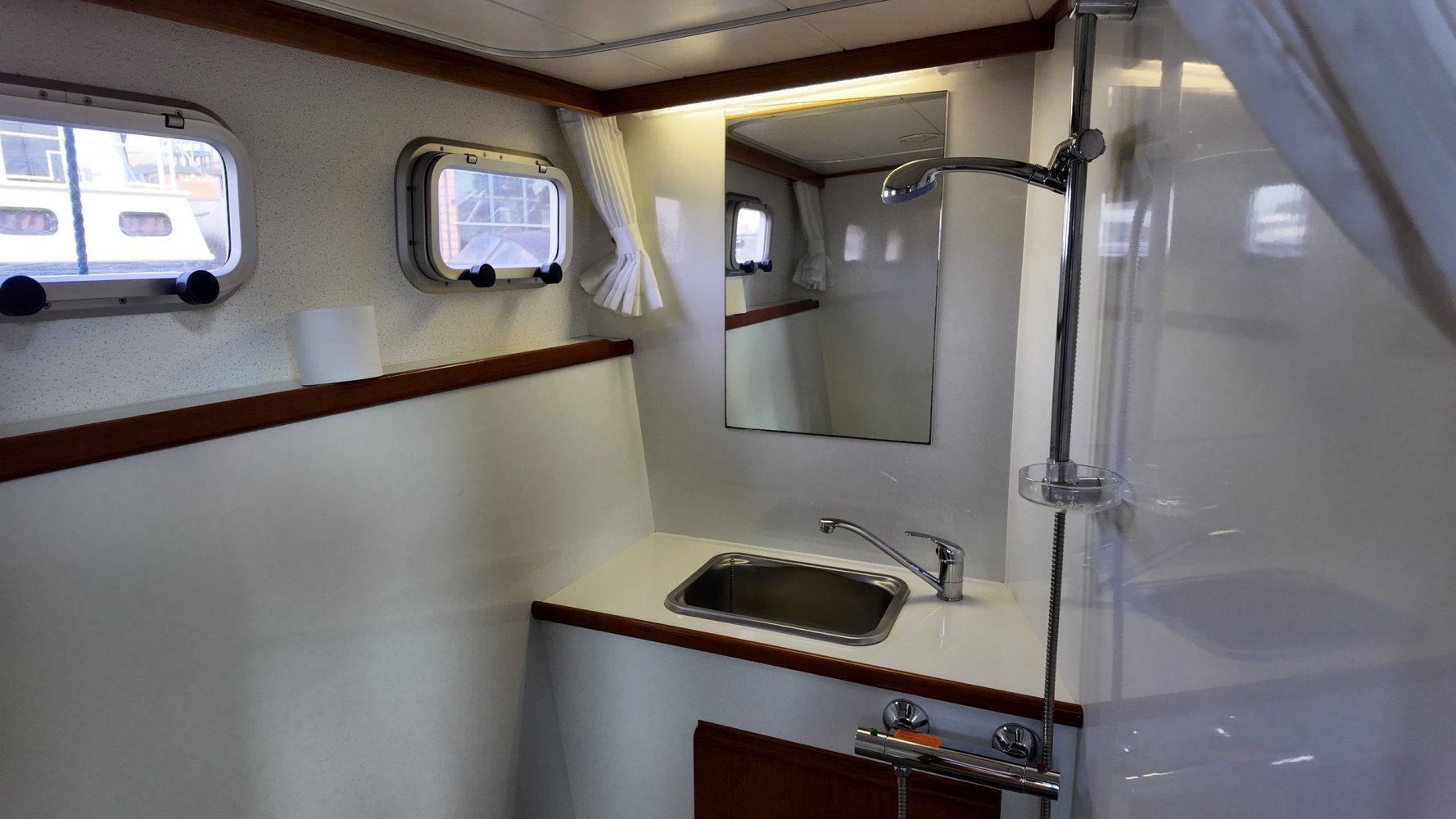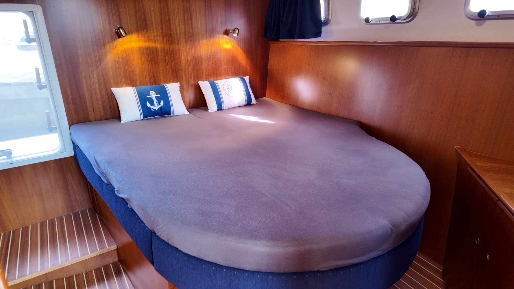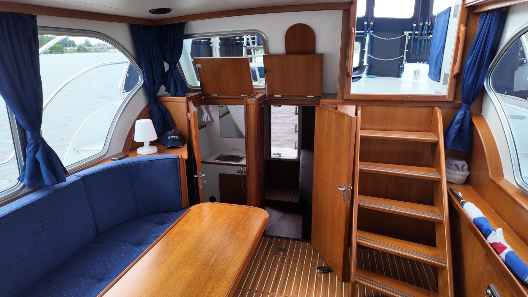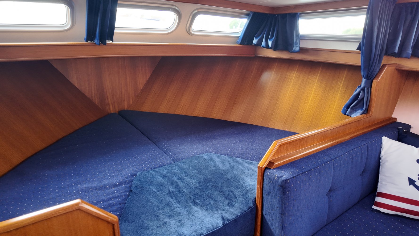 De stuurstand boven beschikt over een minimalistische doch functionele indeling. Via het luik waar u de kwaliteit van deze werfgebouwde Pedro gelijk al opmerkt loopt u met een trap de salon binnen. Deze beschikt over een binnenstuurstand en een ruime bank. Naar achteren toe vindt u aan stuurboordzijde de ingang naar de badkamer voorzien van douche en toilet. Daarnaast, midscheeps, vindt u de ingang naar de achterste slaapkamer. Deze beschikt over een half vrijstaand bed die nog wel zo gepositioneerd is dat u niet over uw partner hoeft te klimmen wanneer u 's nachts van bed moet.
