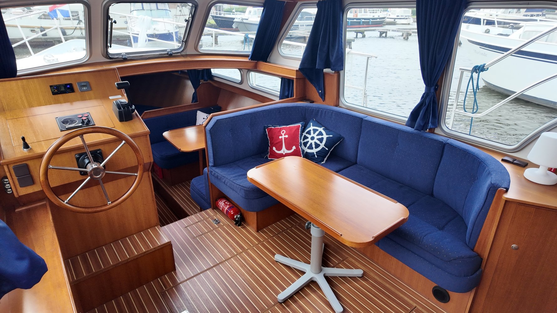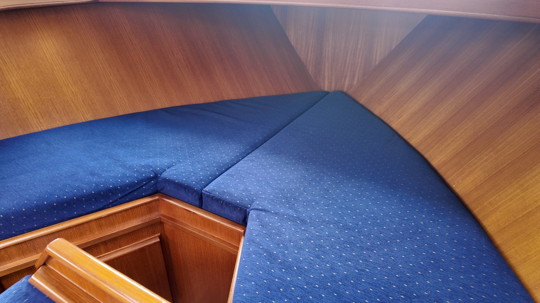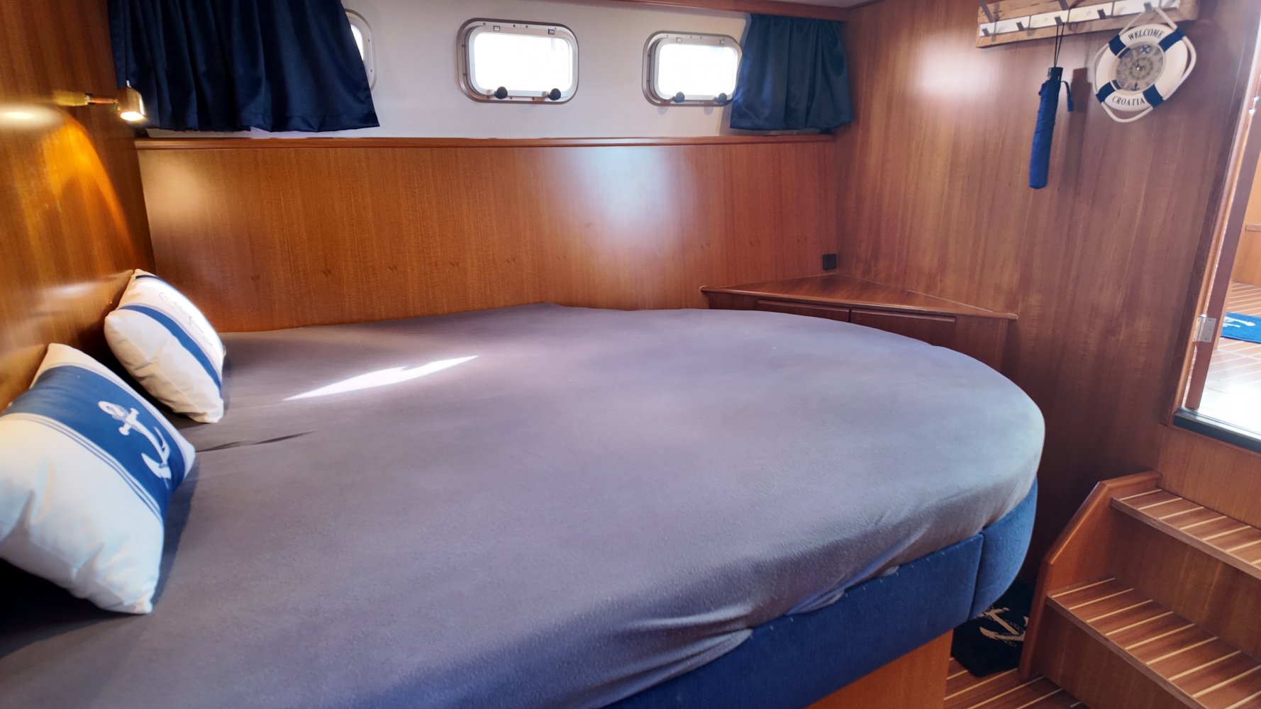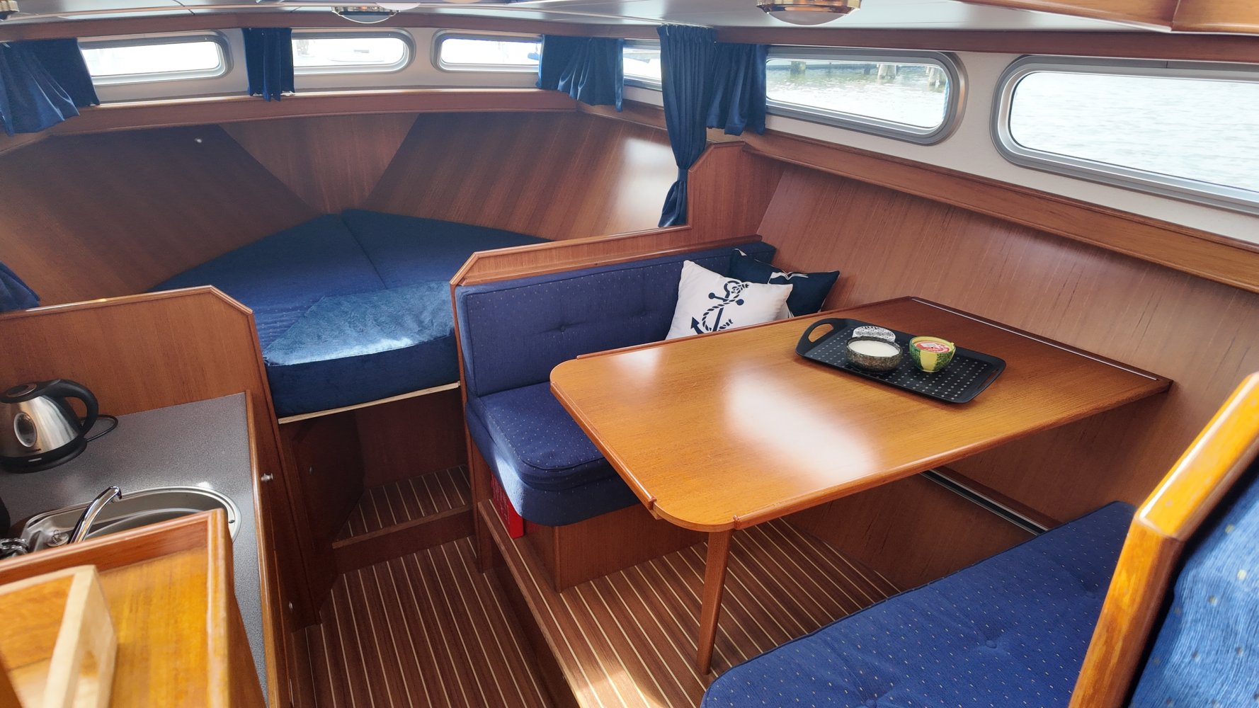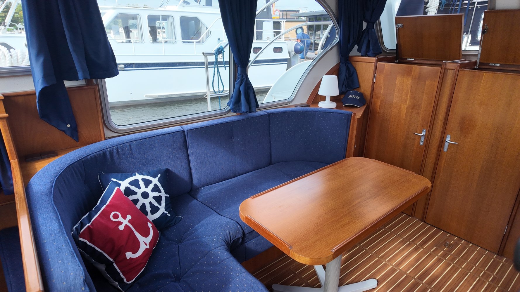 De stuurstand boven beschikt over een minimalistische doch functionele indeling. Via het luik waar u de kwaliteit van deze werfgebouwde Pedro gelijk al opmerkt loopt u met een trap de salon binnen. Deze beschikt over een binnenstuurstand en een ruime bank. Naar achteren toe vindt u aan stuurboordzijde de ingang naar de badkamer voorzien van douche en toilet. Daarnaast, midscheeps, vindt u de ingang naar de achterste slaapkamer. Deze beschikt over een half vrijstaand bed die nog wel zo gepositioneerd is dat u niet over uw partner hoeft te klimmen wanneer u 's nachts van bed moet.