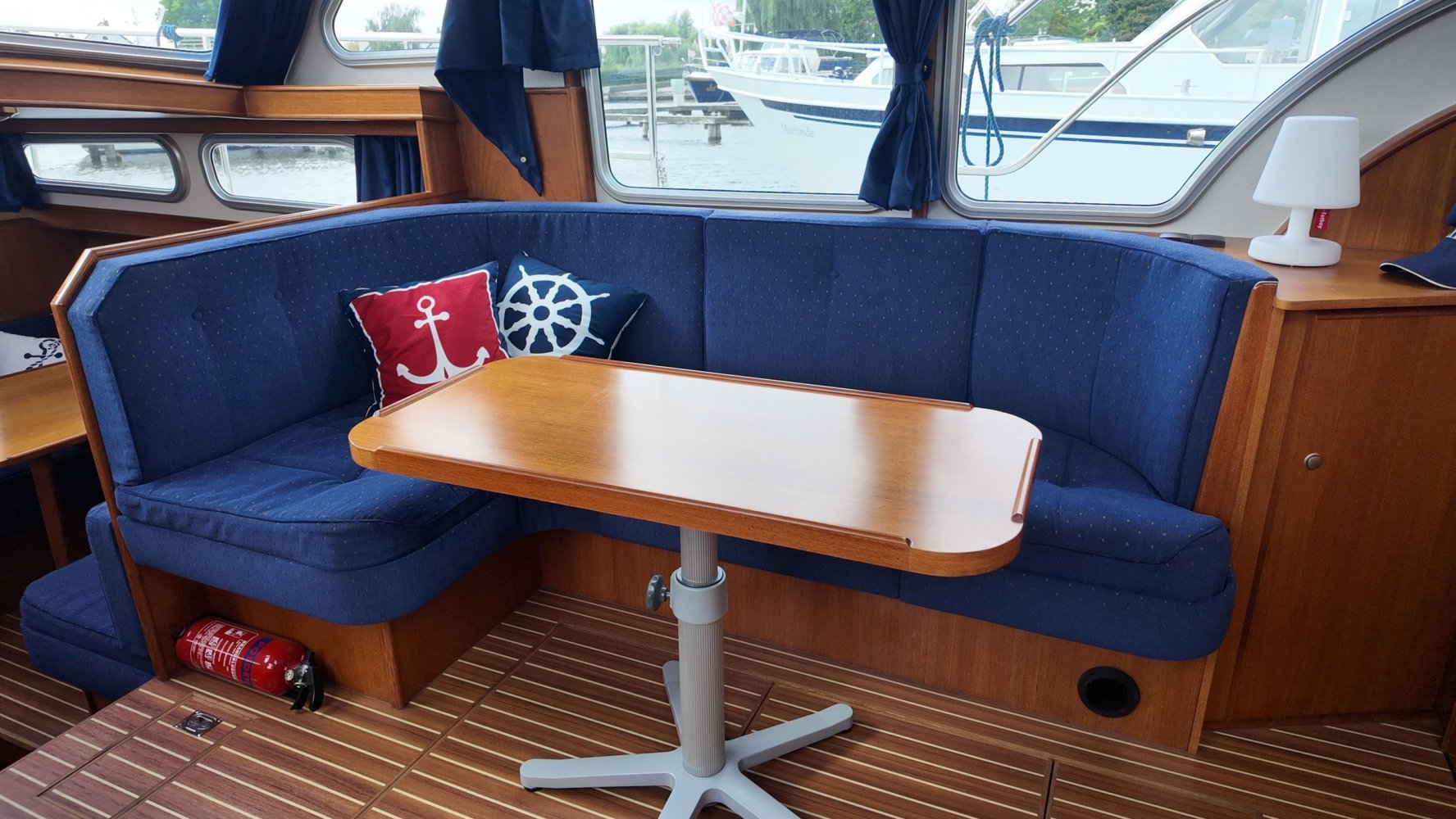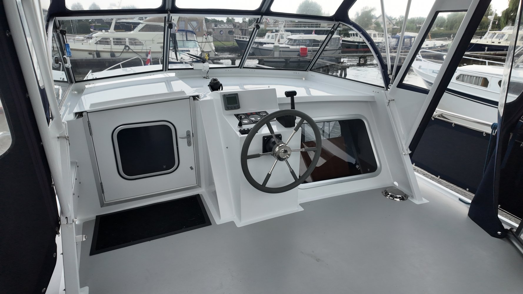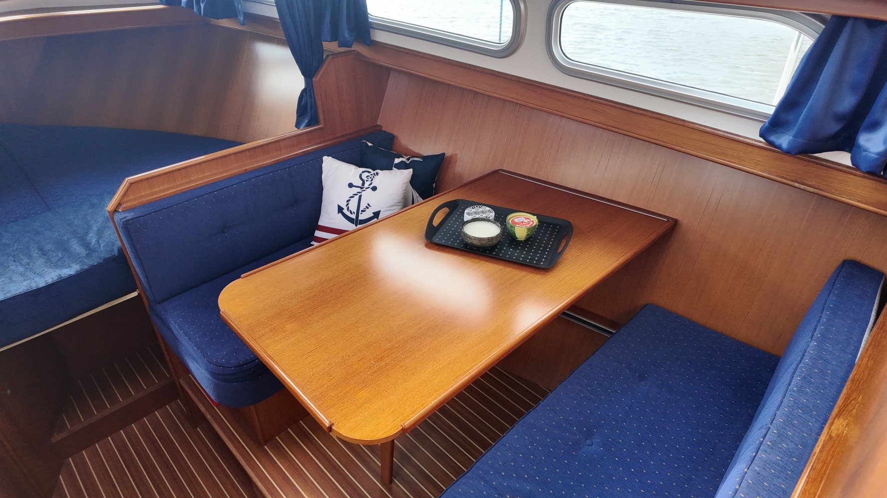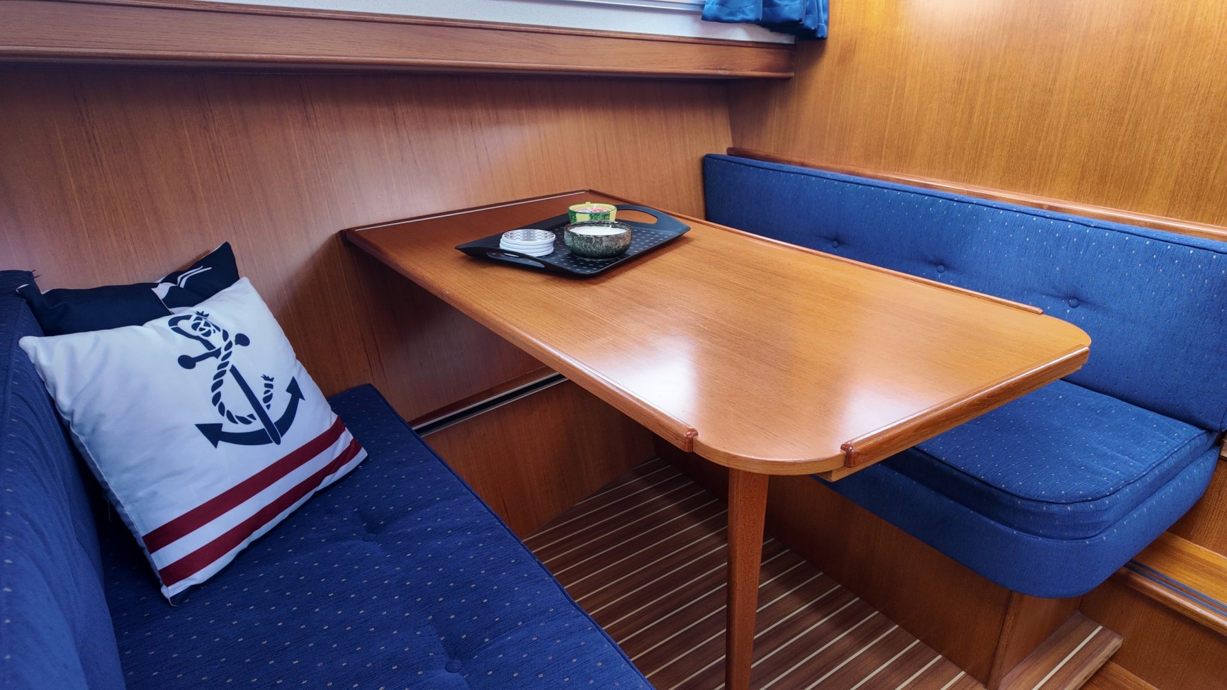 De stuurstand boven beschikt over een minimalistische doch functionele indeling. Via het luik waar u de kwaliteit van deze werfgebouwde Pedro gelijk al opmerkt loopt u met een trap de salon binnen. Deze beschikt over een binnenstuurstand en een ruime bank. Naar achteren toe vindt u aan stuurboordzijde de ingang naar de badkamer voorzien van douche en toilet. Daarnaast, midscheeps, vindt u de ingang naar de achterste slaapkamer. Deze beschikt over een half vrijstaand bed die nog wel zo gepositioneerd is dat u niet over uw partner hoeft te klimmen wanneer u 's nachts van bed moet.