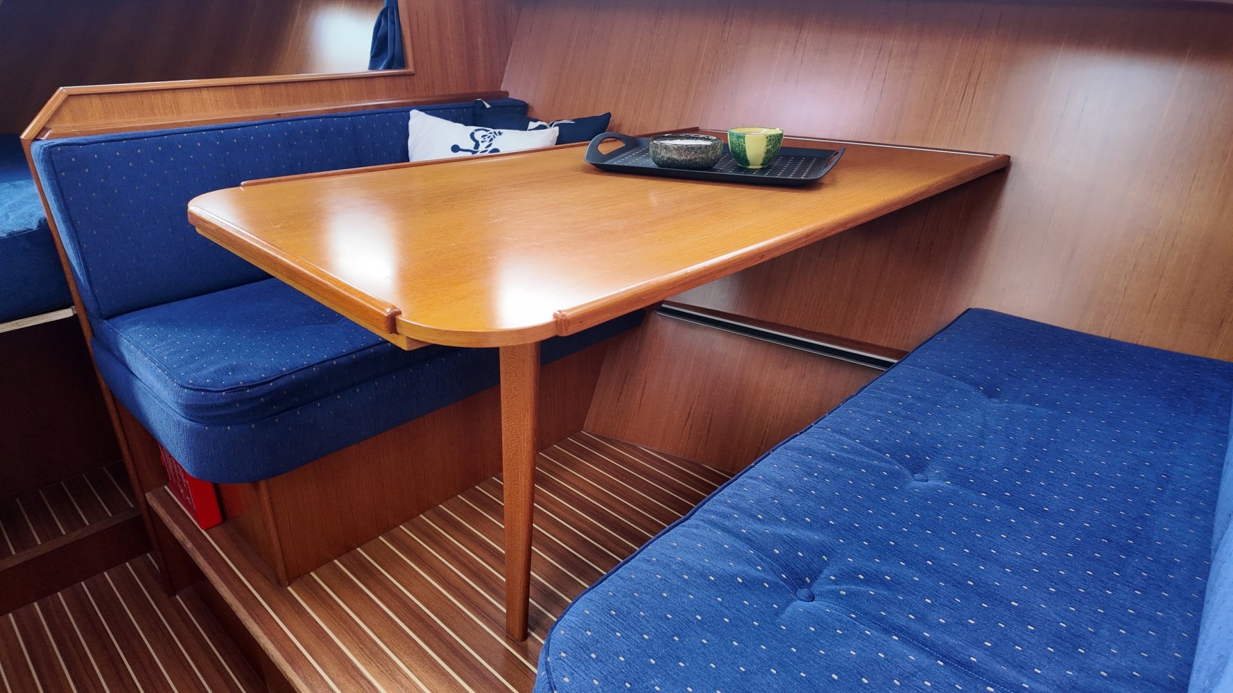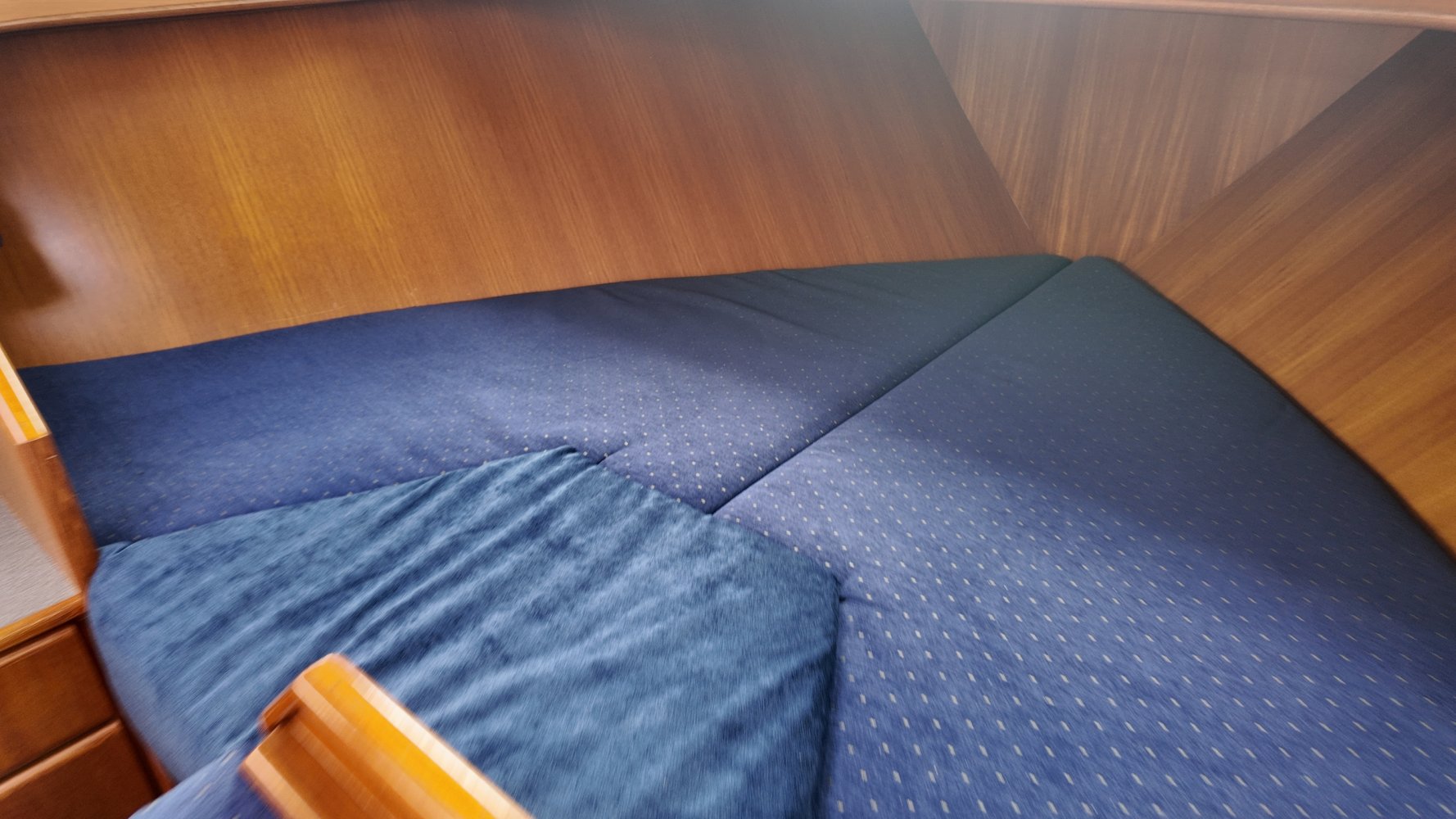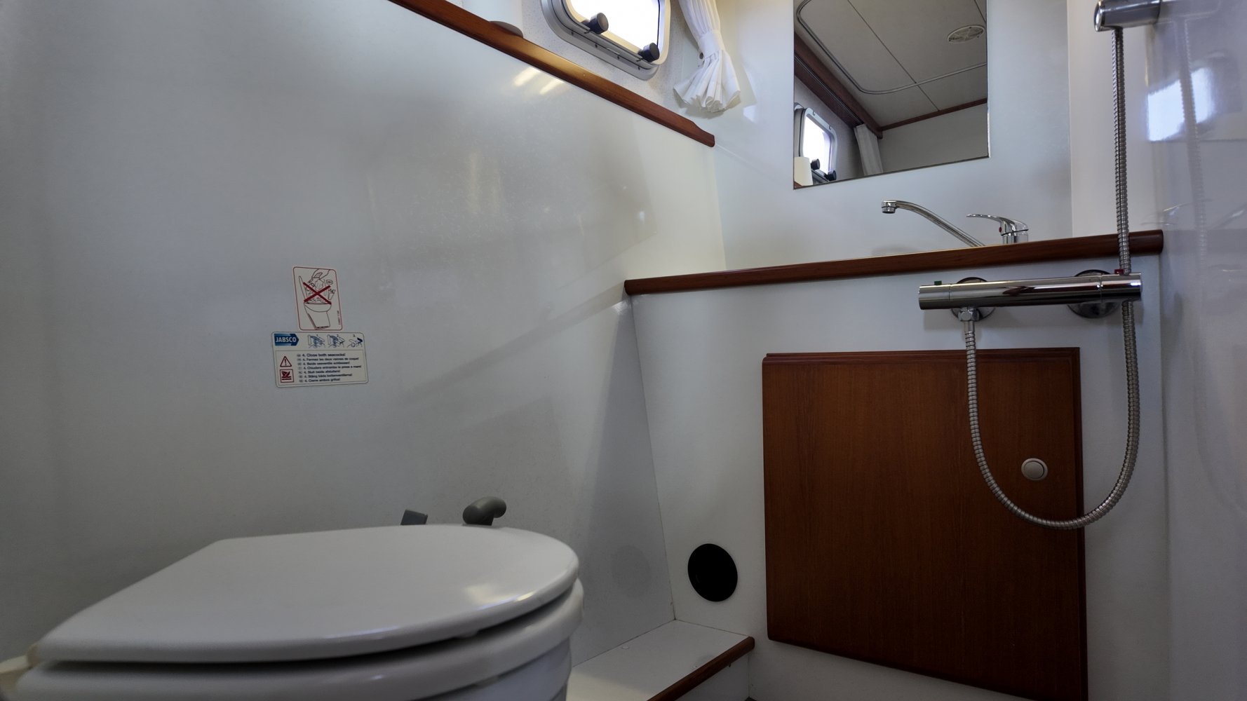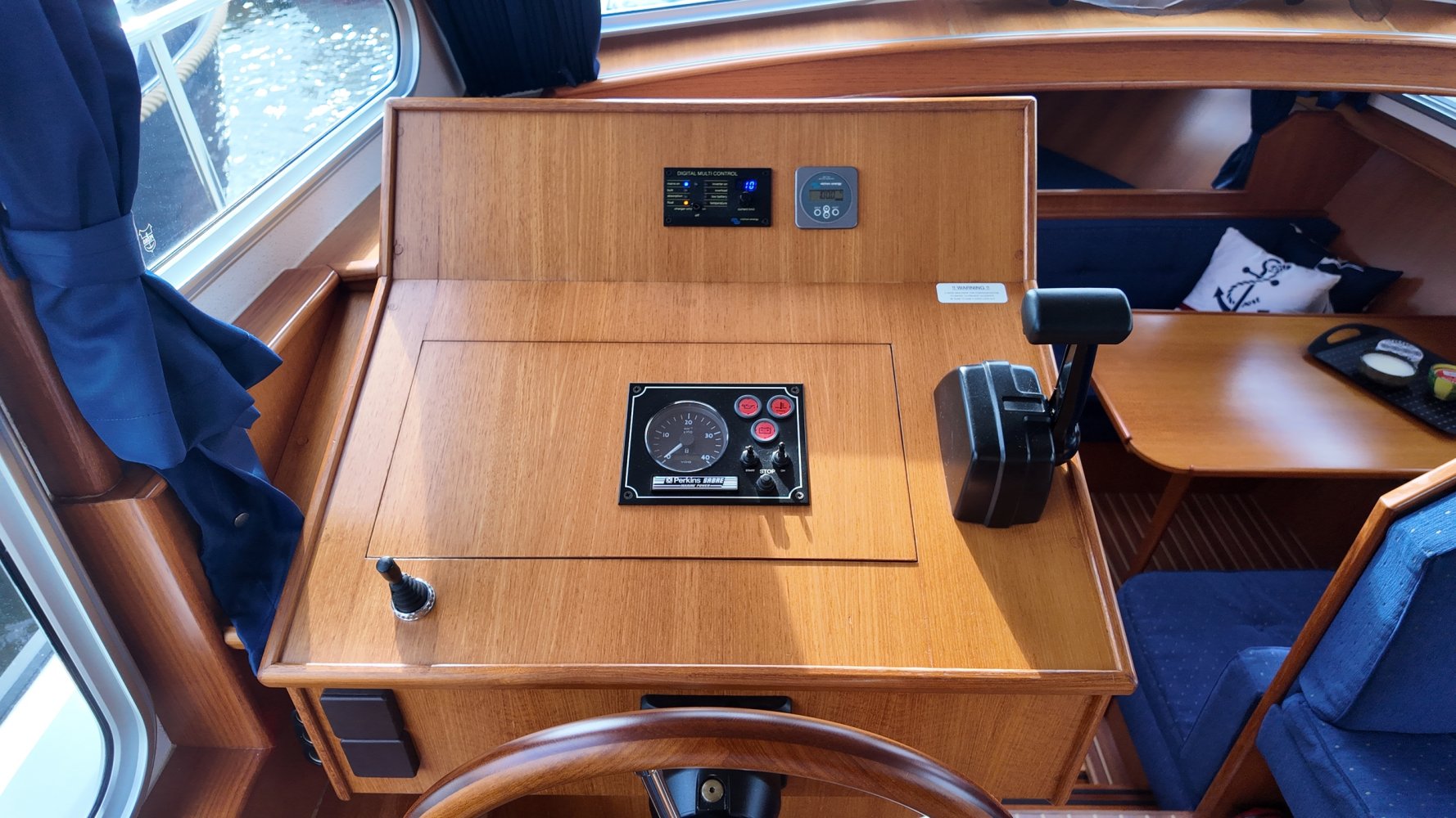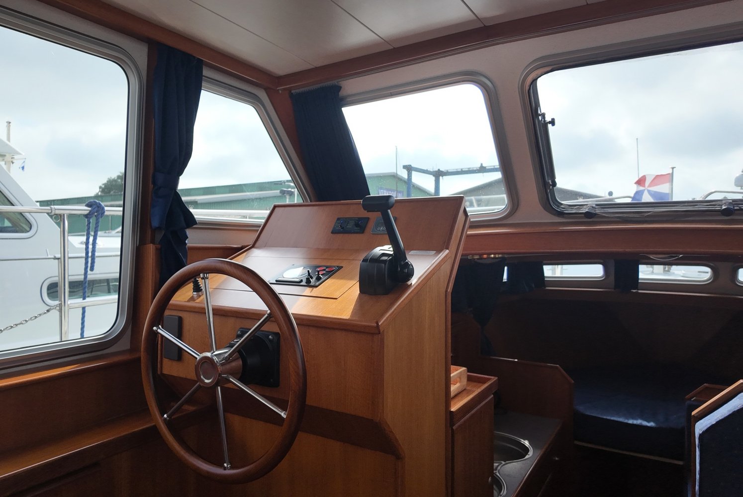 De stuurstand boven beschikt over een minimalistische doch functionele indeling. Via het luik waar u de kwaliteit van deze werfgebouwde Pedro gelijk al opmerkt loopt u met een trap de salon binnen. Deze beschikt over een binnenstuurstand en een ruime bank. Naar achteren toe vindt u aan stuurboordzijde de ingang naar de badkamer voorzien van douche en toilet. Daarnaast, midscheeps, vindt u de ingang naar de achterste slaapkamer. Deze beschikt over een half vrijstaand bed die nog wel zo gepositioneerd is dat u niet over uw partner hoeft te klimmen wanneer u 's nachts van bed moet.