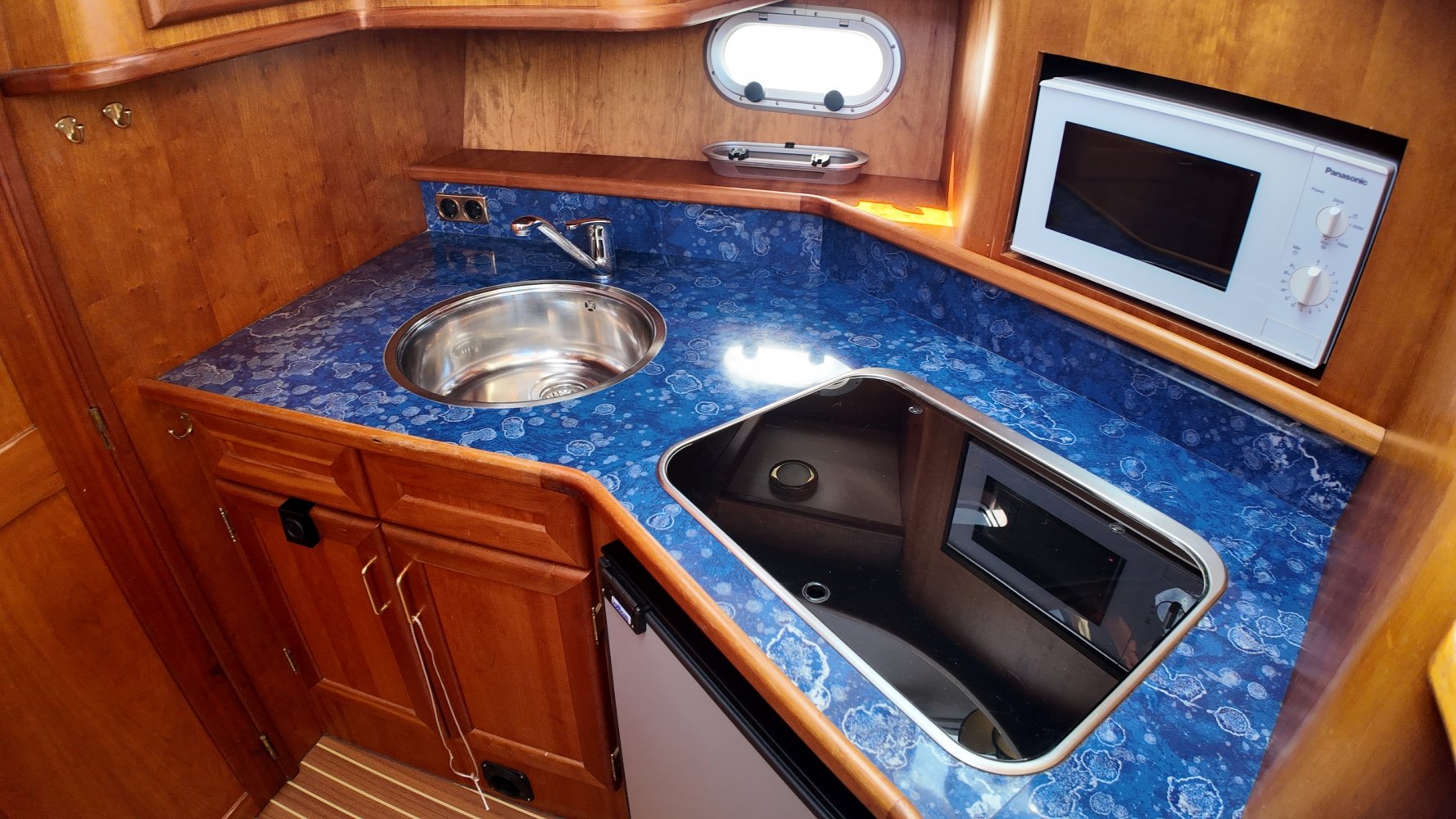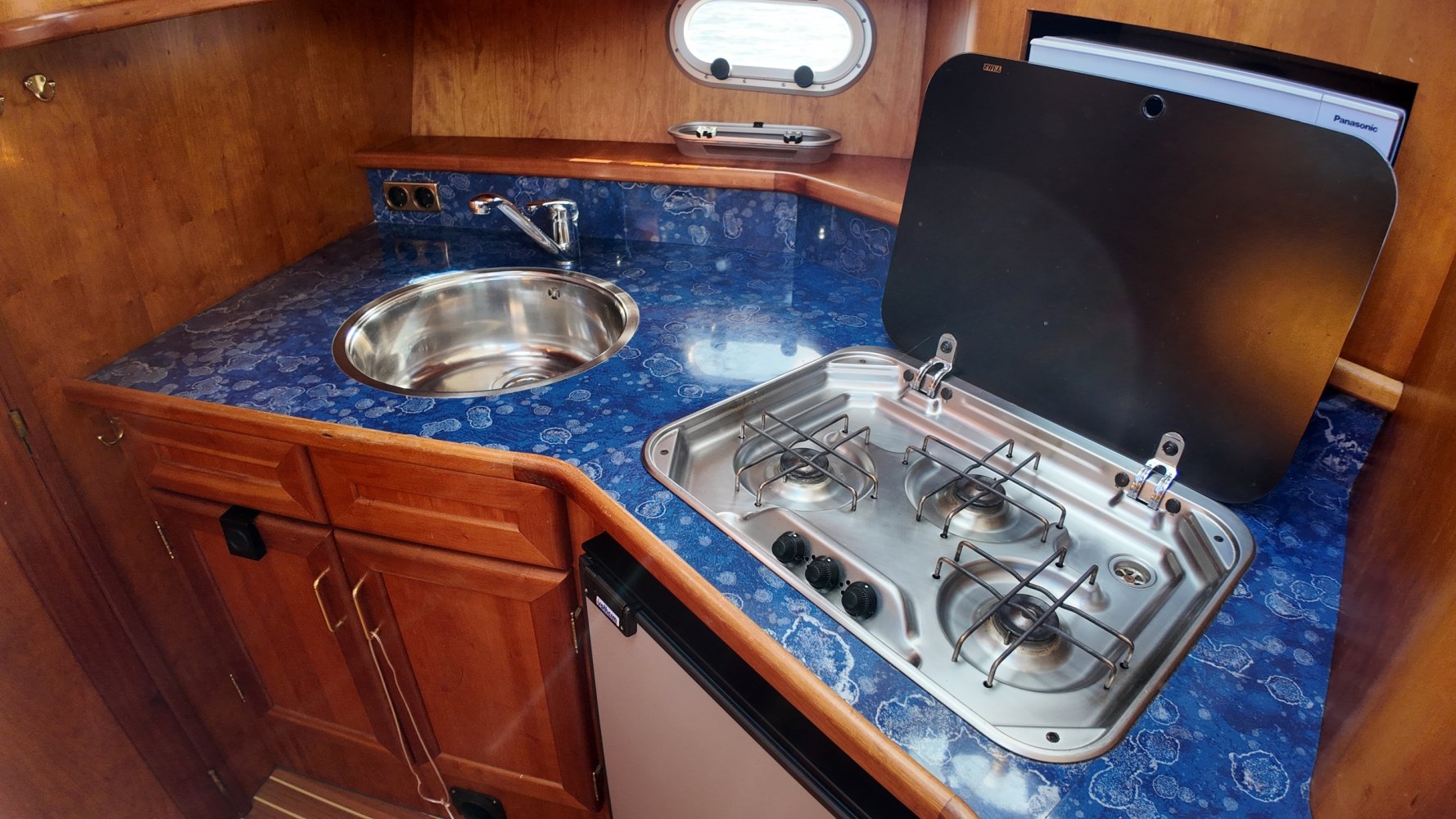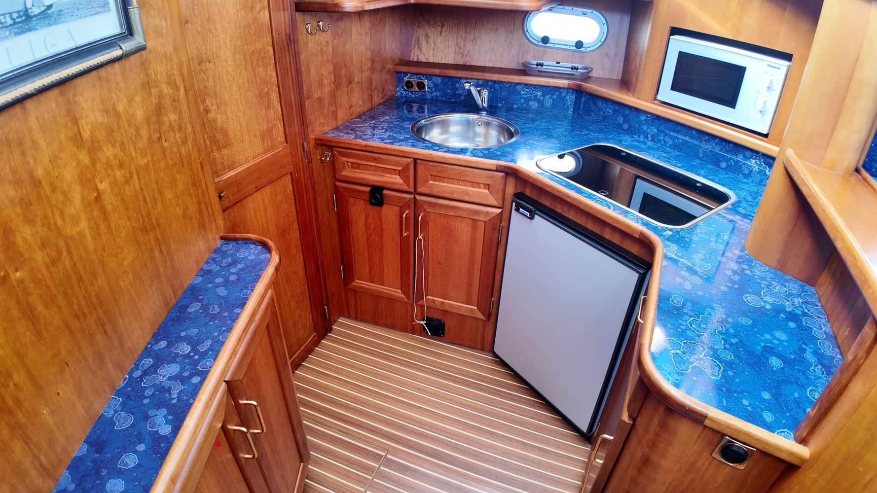 Voorin de salon bevindt zich de keuken, deze is voldoende uitgerust met onder andere een drie pits gaskookplaat, wastafel, koelkast en magnetron. Boven de keuken bevindt zich een klein dakraam die de geuren tijdens het koken af kan voeren.