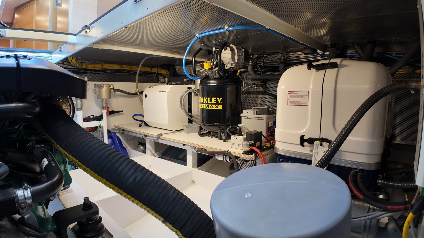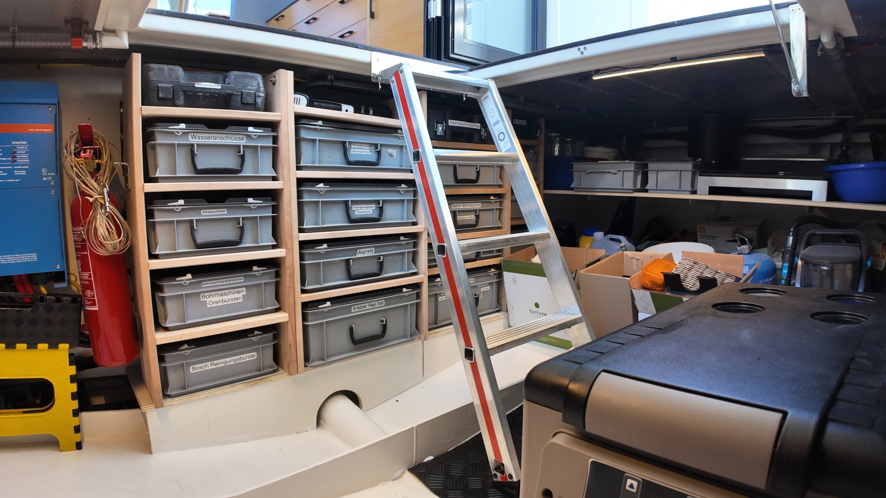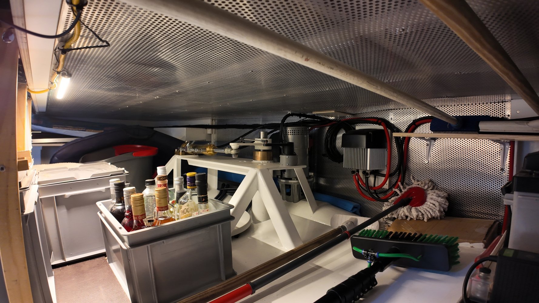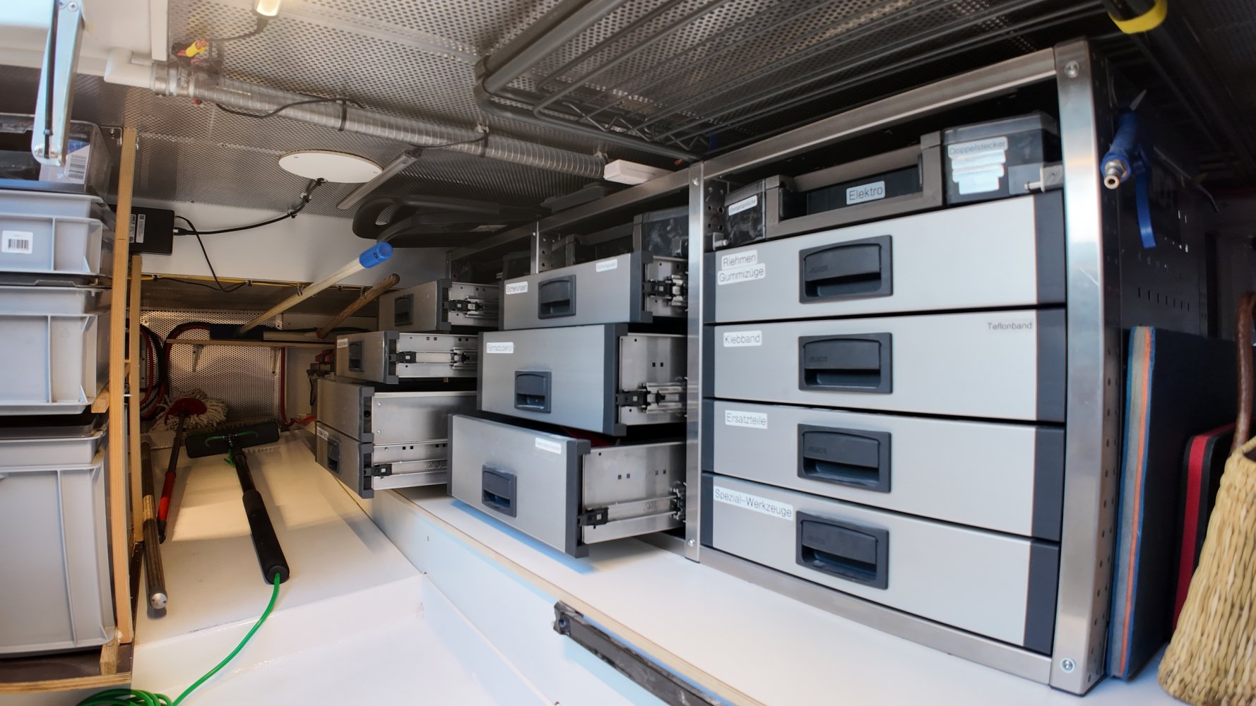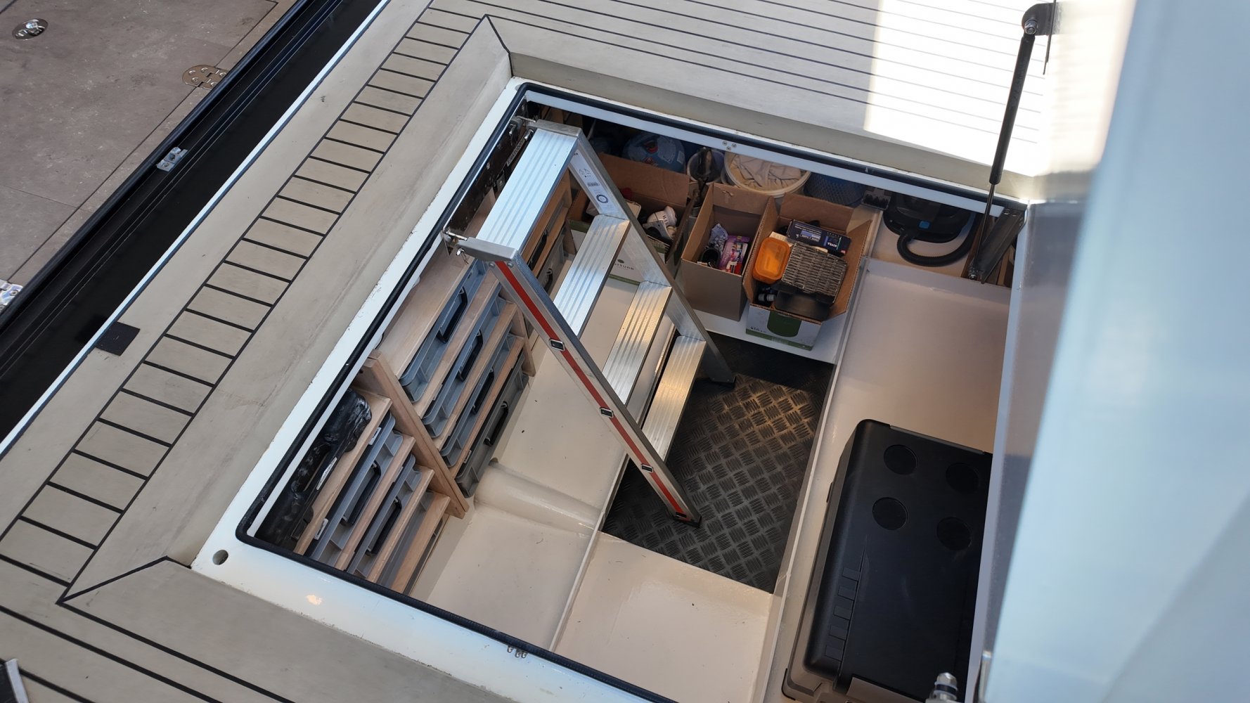 Bergruimte in de kuip voorzien van ingenieus opbergsysteem voor gereedschap, reserve delen etc etc.
