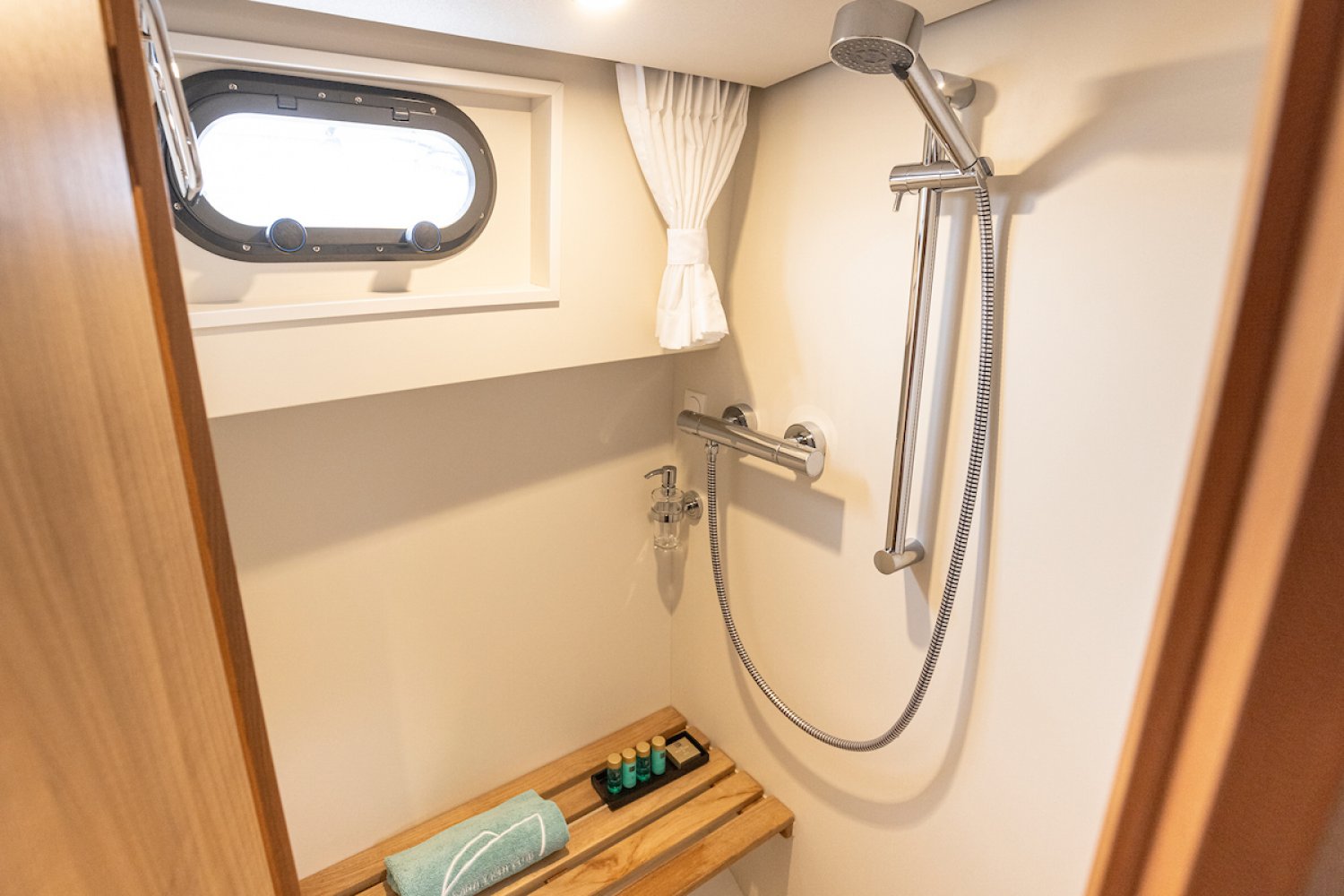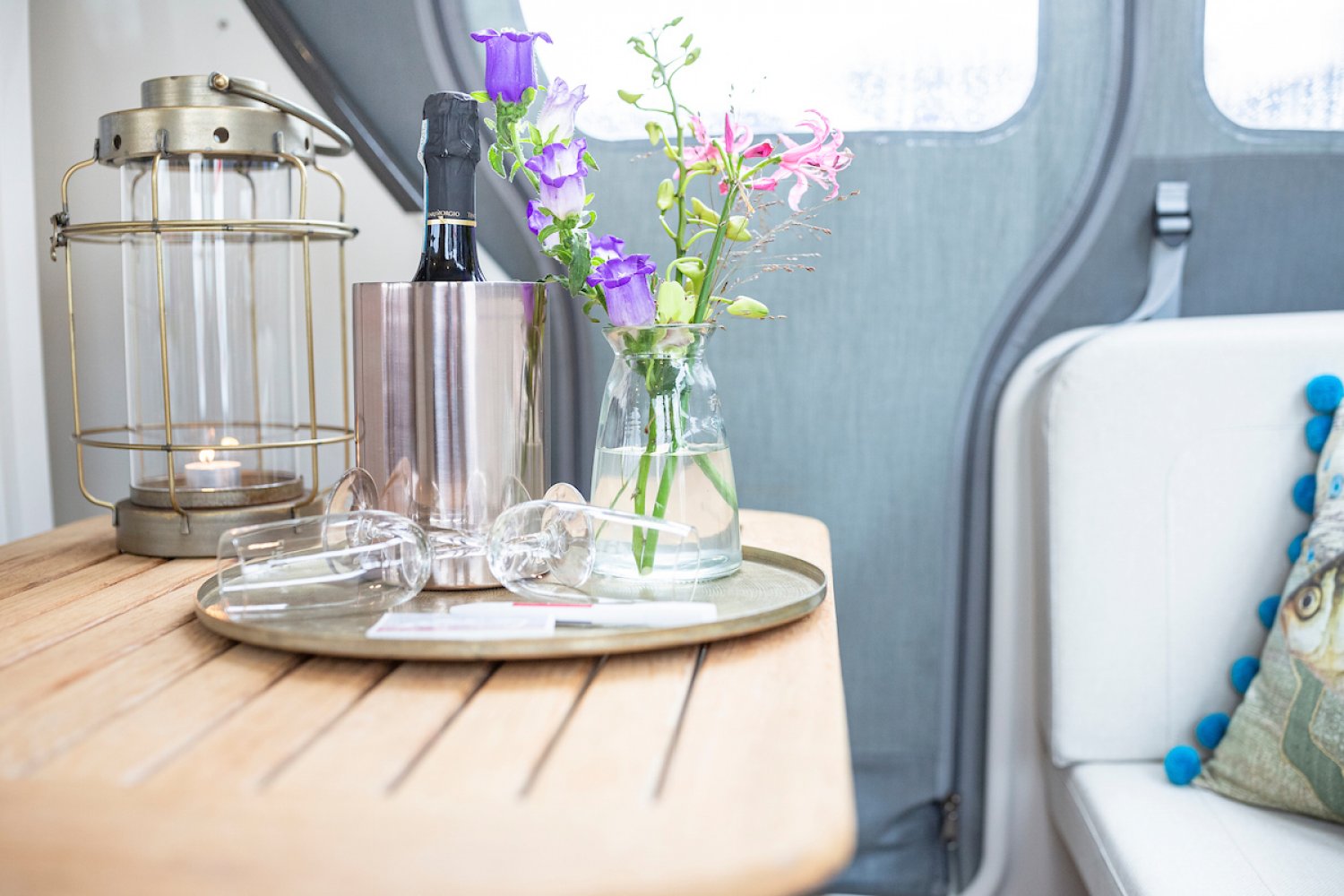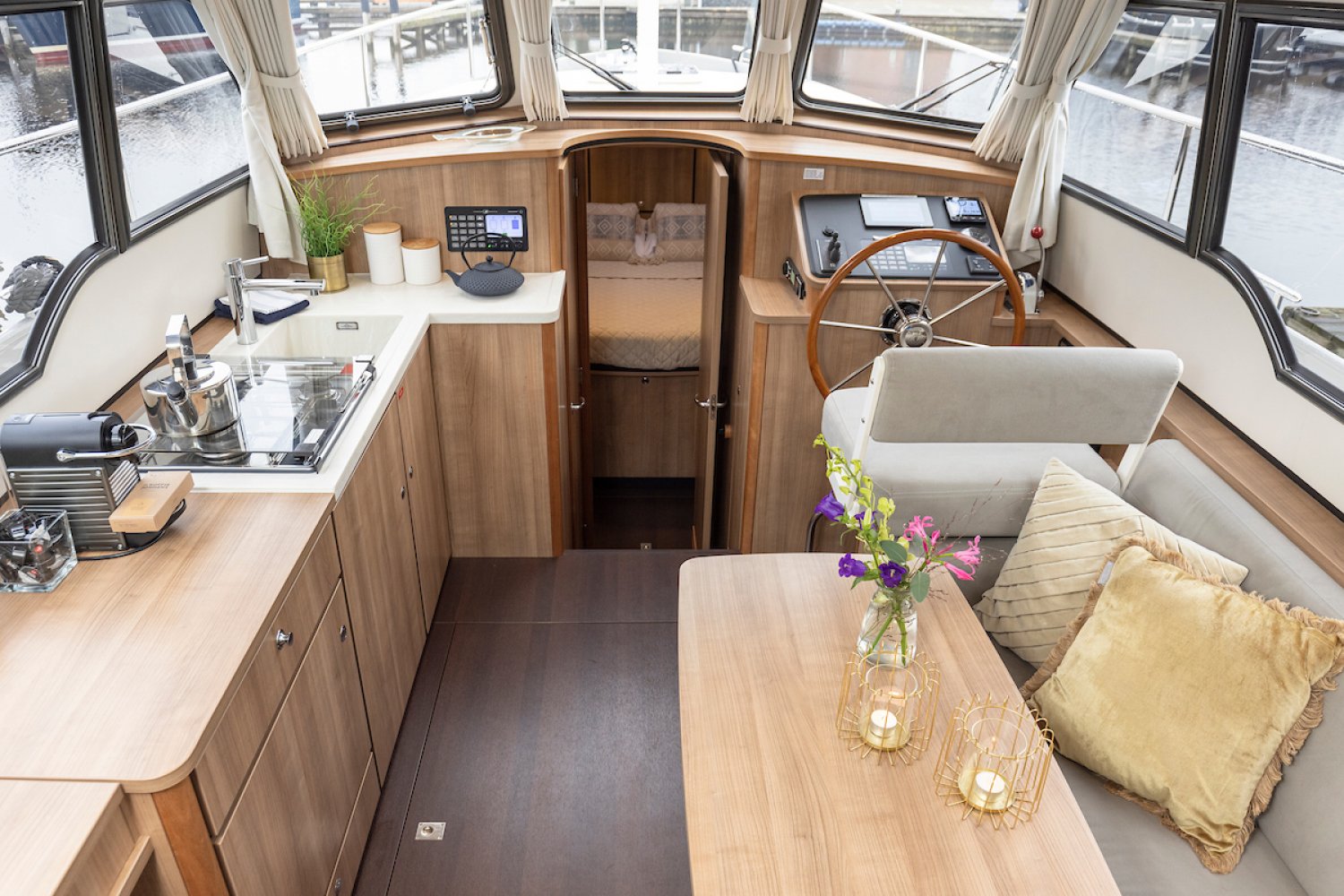 In der gemütlichen, offenen Plicht, wo der Kontakt mit dem Wasser optimal ist, lässt sich die Umgebung wunderbar genießen. Dank einer Tür im Heckspiegel können Sie bequem an Bord oder zurück an Land gehen. Da sich die Küche oben im Salon befindet, haben Sie immer ein kühles Getränk zur Hand, wenn Sie draußen im Cockpit das schöne Leben genießen. Außerdem haben Sie bei der Zubereitung einer Mahlzeit eine schöne Aussicht. Genießen Sie die Mahlzeit auf der gemütlichen Essecke/Salonsofa, von der aus Sie ebenfalls einen guten Blick nach draußen haben. Nach einem schönen Tag voller Eindrücke können Sie sich in der Eignerkabine auf einem leicht zugänglichen und bequemen, freistehenden Bett ausruhen, und beide Nasszellen haben ein eigenes Bad.