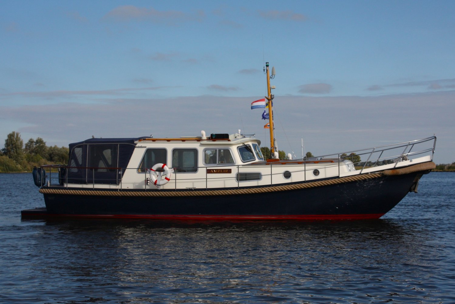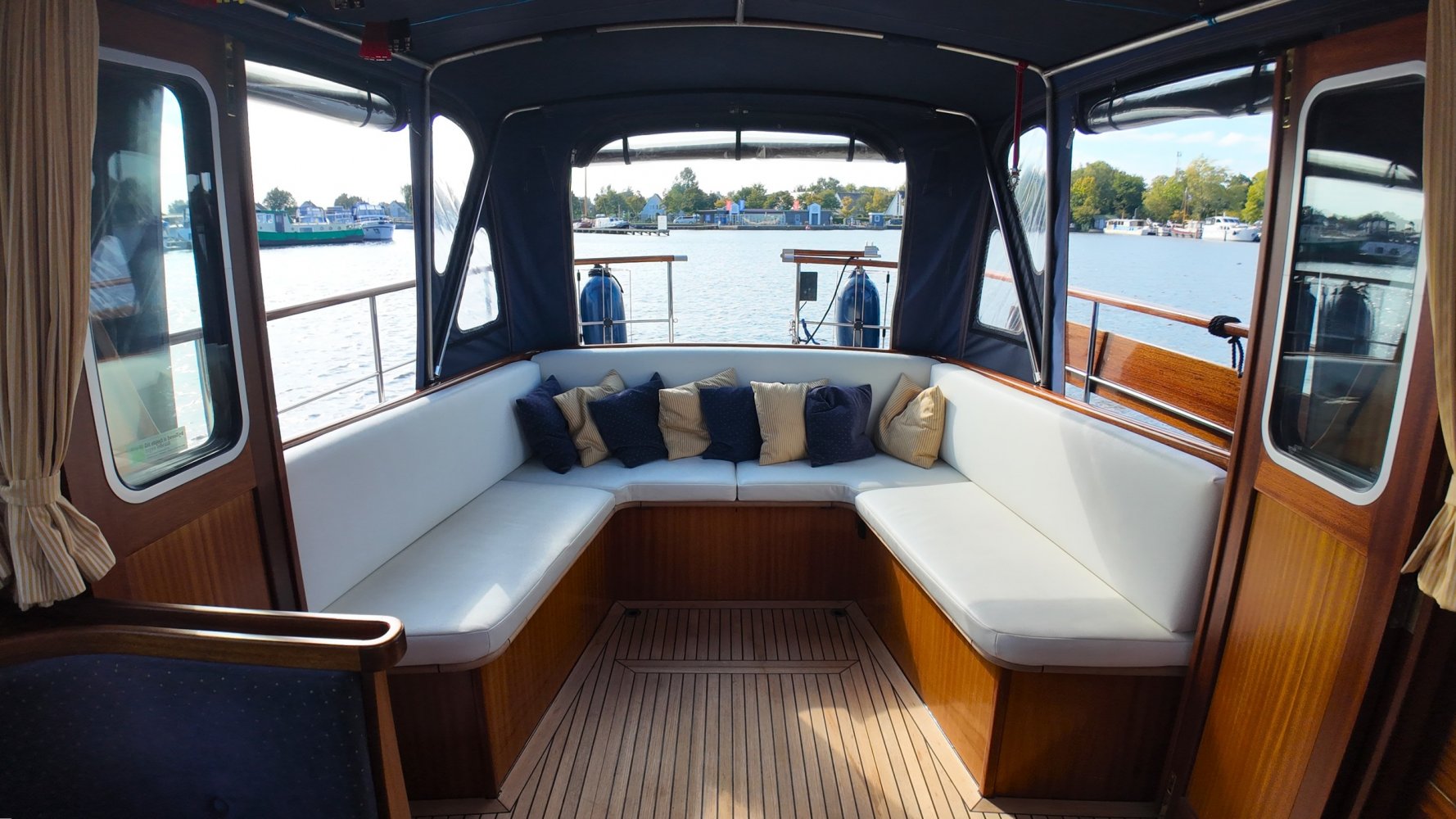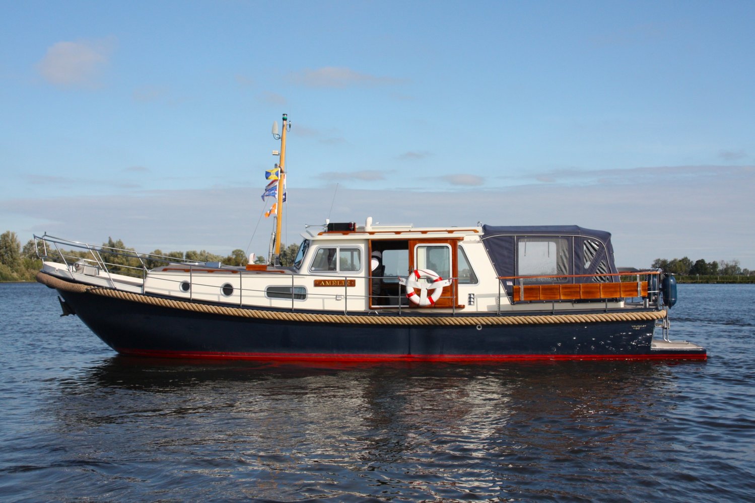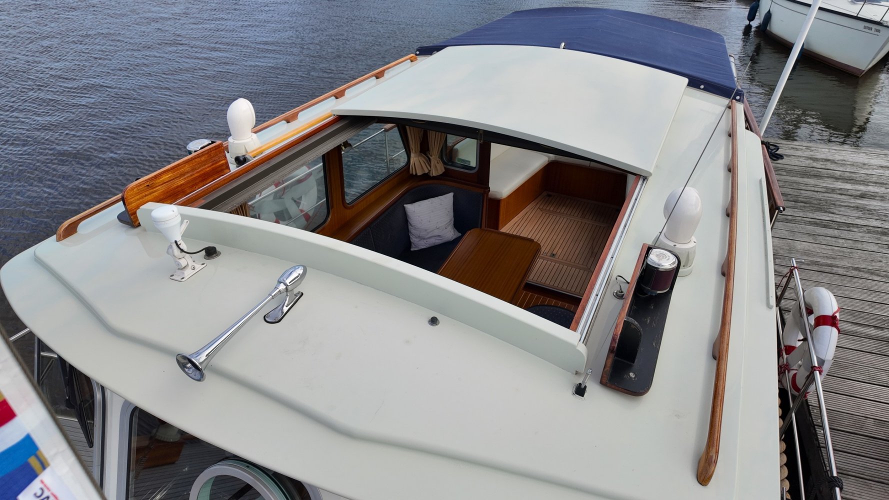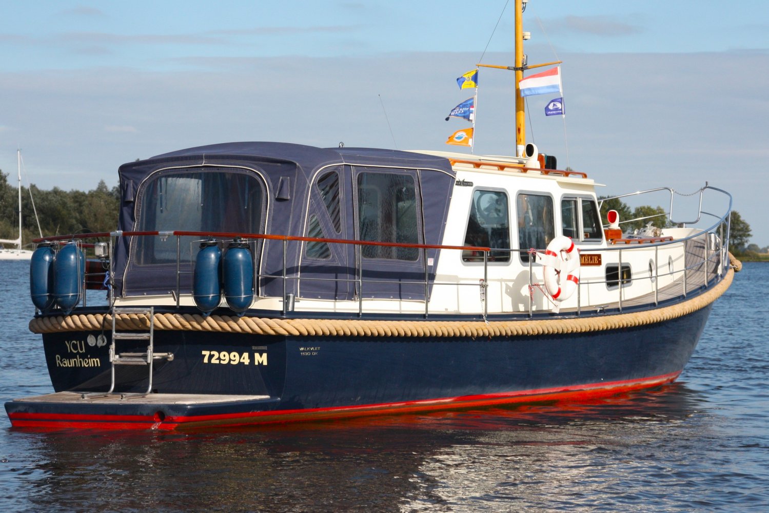 Sehr voll ausgestattet und gut gepflegt Valkvlet 11.30 OK. Dies ist definitiv eine einzigartige Valkvlet. Mehrere Valkvlets sind durch unsere Hände 'gegangen', allesamt Liebhaberschiffe, die meisten auch im Valk Yachts Club untergebracht. Diese Valkvlet 11.30 OK unterscheidet sich von den meisten anderen 11.30 OK durch die seitliche Schiebetür, die Gangborde, die um das offene Cockpit herumführen, und die Badeplattform. Die seitliche Schiebetür macht das Einsteigen in die Valkvlet viel einfacher als das Klettern über den Rand des offenen Cockpits. Der Vorteil der durchgehenden Gangborde ist natürlich der hohe Komfort beim Anlegen usw. Die offene Plicht ist mit einer schönen U-förmigen Sitzbank ausgestattet. Mit dem passenden Tisch können Sie mit der gesamten Reisegruppe wunderbar 'dinieren', ohne dass die Tische zu weit von Ihnen und Ihren Gästen entfernt sind. Diese sehr gepflegte Valkvlet 11.30 OK ist besonders gut mit Optionen und Extras ausgestattet. Das Boot verfügt über Doppelverglasung, eine schöne Teak-/Mahagonivertäfelung, ein Bug- und Heckstrahlruder, eine Innen- und Außendusche (Badeplattform), ein komplettes Arsenal an Navigationsausrüstung, einschließlich eines Autopiloten mit Fernbedienung, und sogar eine Waschmaschine.Genießen Sie die Bilder und das Video dieses Schiffes und wenn Sie trotz unserer recht vollständigen Beschreibung des Schiffes noch Fragen haben oder so neugierig geworden sind, dass Sie einen Besichtigungstermin für die "Amelie" vereinbaren möchten, wenden Sie sich bitte an unser enthusiastisches Verkaufsteam unter: +31566-769009.