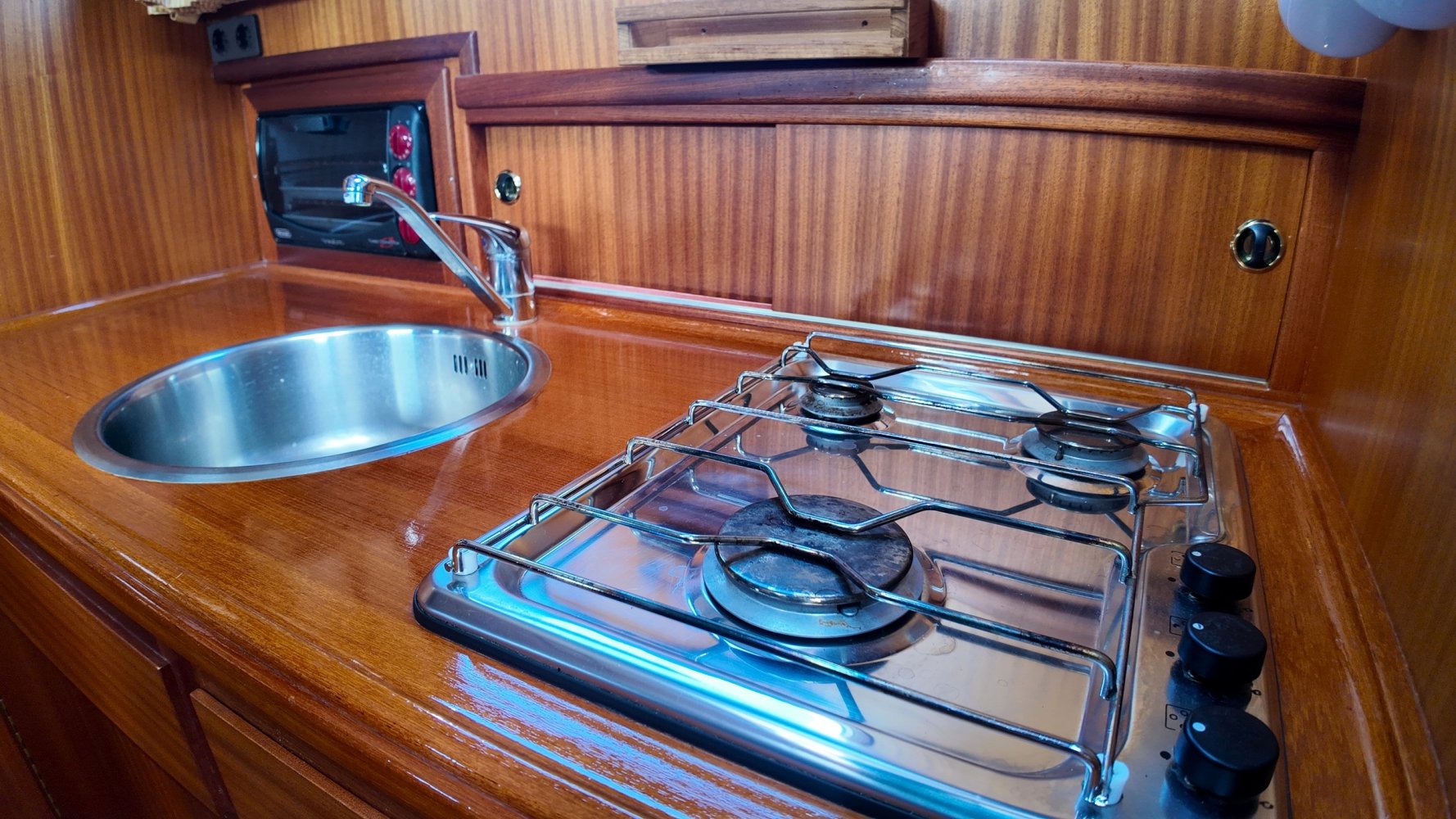 Edelstahl mit Holzplatte um die Wanne.