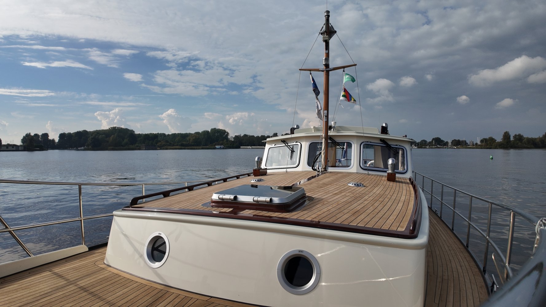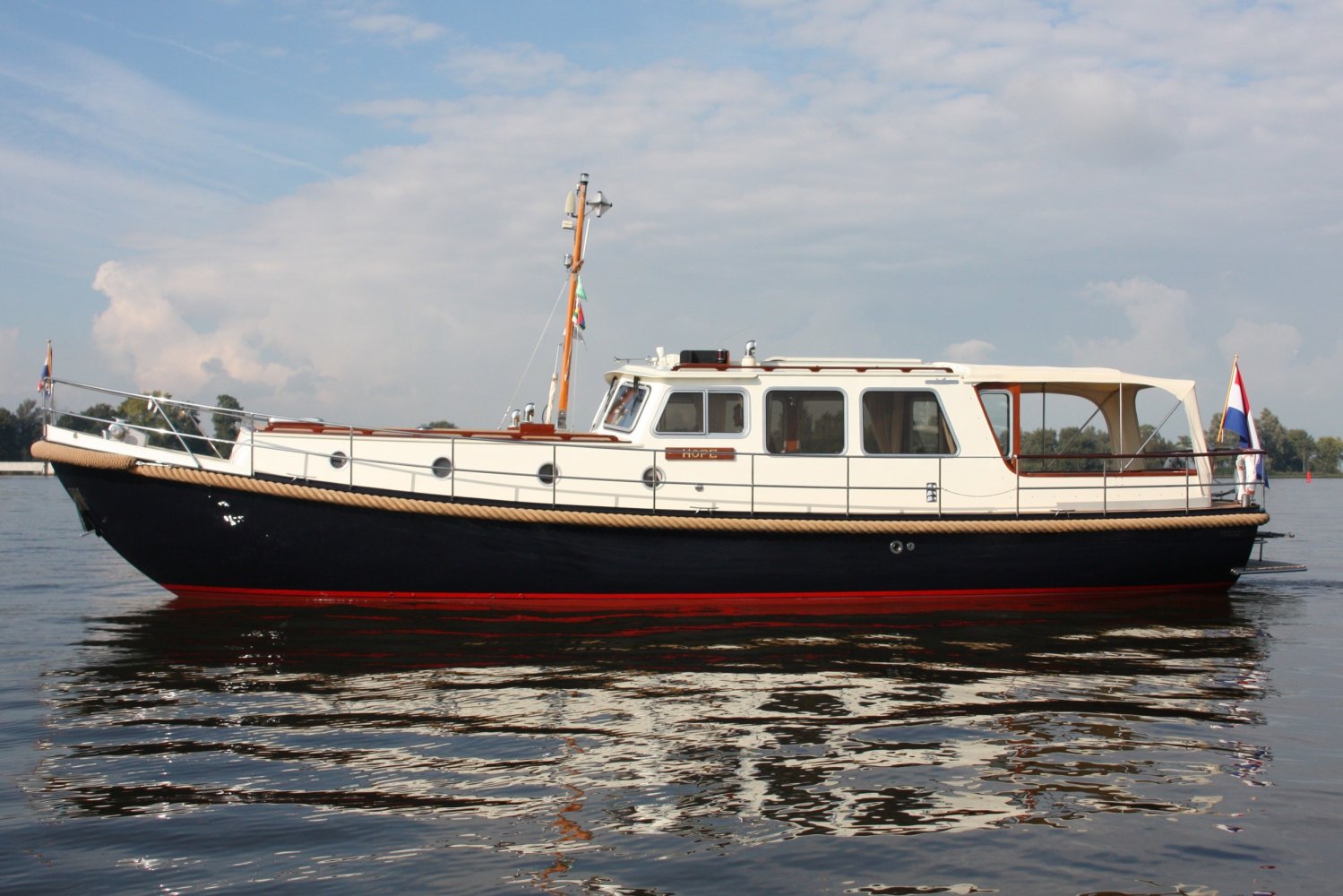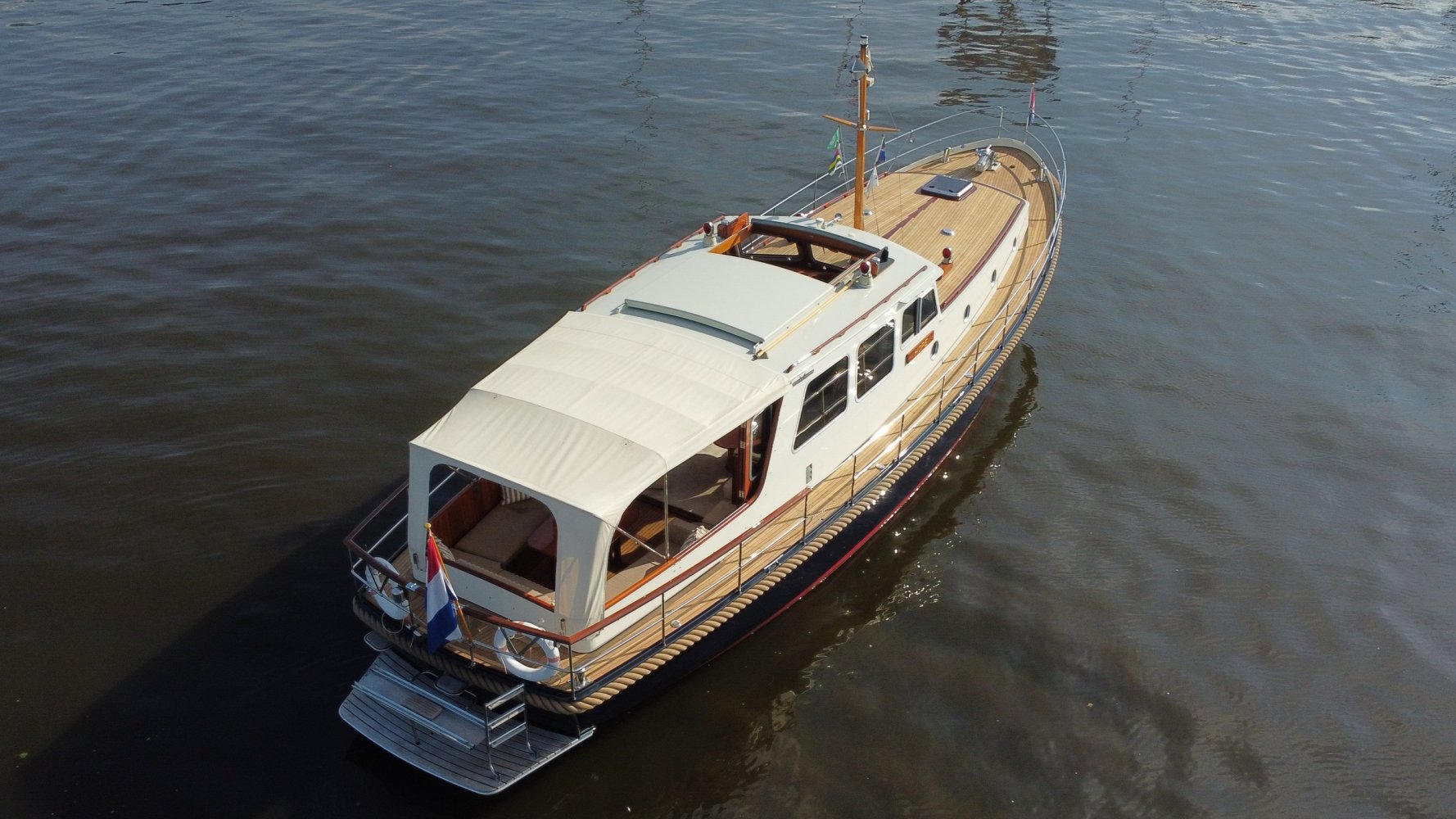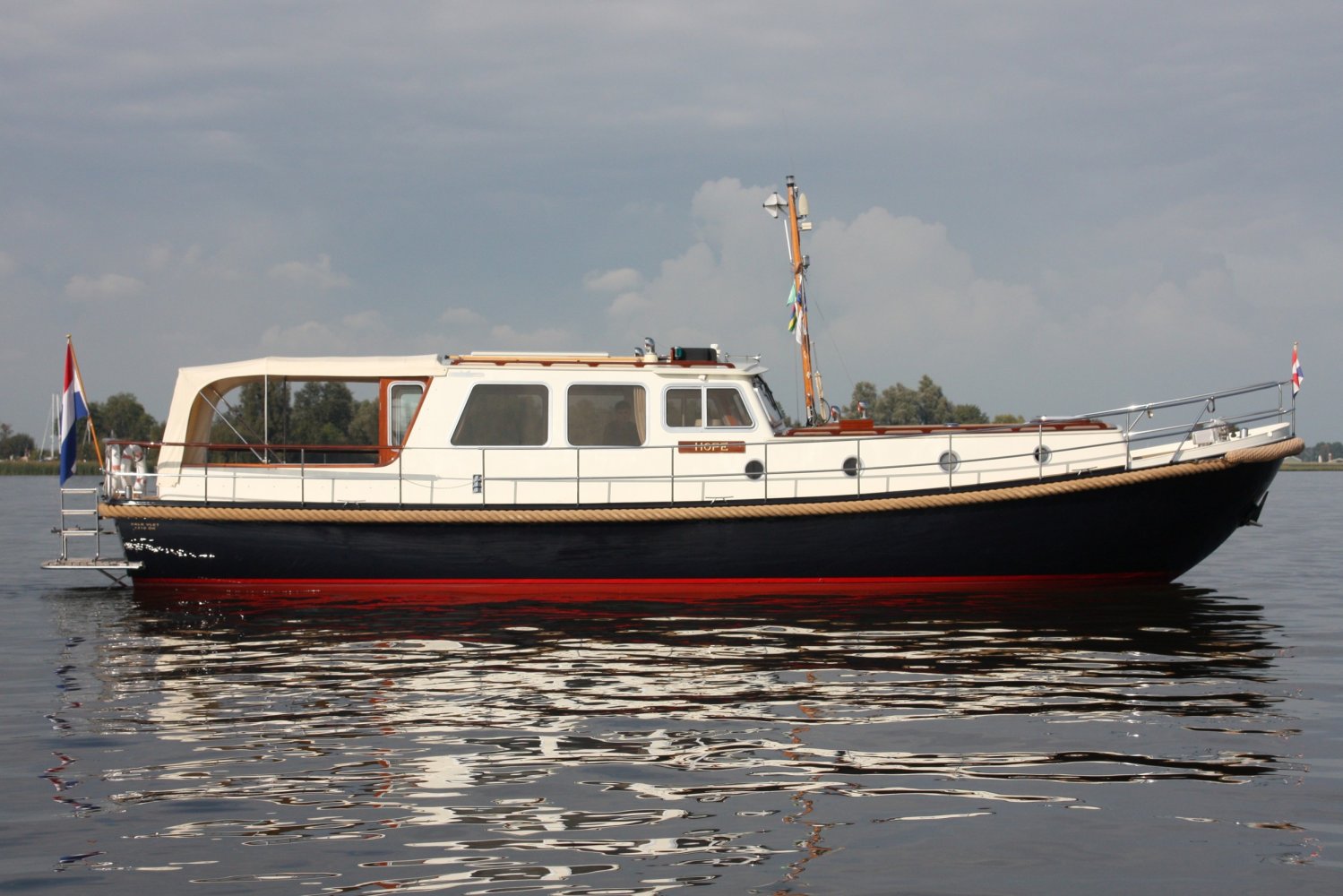 Die allerletzte jemals gebaute Valkvlet! Irgendetwas muss Philip Valk durch den Kopf gegangen sein, als er dieses Schiff an seine stolzen ersten Besitzer übergab. Damit endete auch eine lange Periode, Jahrzehnte, des traditionellen friesischen Yachtbaus! Die Valkvlet ist unter echten Kennern und Liebhabern ein Begriff. Hochwertig, immer runde Bilge und fast keine gleicht der anderen. Aber mit hohem Wiedererkennungswert. Es gibt auch einen Club von Valkvlet-Liebhabern, der sich regelmäßig zu Spaßveranstaltungen oder Segeltörns trifft. Wie dem auch sei, wir haben es hier mit einer Valkvlet 13.10 OK zu tun, die bis ins kleinste Detail original ist und auch sehr gut ausgestattet ist. So ist diese Valkvket 13.10 OK mit einem starken und sehr leisen Vetus-Deutz DT 66 Motor ausgestattet, der 170 PS leistet. Das Boot verfügt über proportionale Bug- und Heckstrahlruder (!), ein komplettes Set an Navigationsinstrumenten einschließlich Autopilot, ein Kamerasystem, einen Generator, Zentralheizung und Doppelverglasung, etc etc. Eine Badeplattform mit Badeleiter und Fahrradständer vervollständigen das Schiff.
