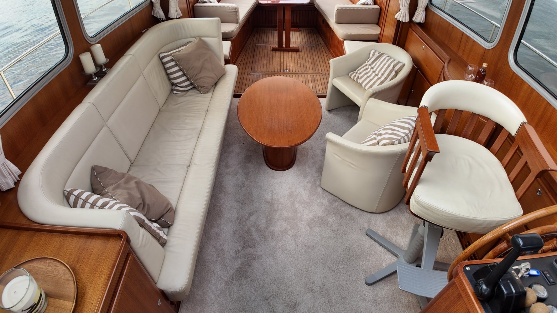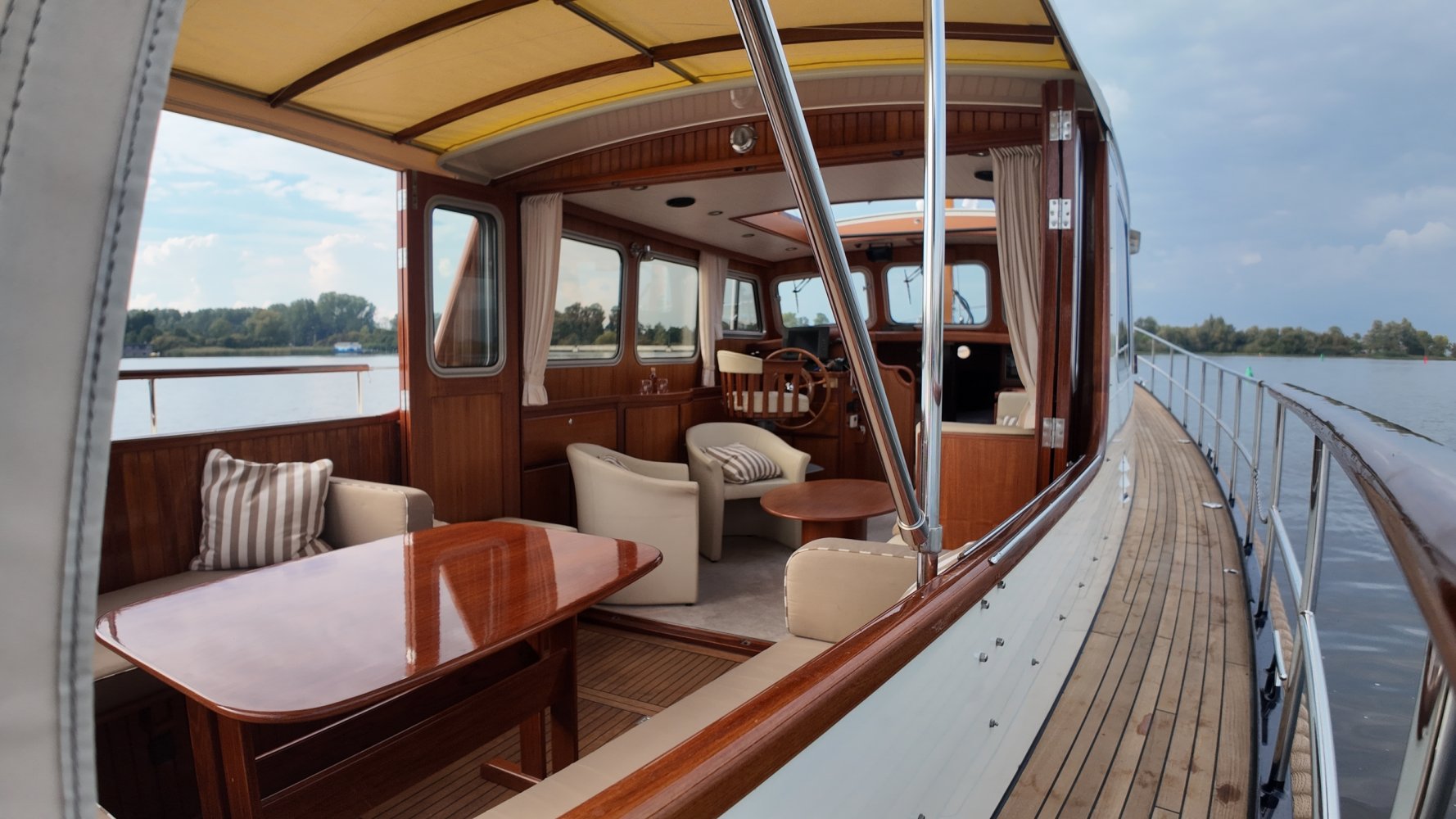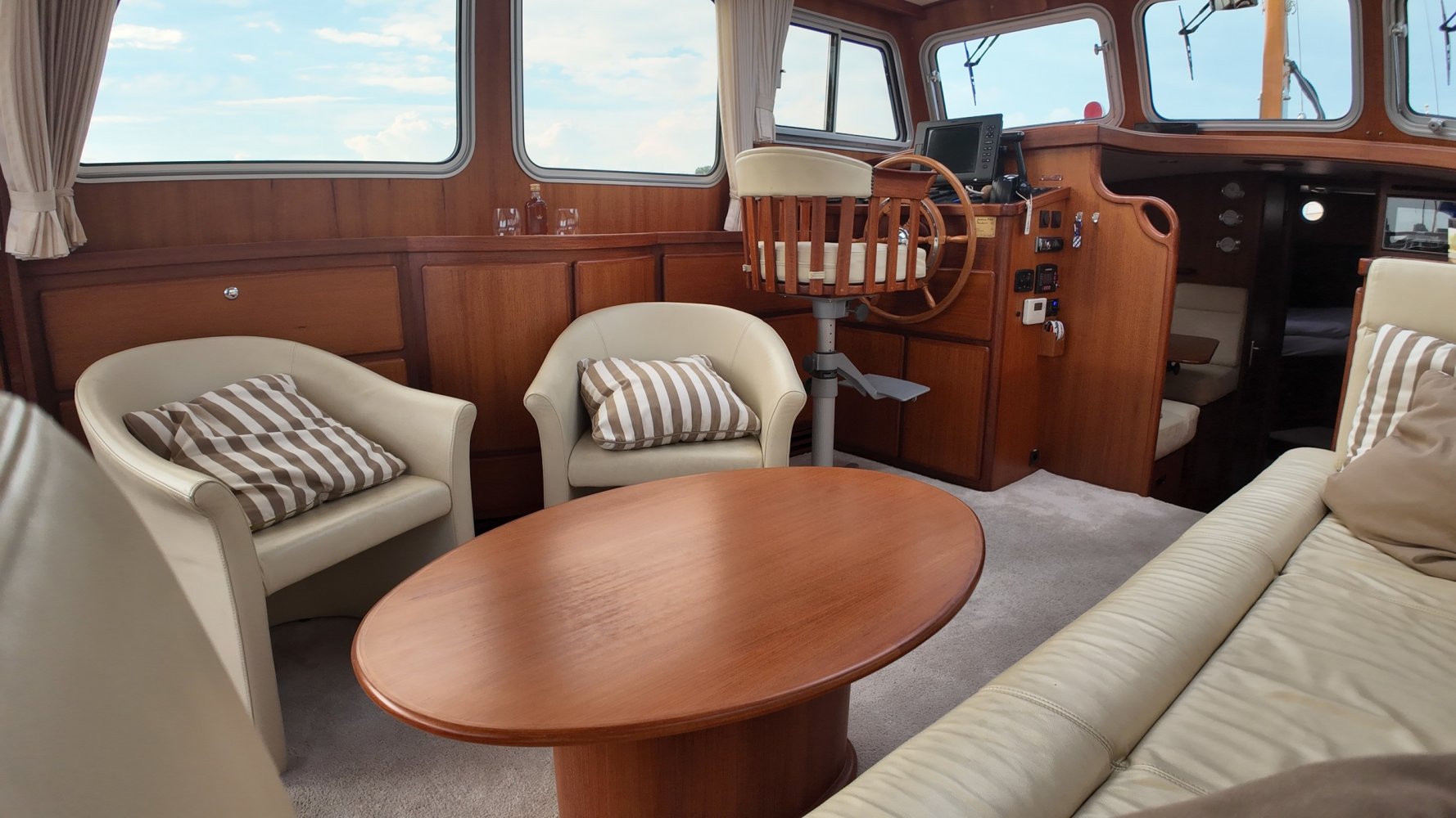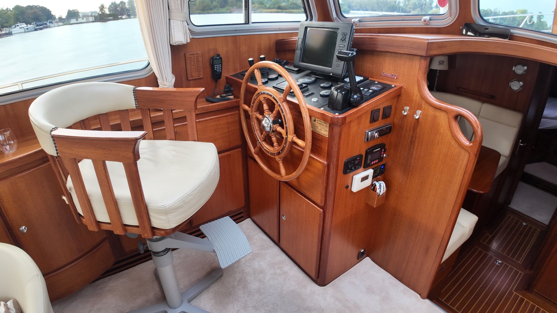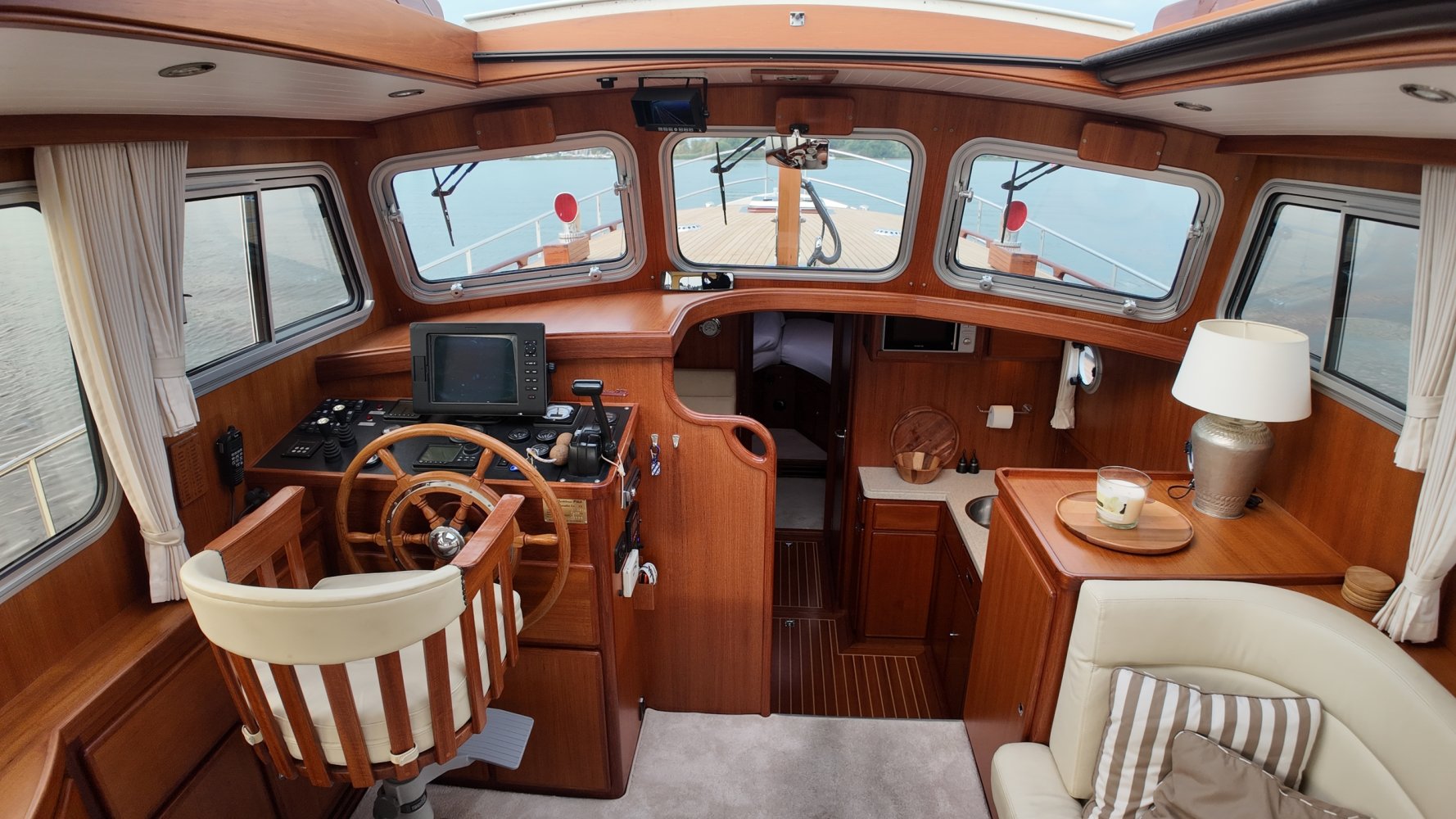 Edelstahl, rund um das Cockpit mit Teakholz verkleidet