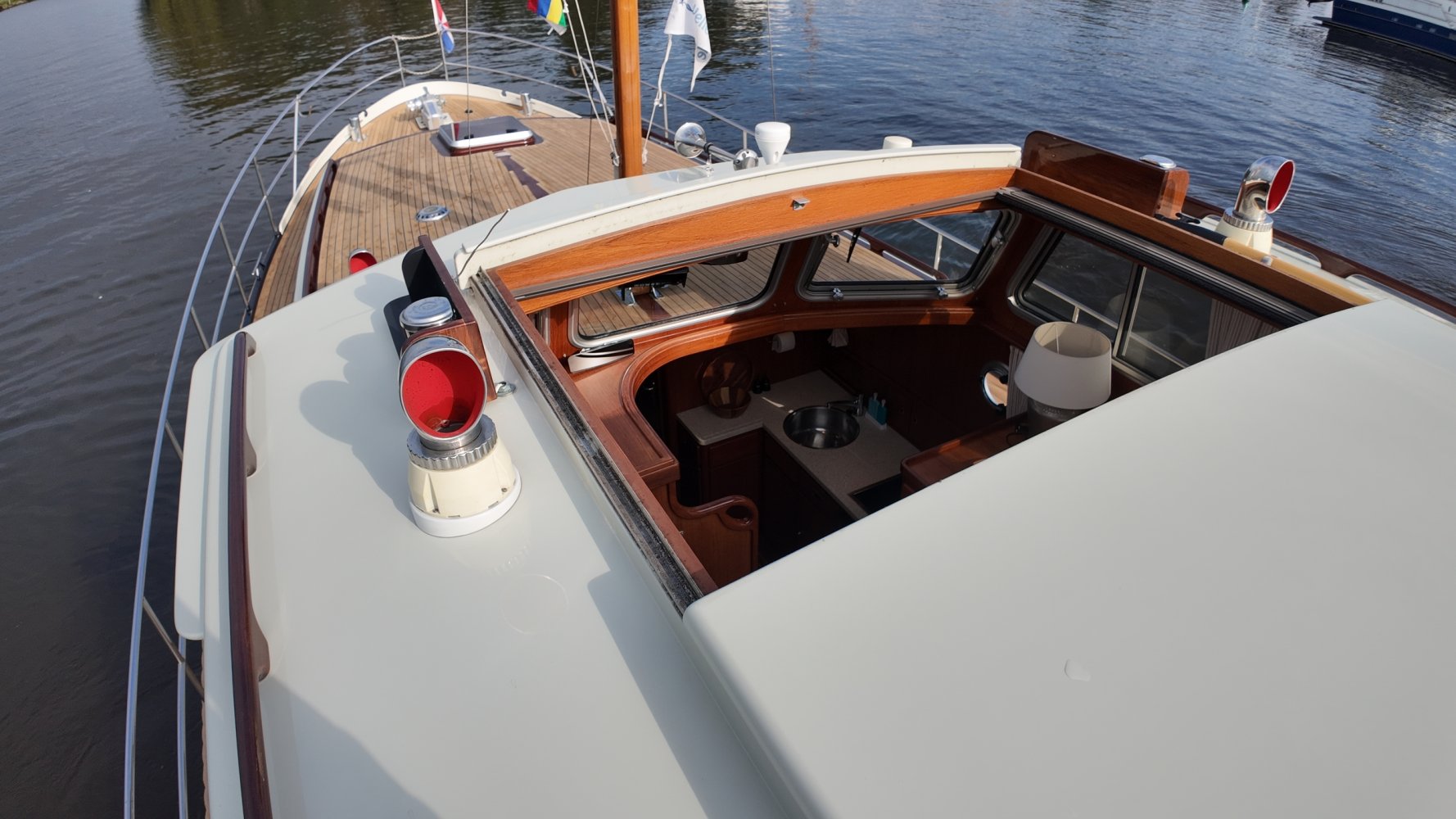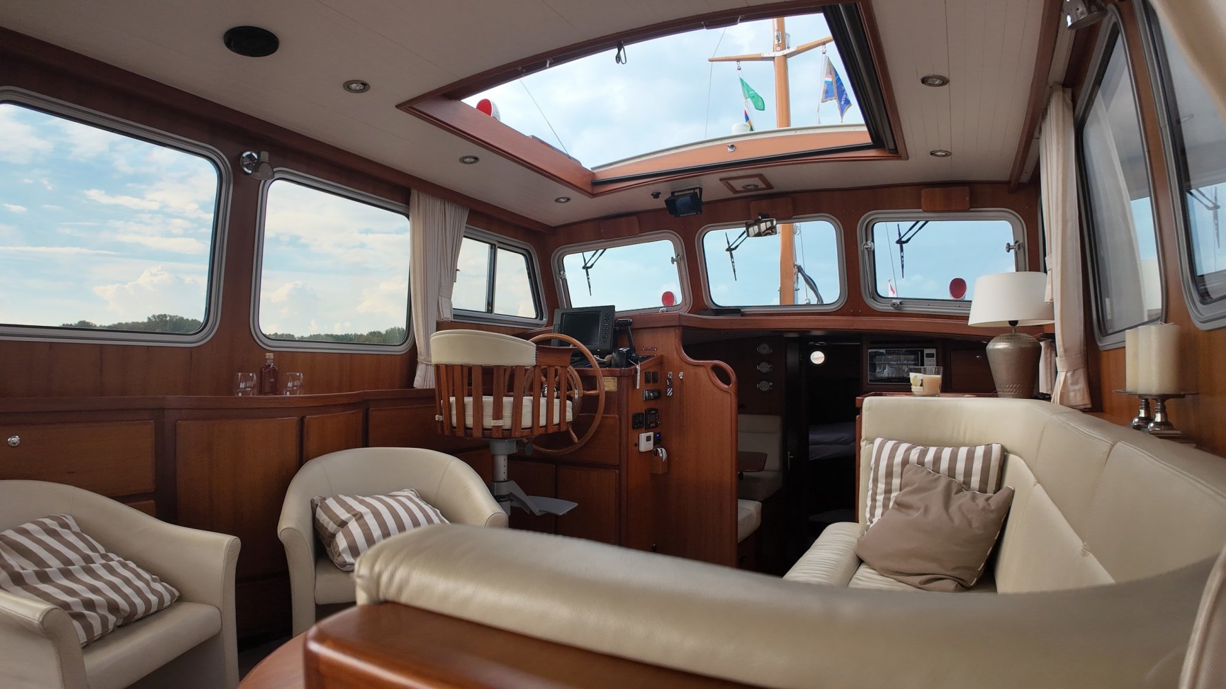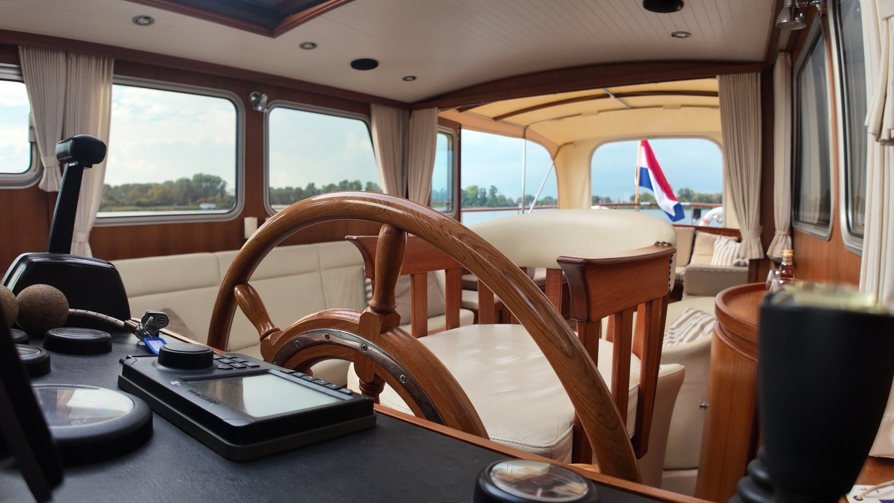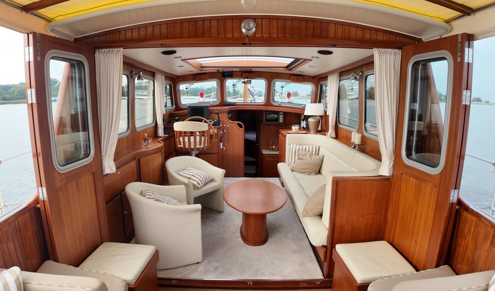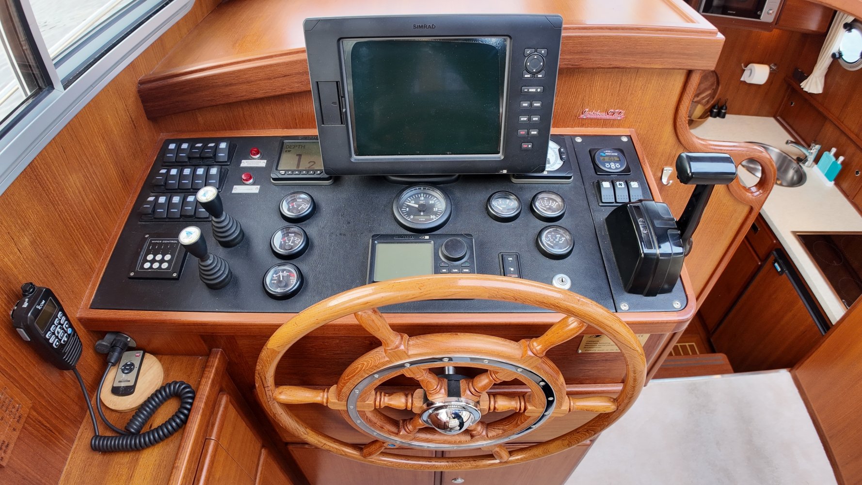 Edelstahl, rund um das Cockpit mit Teakholz verkleidet