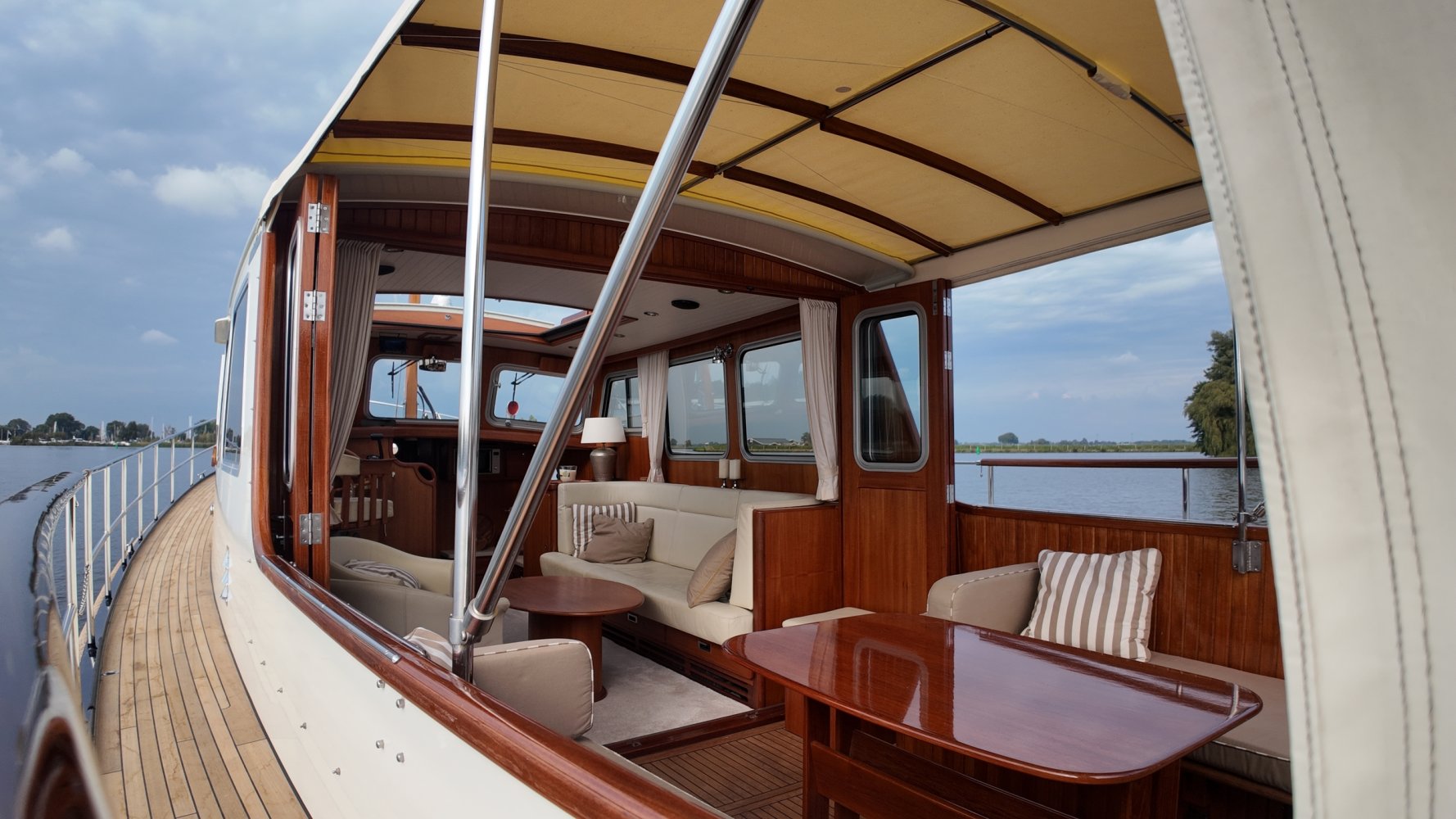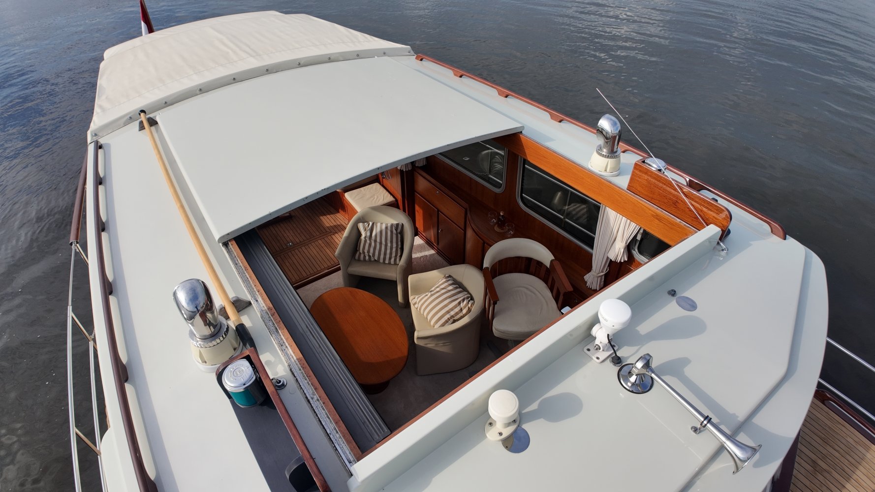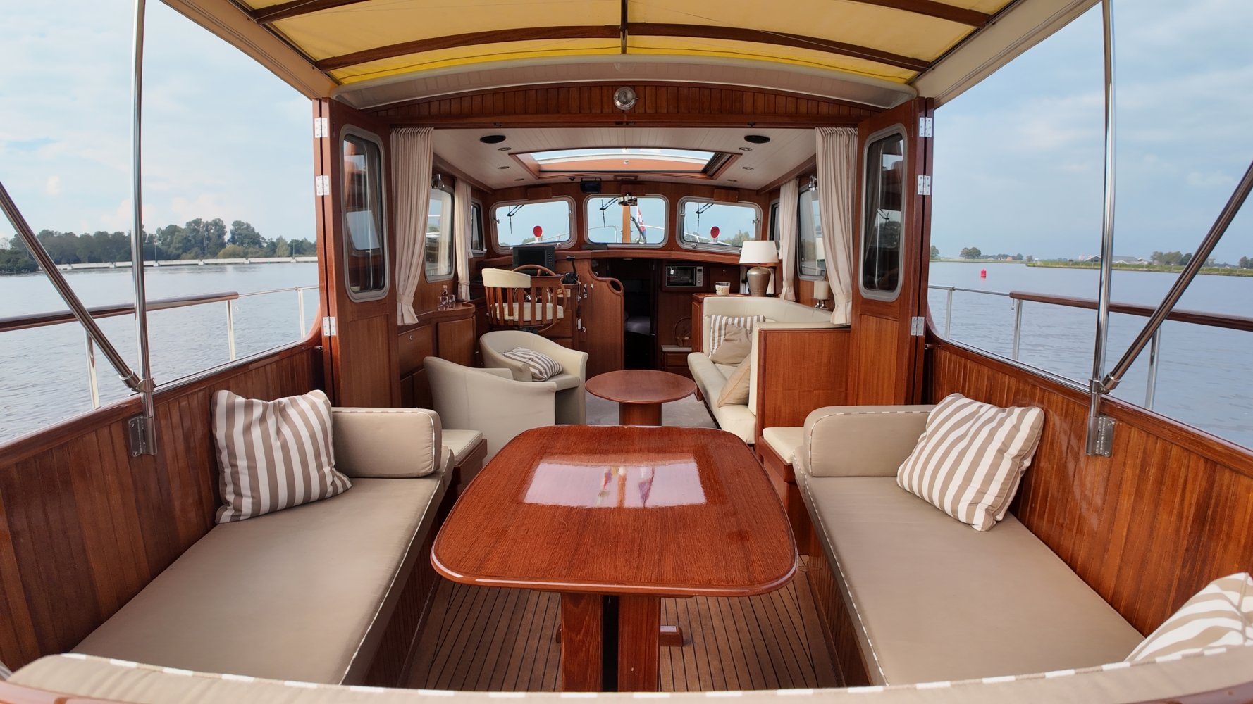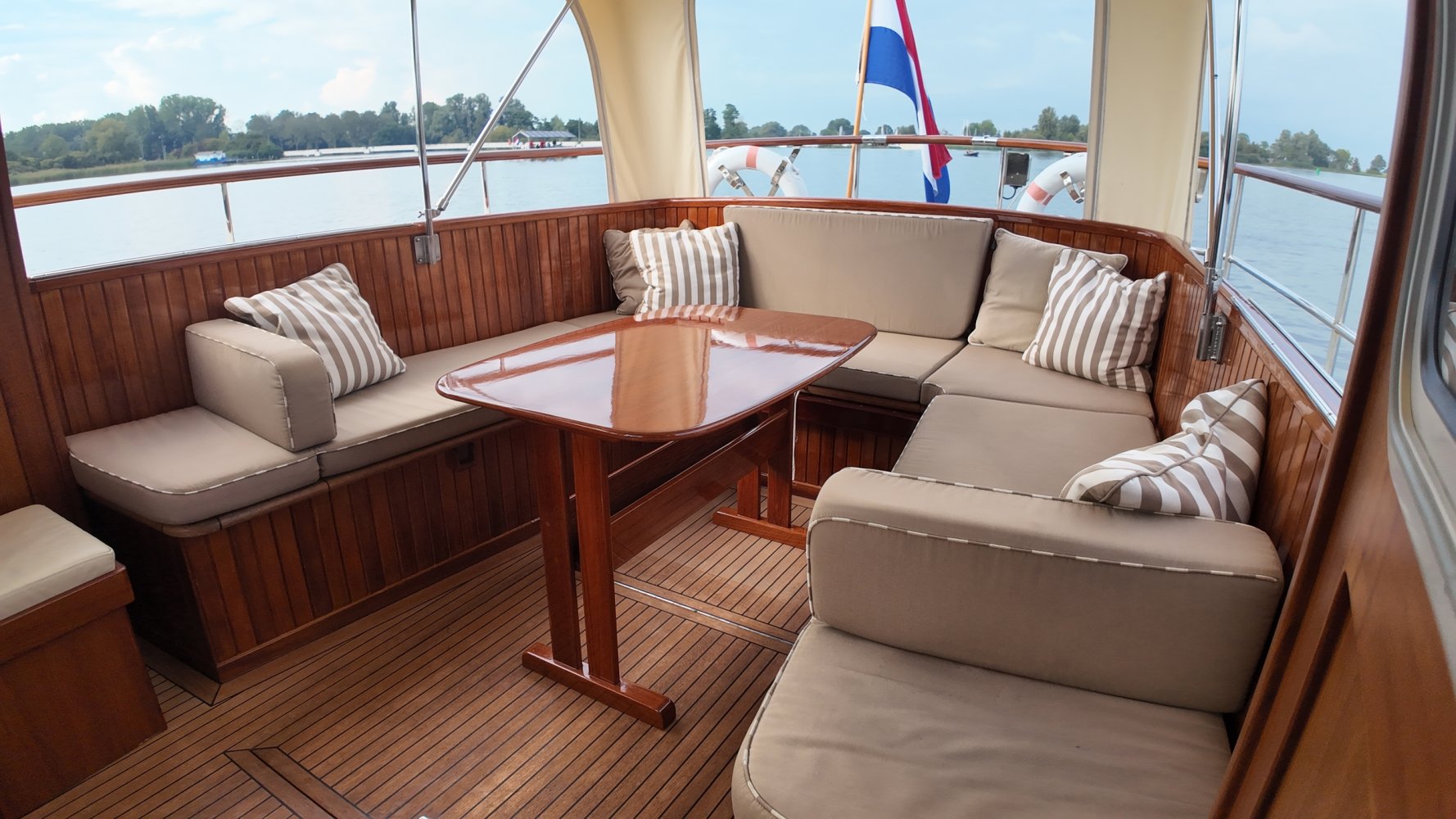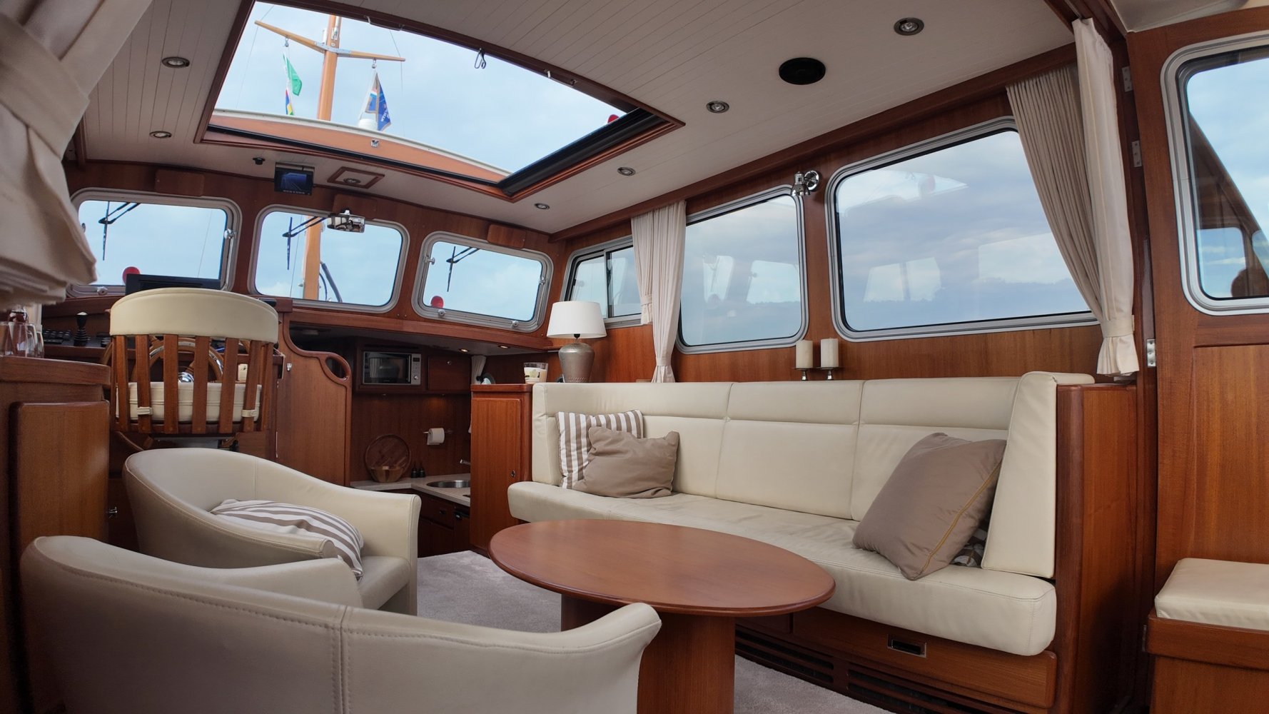 Edelstahl, rund um das Cockpit mit Teakholz verkleidet