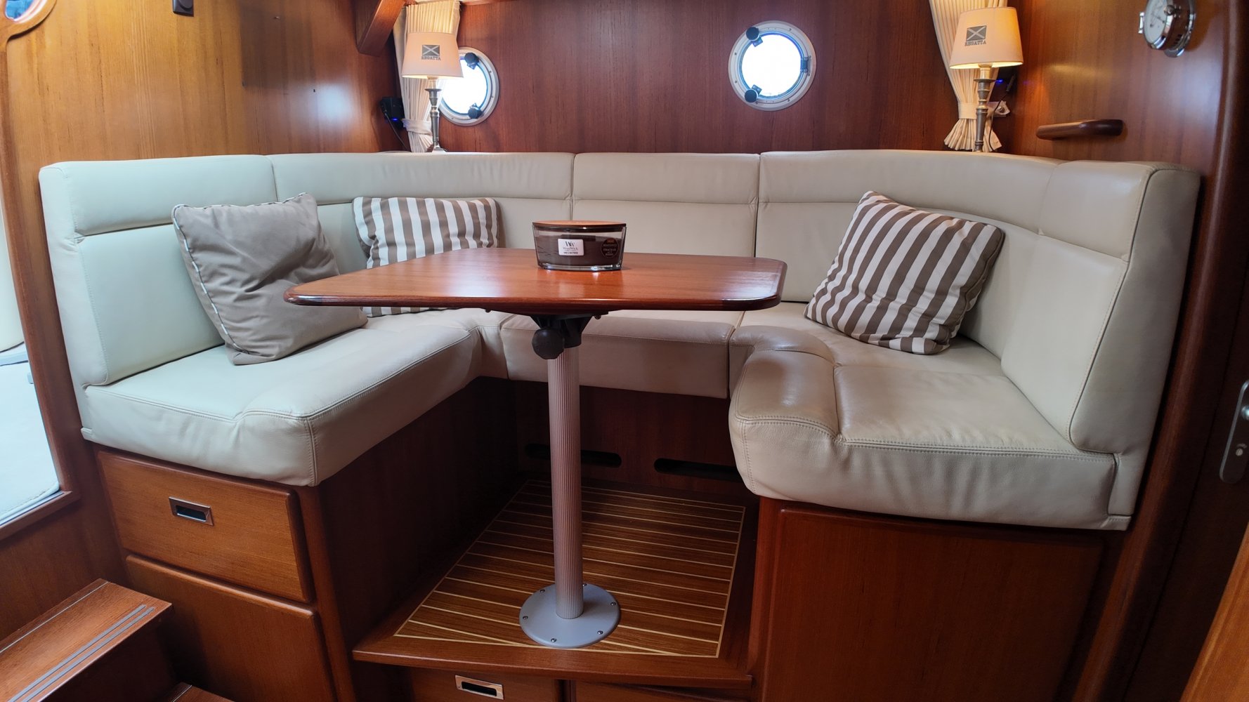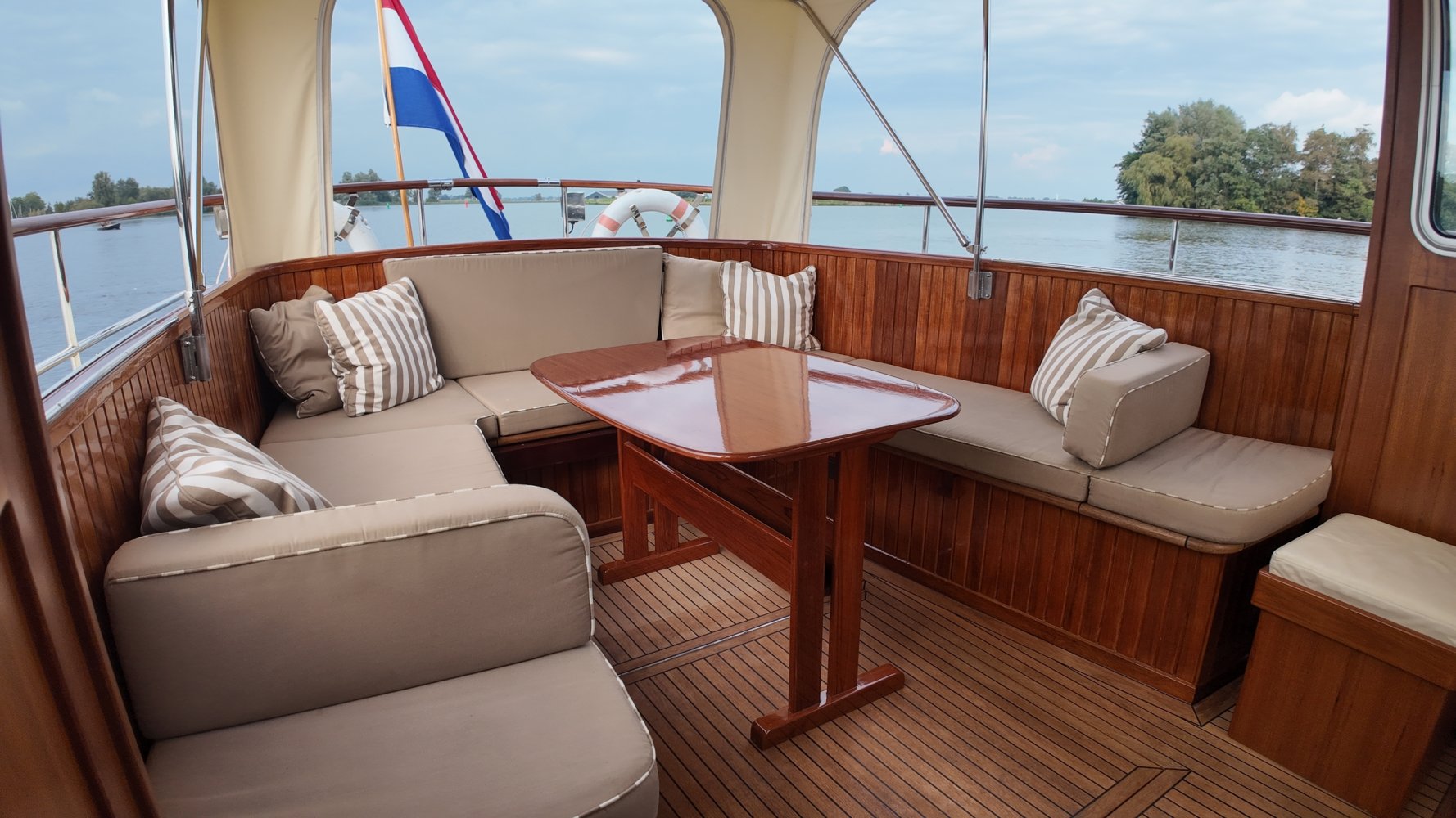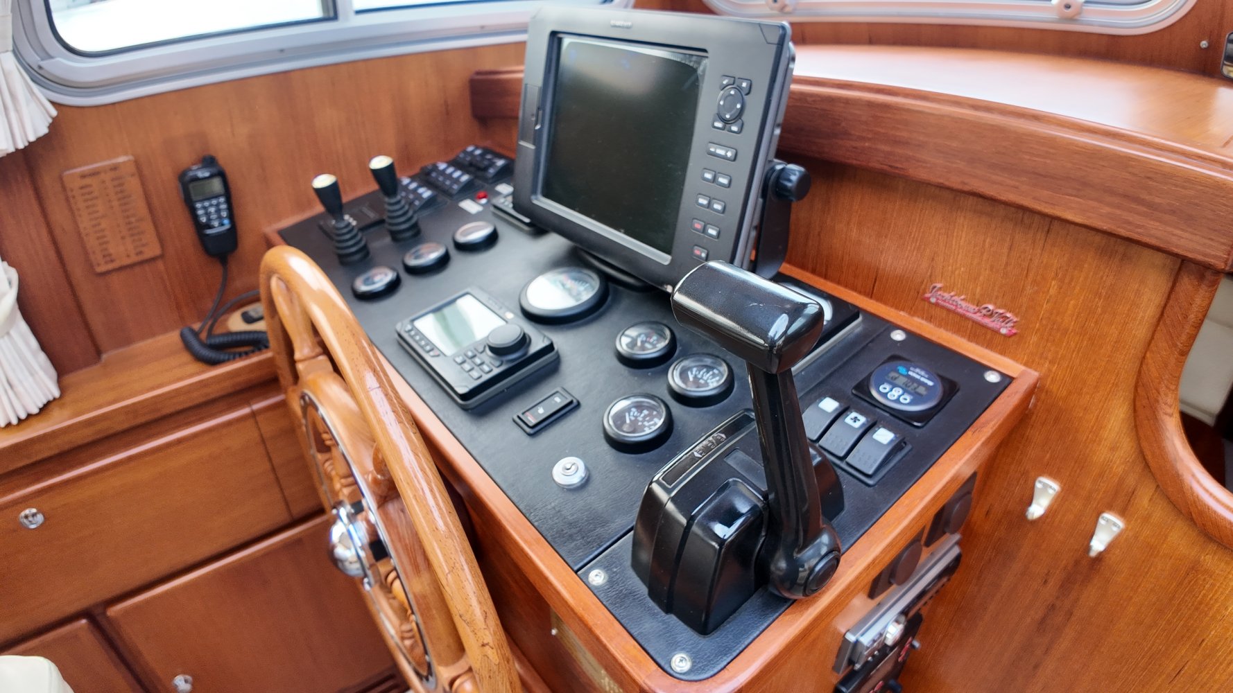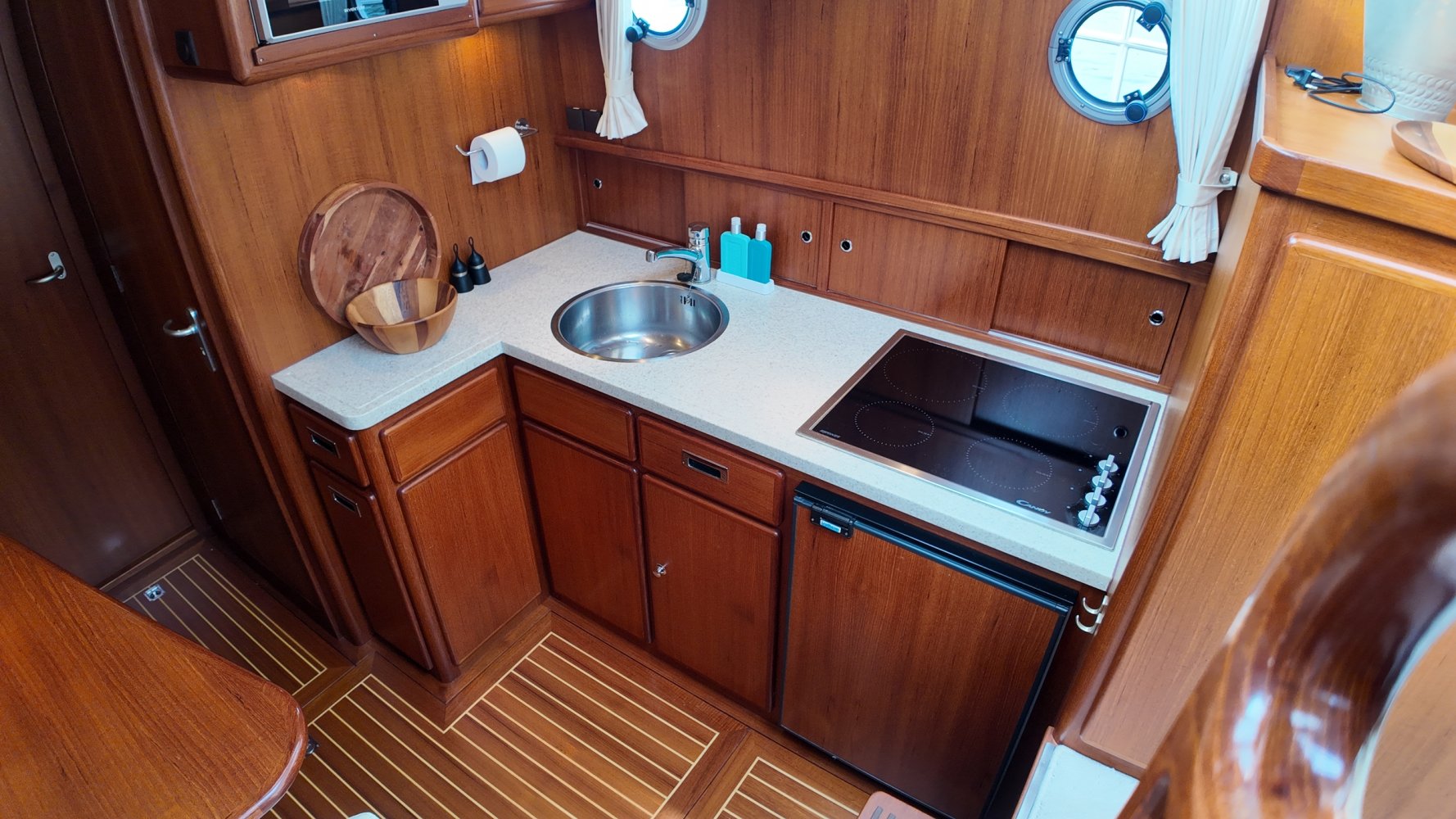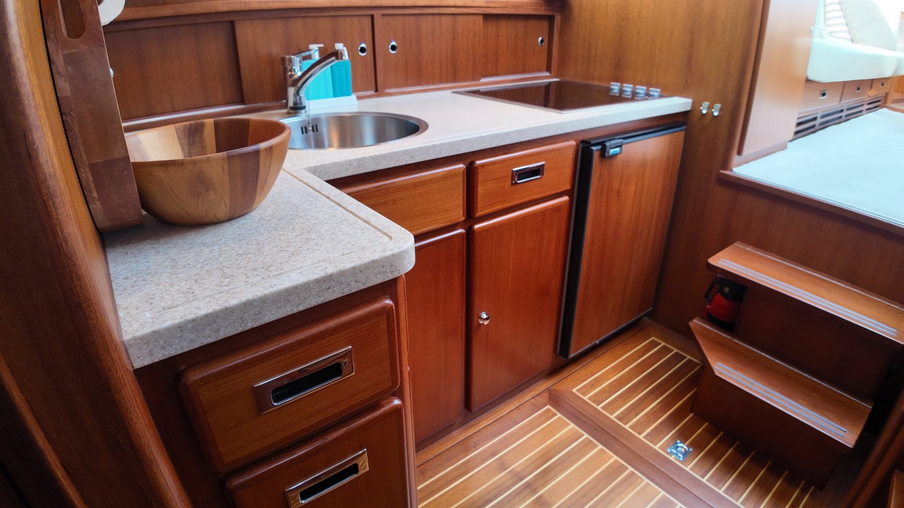 Edelstahl, rund um das Cockpit mit Teakholz verkleidet