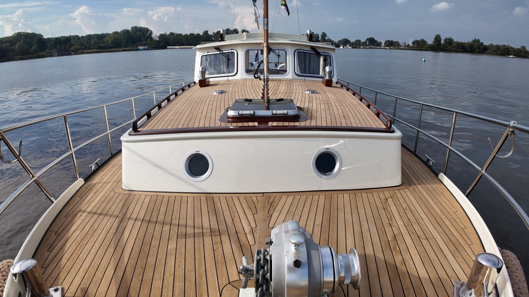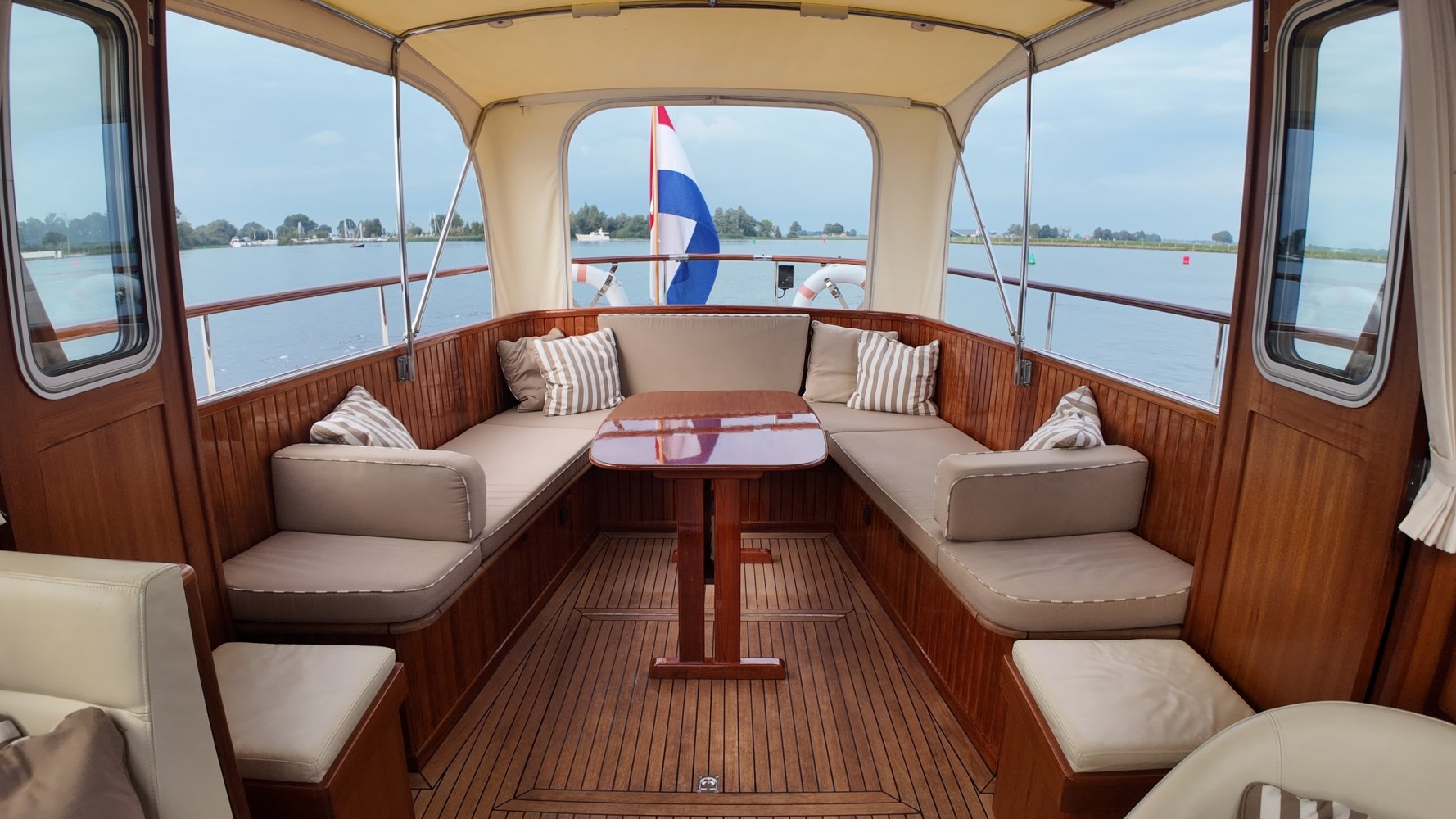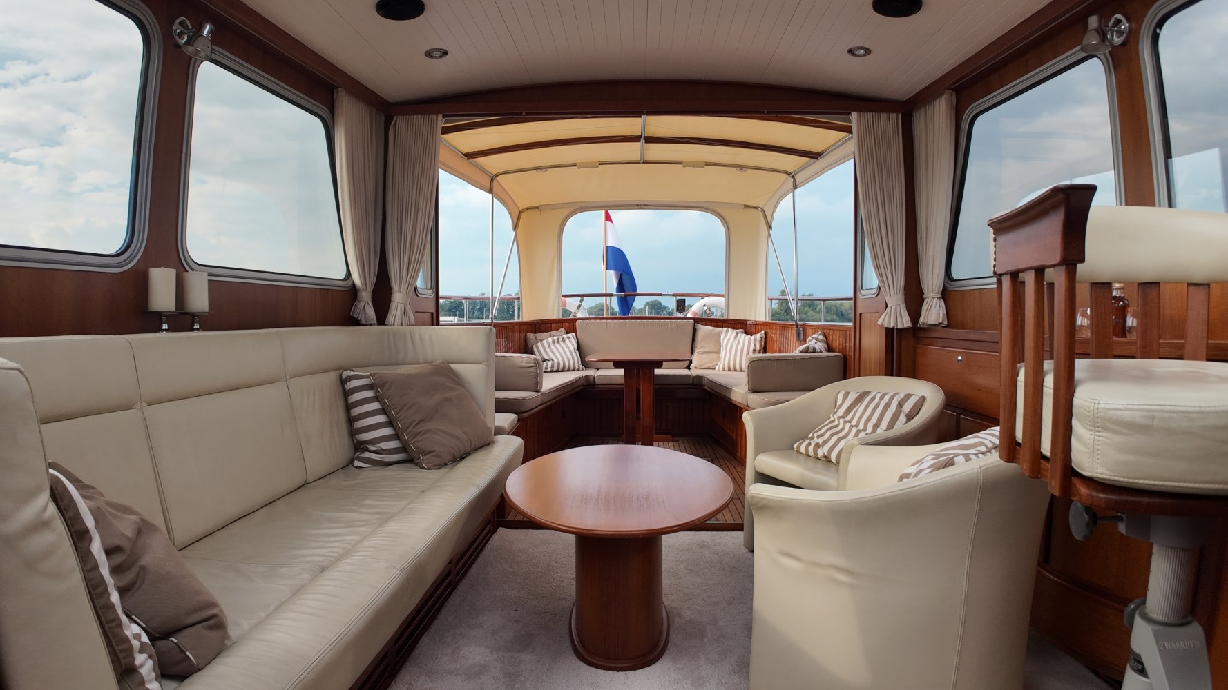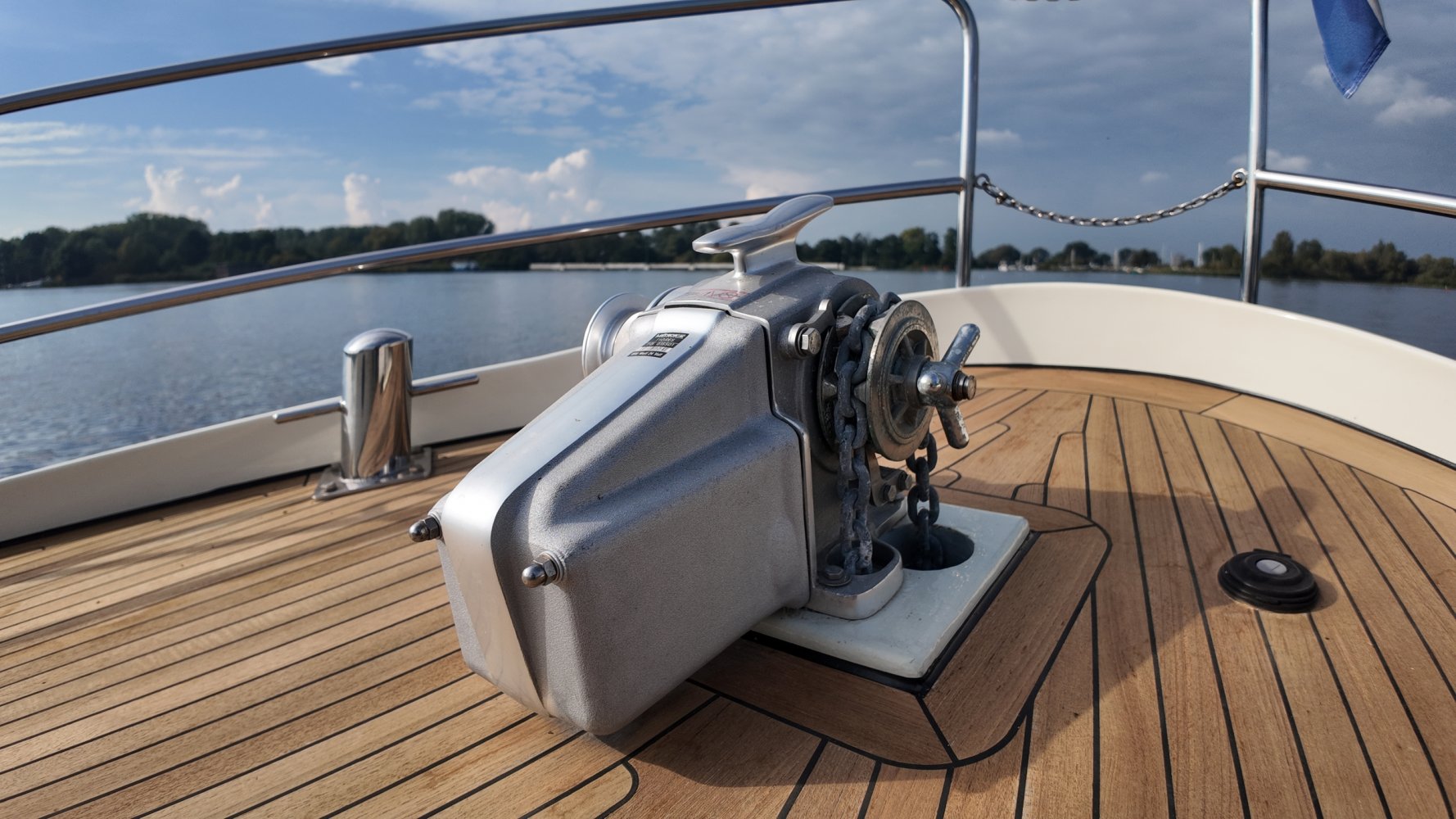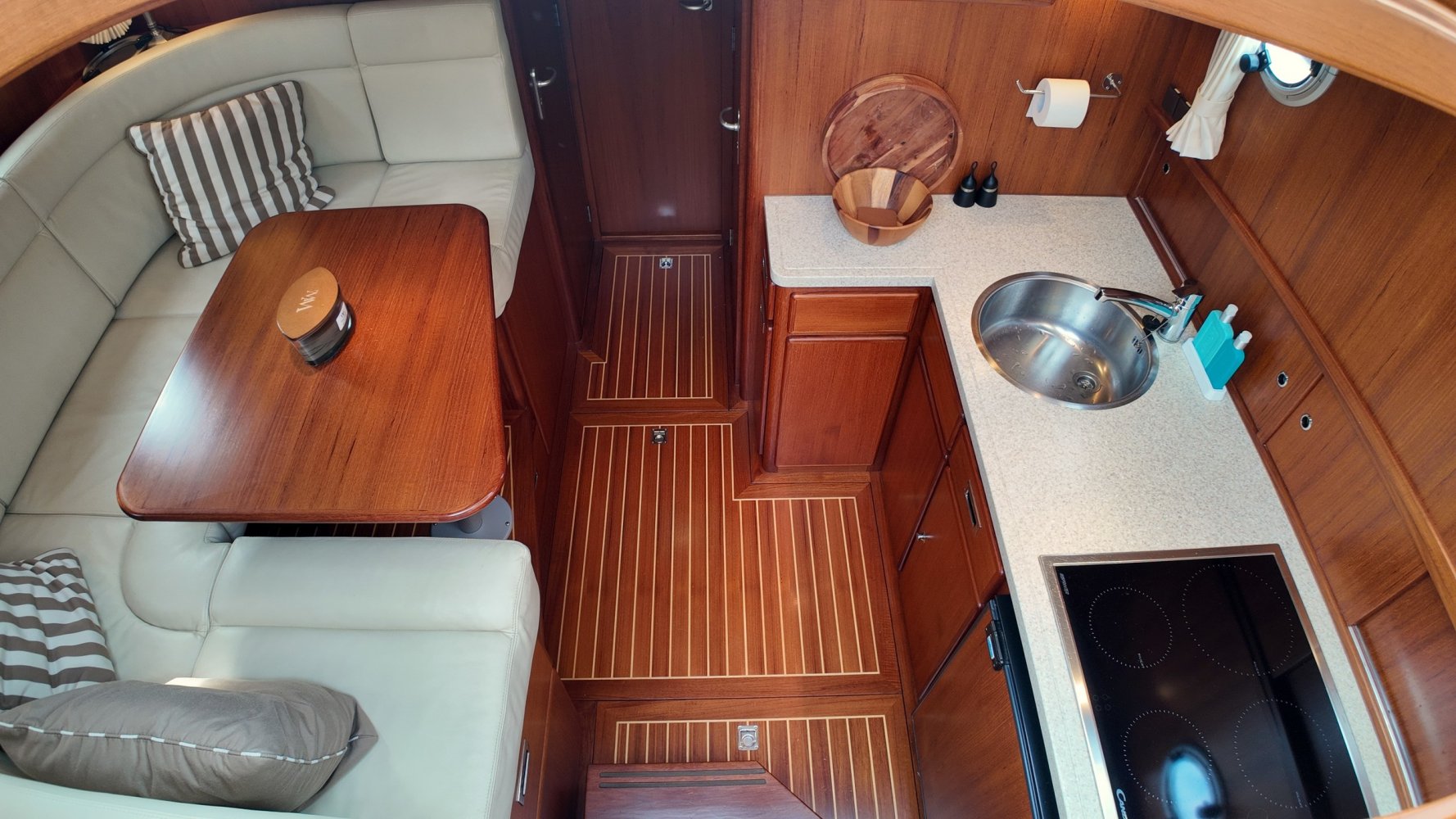 Edelstahl, rund um das Cockpit mit Teakholz verkleidet