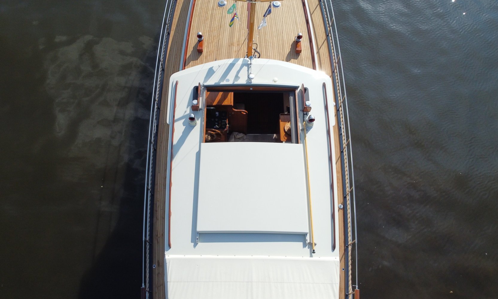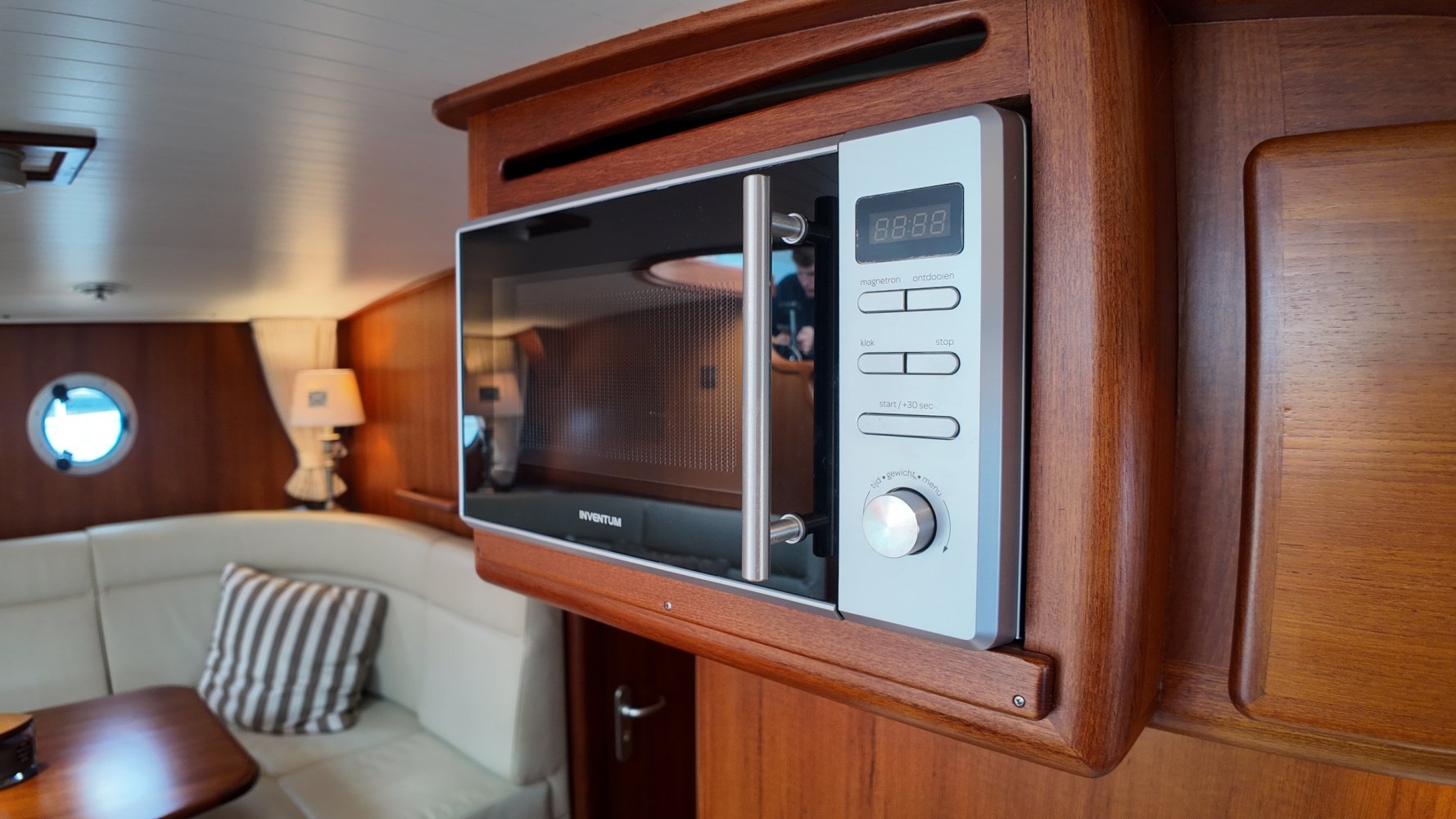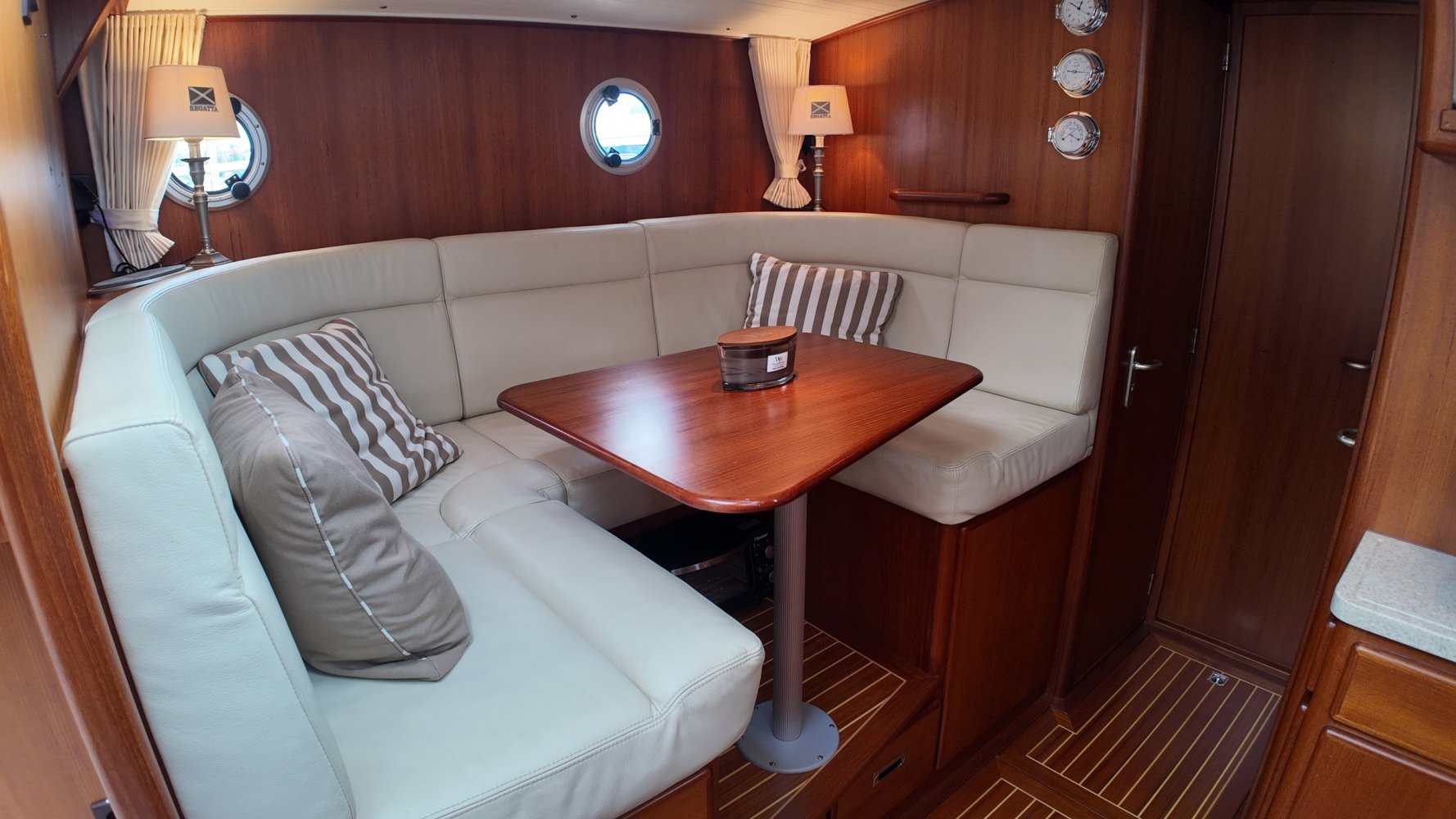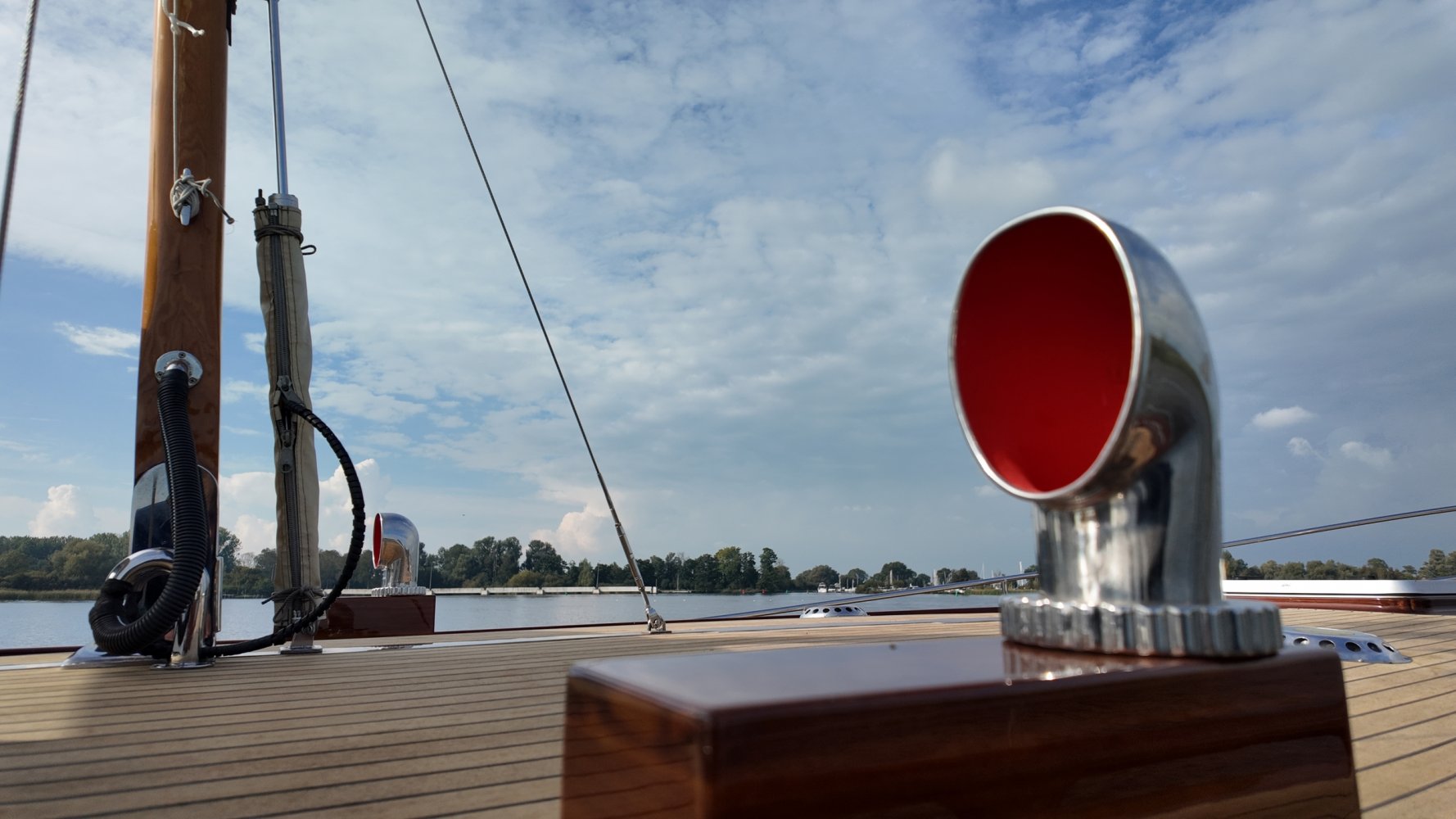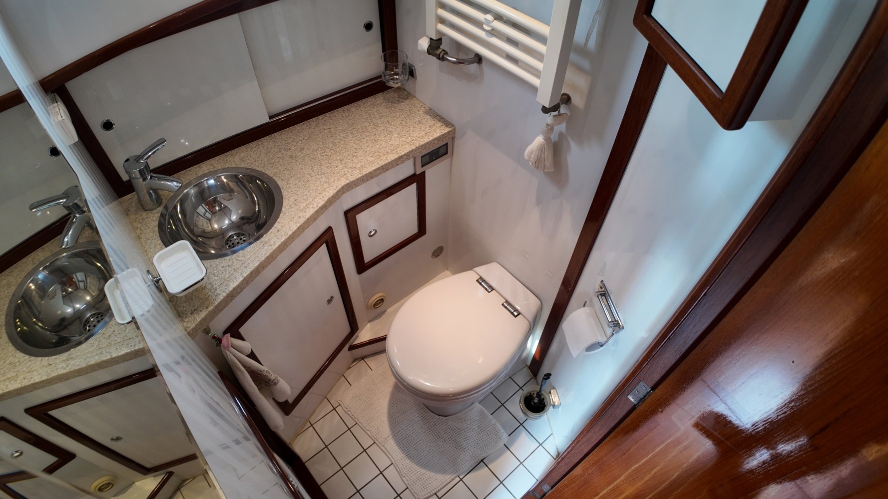 Edelstahl, rund um das Cockpit mit Teakholz verkleidet