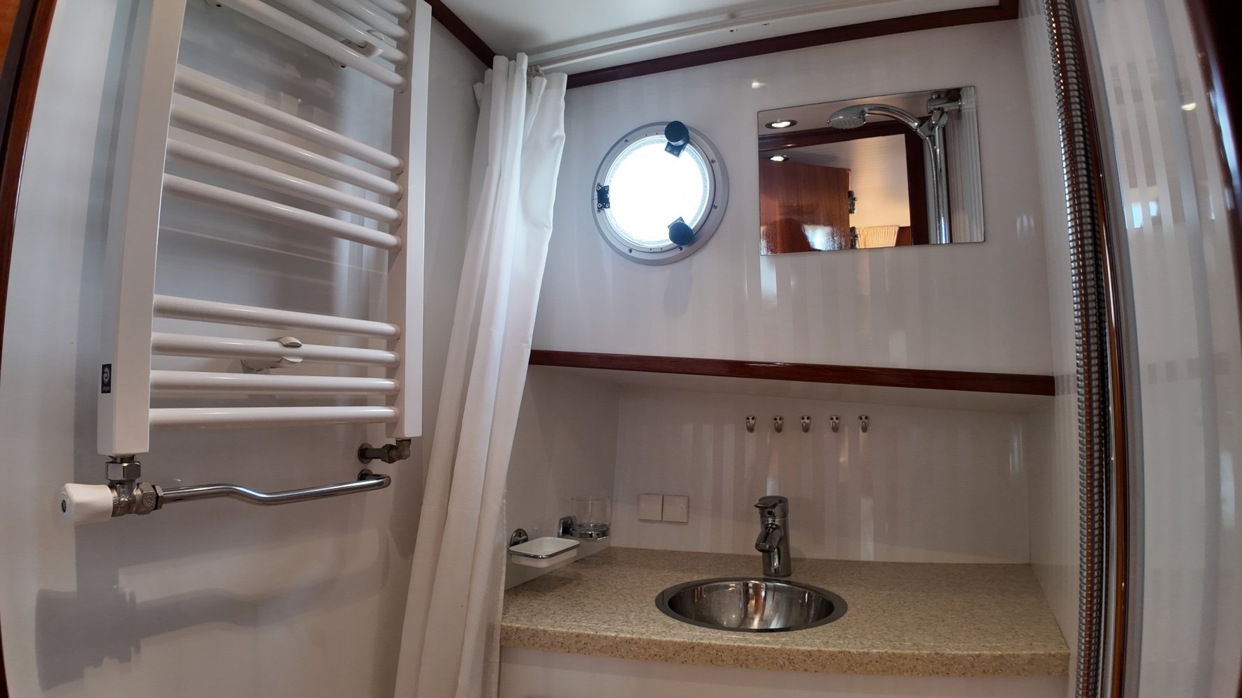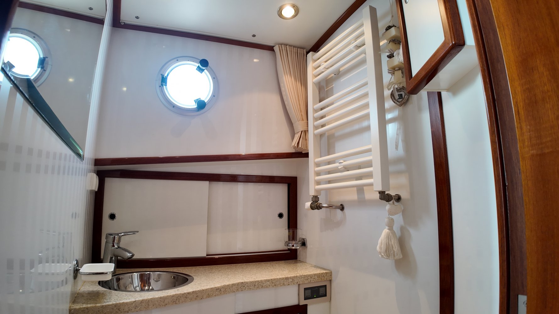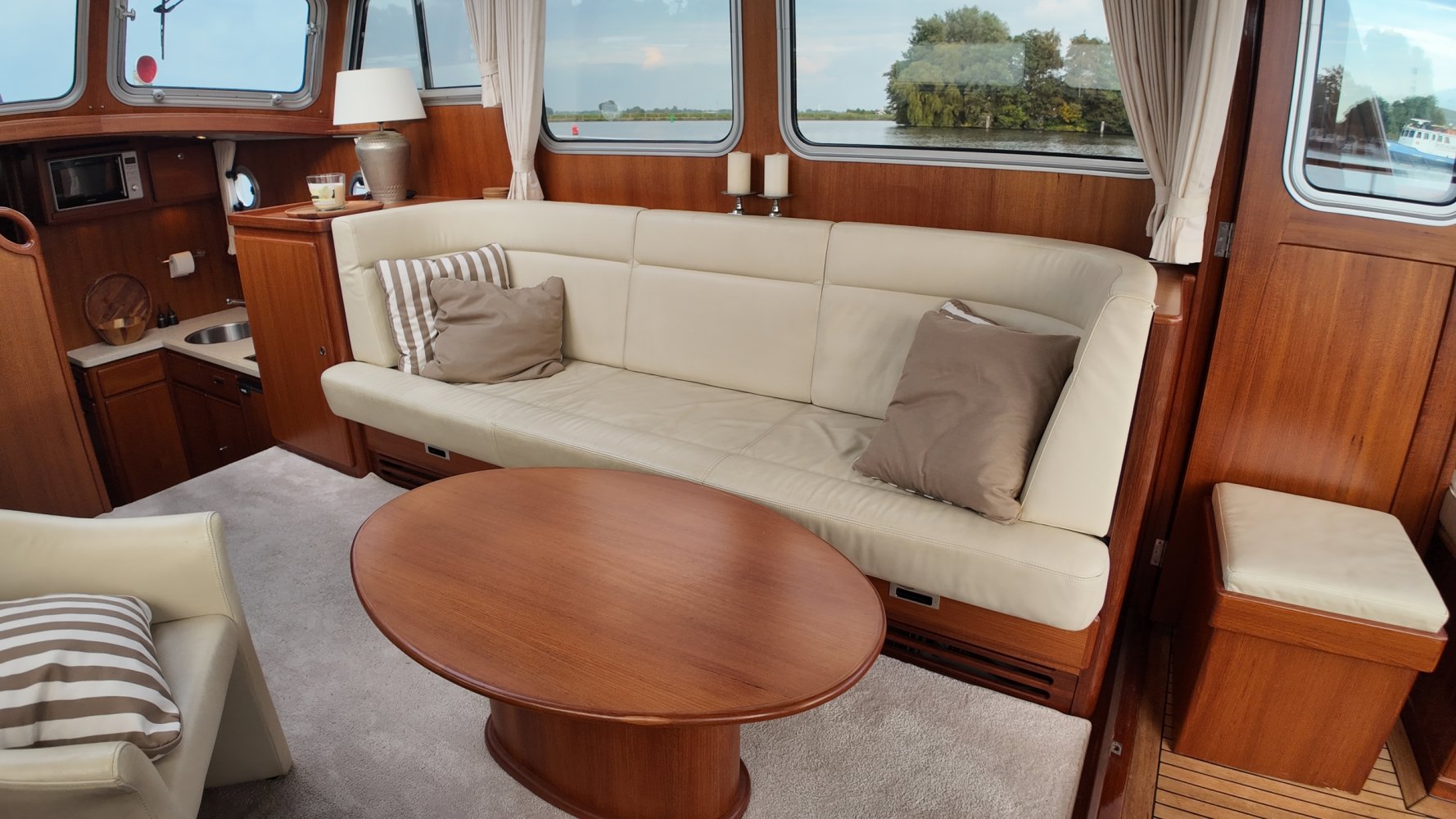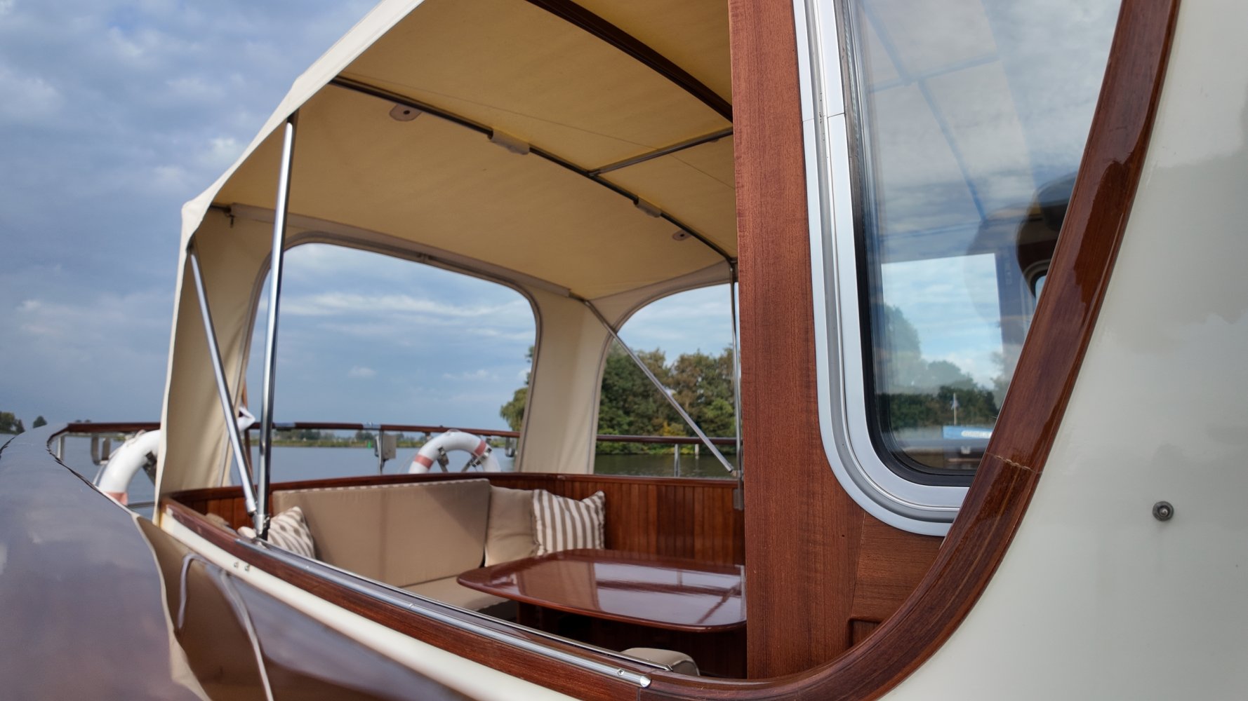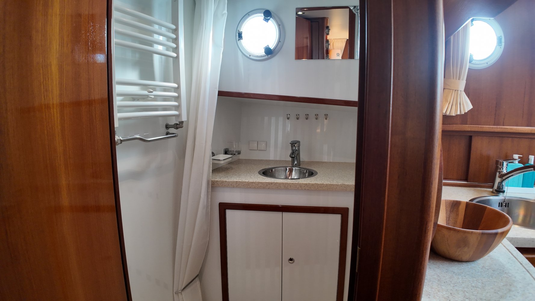 Edelstahl, rund um das Cockpit mit Teakholz verkleidet