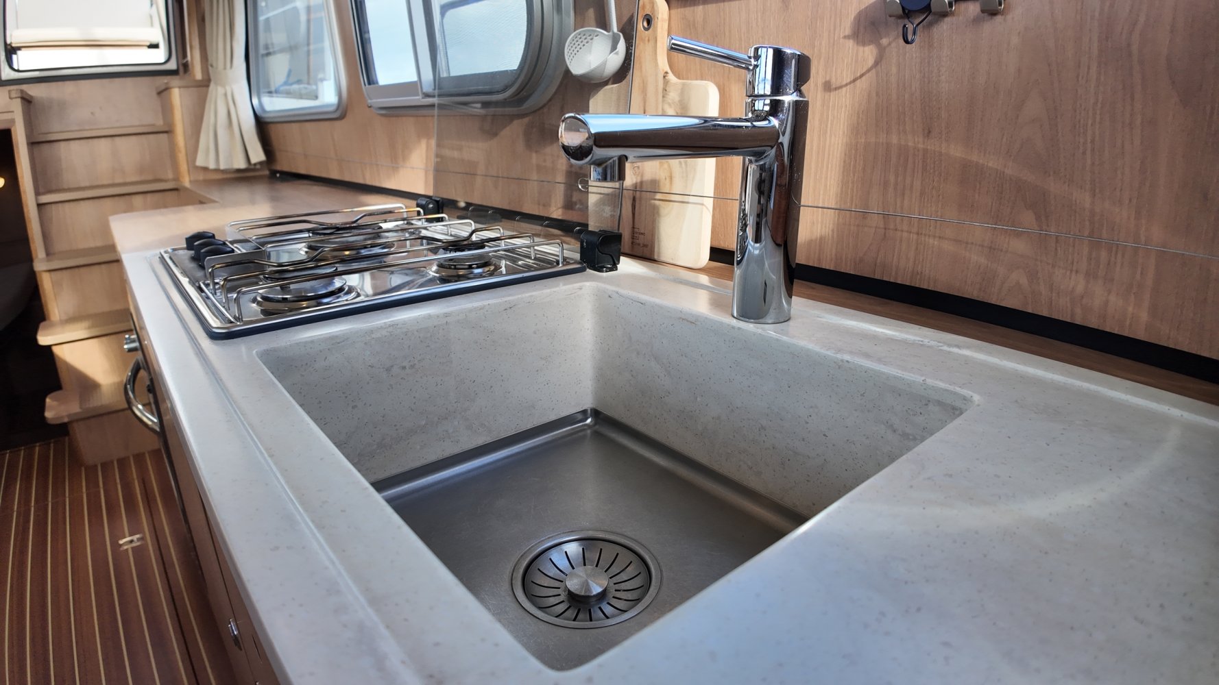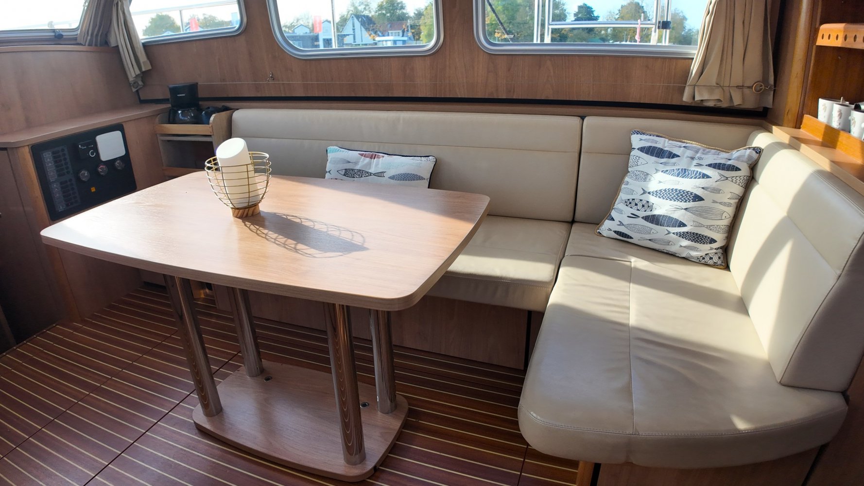 Der Salon bietet eine schöne Küche, die mit einem Gasherd mit drei Flammen, einer Spüle, einem Ofen und einem Kühlschrank ausgestattet ist. Hier finden Sie auch die Salonsitzgruppe. Das gesamte Schiff ist mit vielen Stauschränken und Schubladen ausgestattet. So können Sie dieses Boot trotz seiner kompakten Größe sauber und aufgeräumt halten.