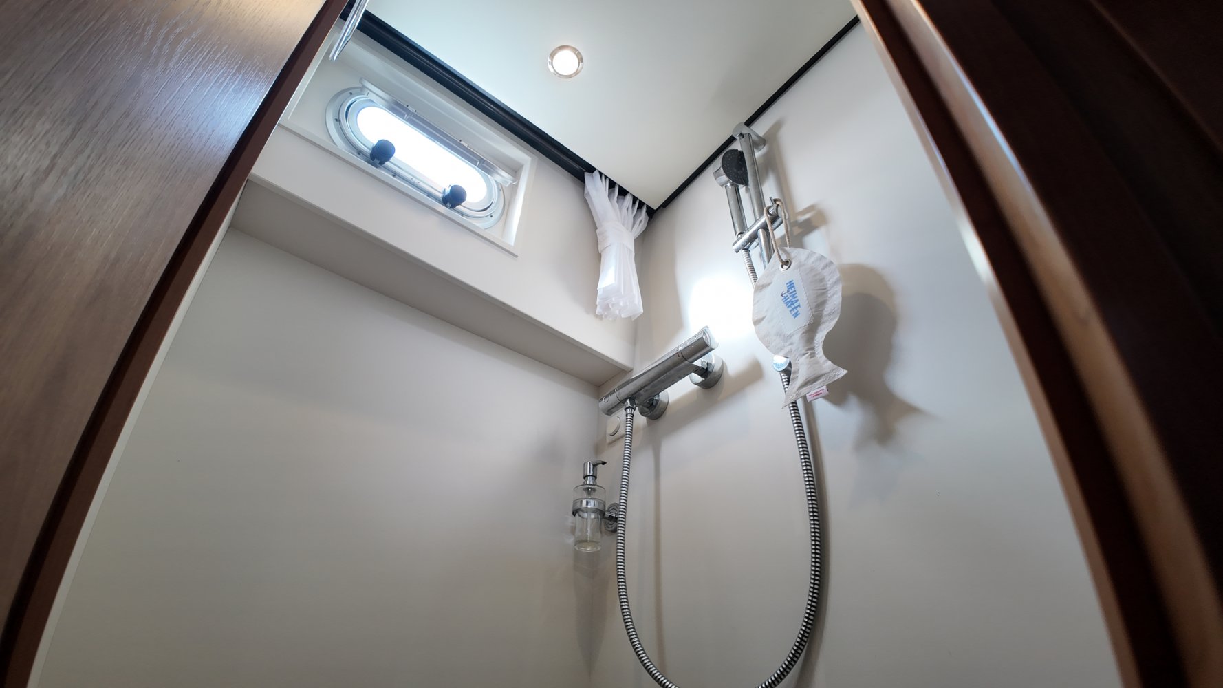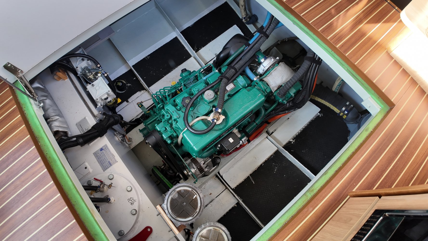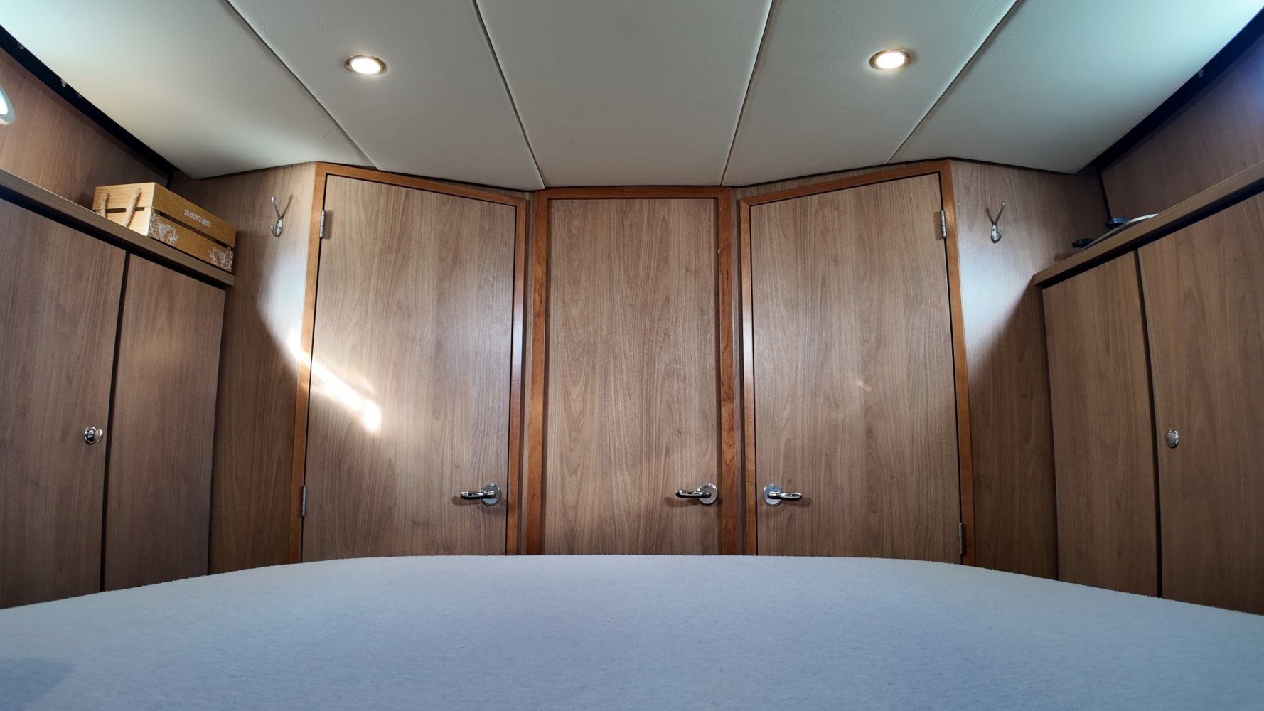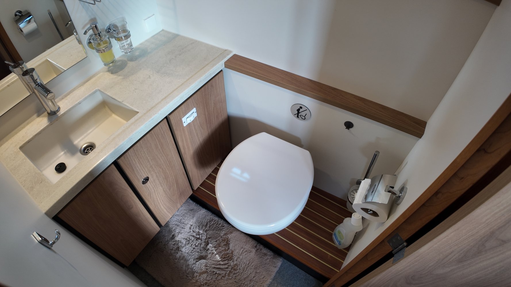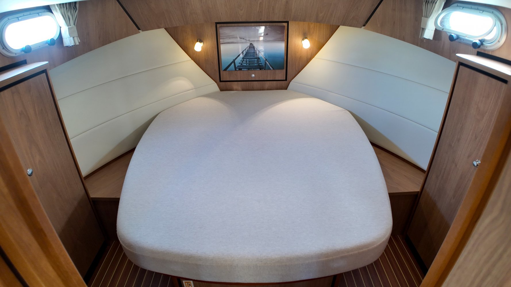 Die Vorschiffskabine hat ein freistehendes Doppelbett, die Nasszelle befindet sich an der Steuerbordseite und die Toilette an der Backbordseite.